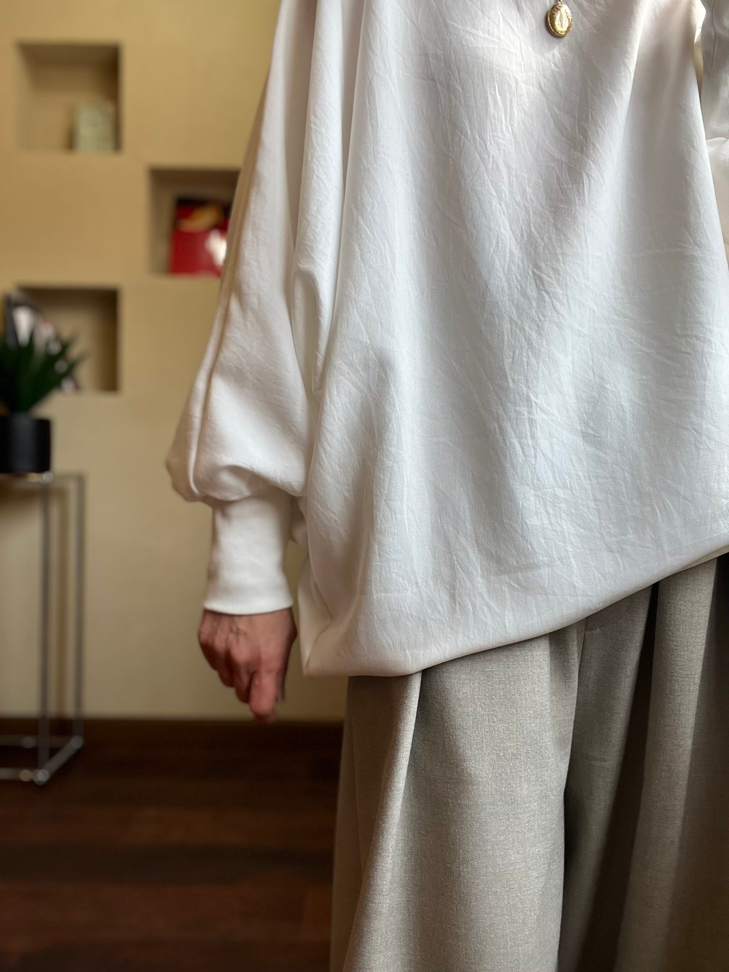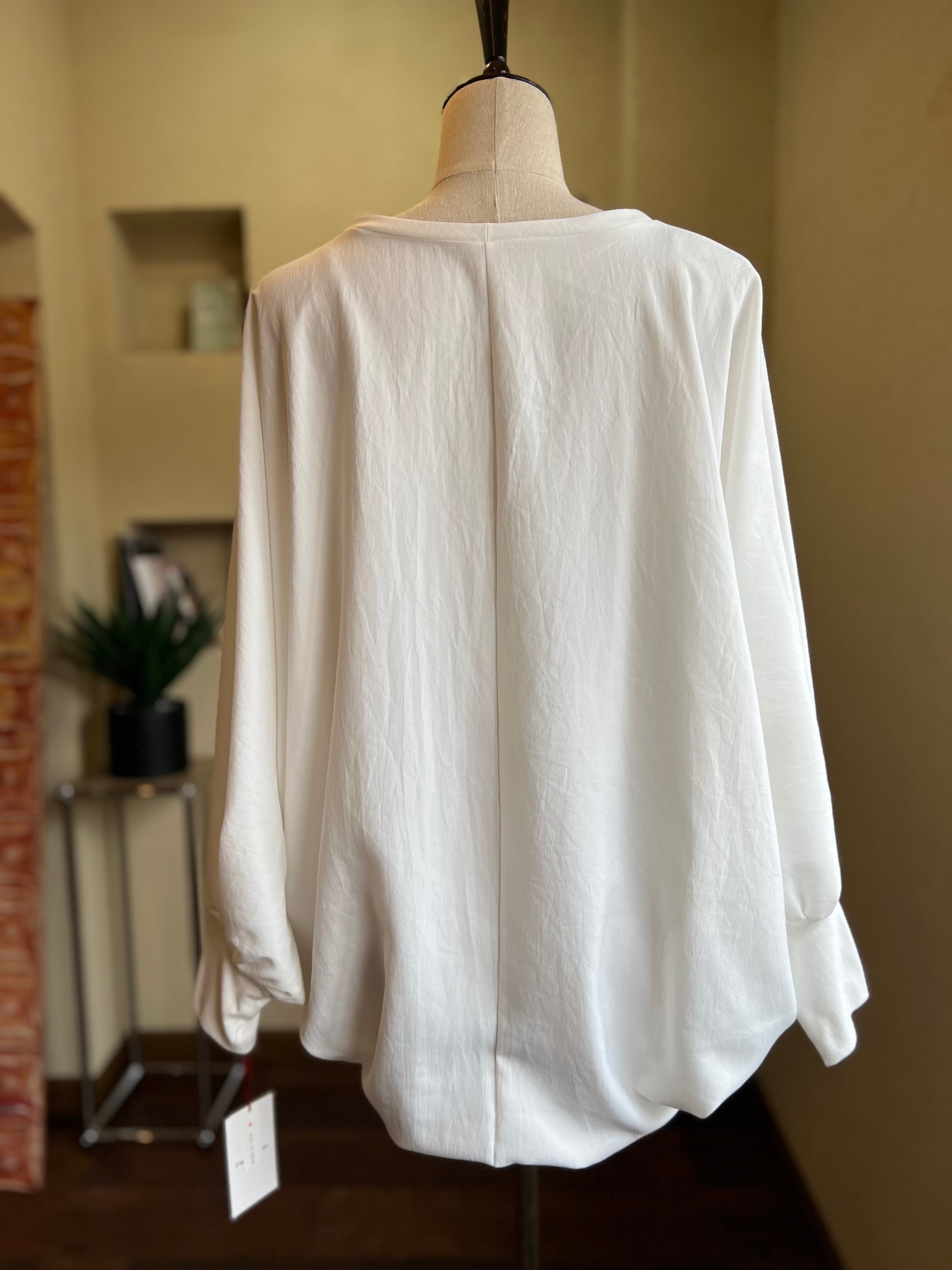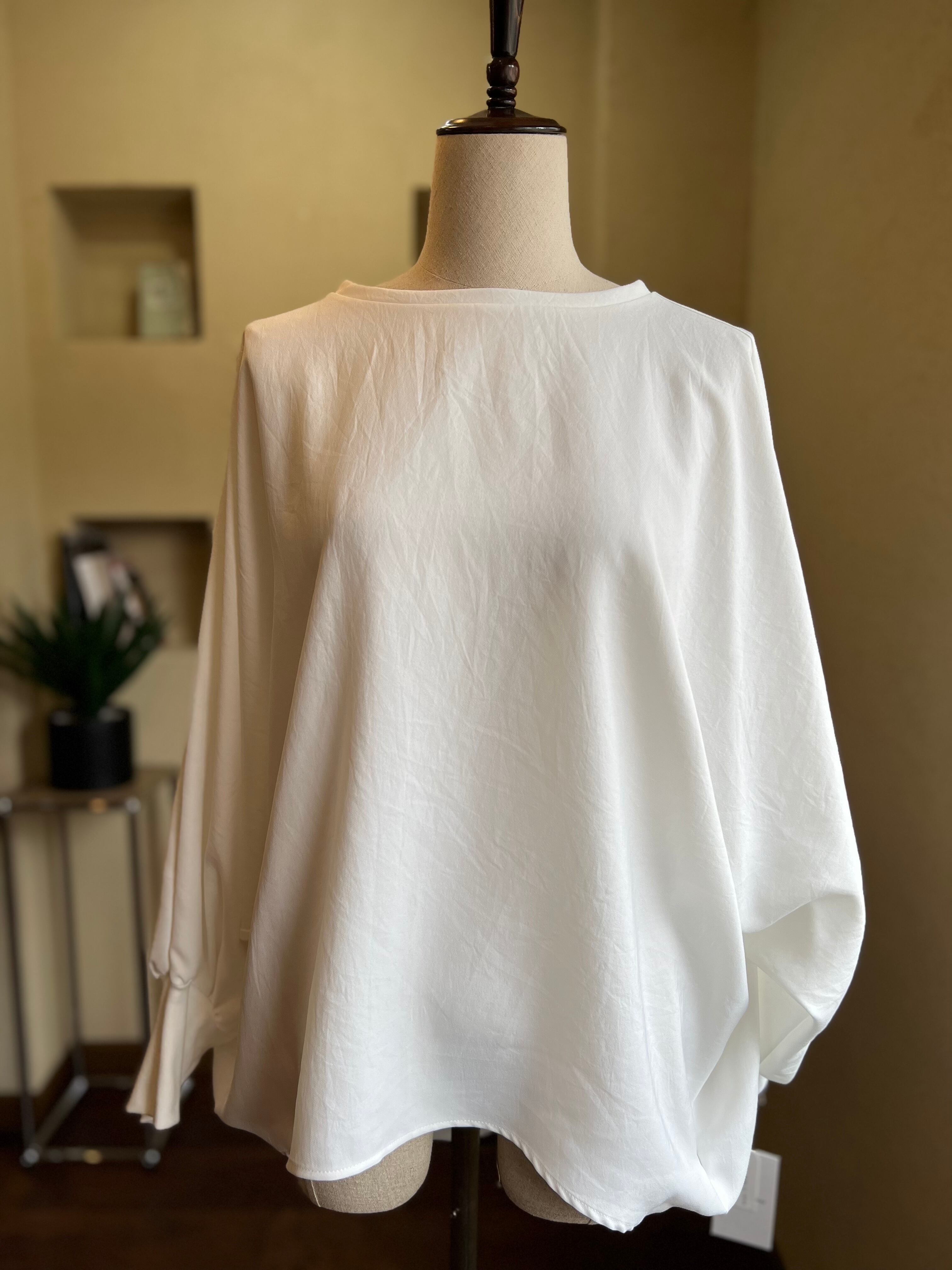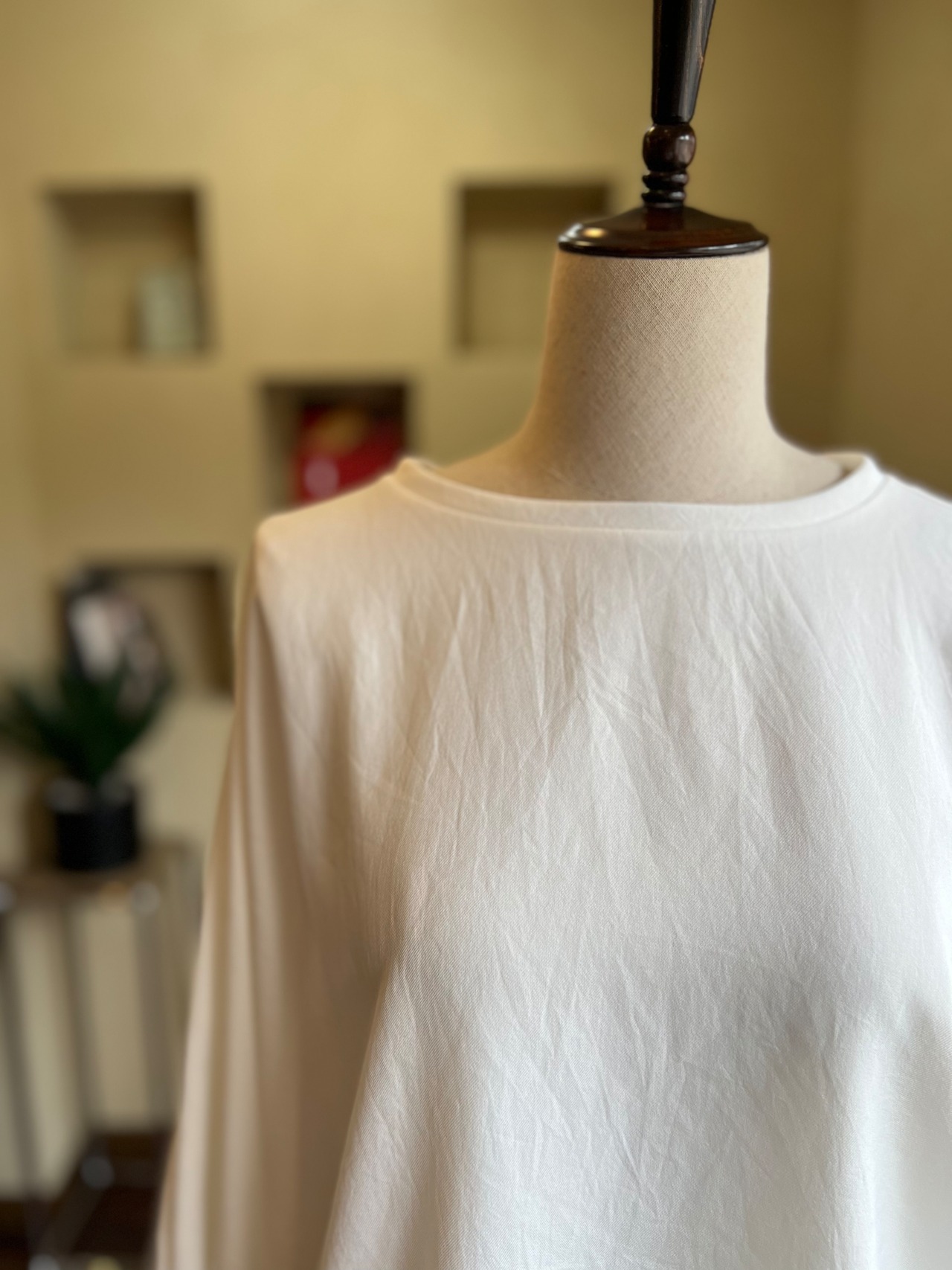 後ろ裾がバルーンのように立体的なフォルムの着映えするブラウス