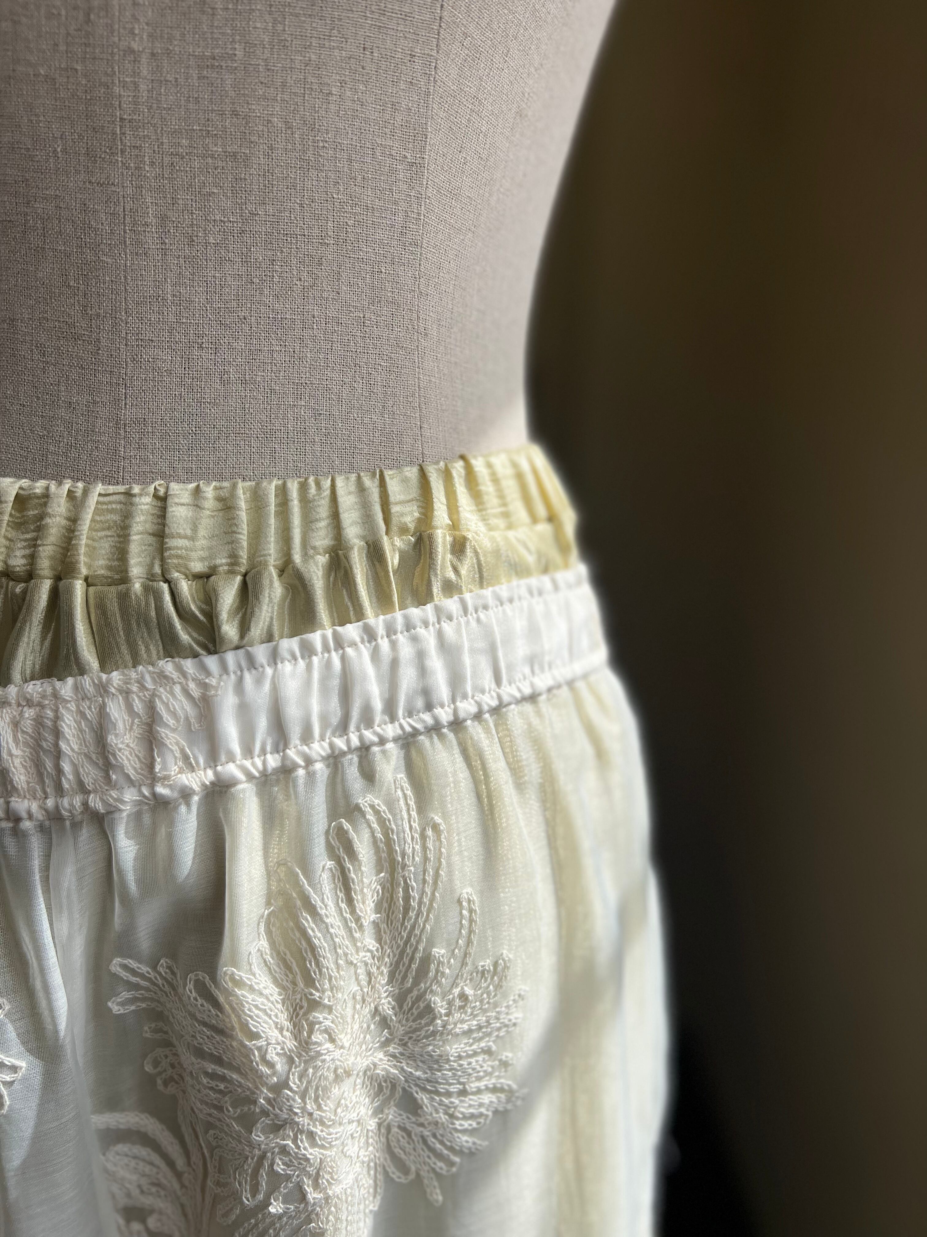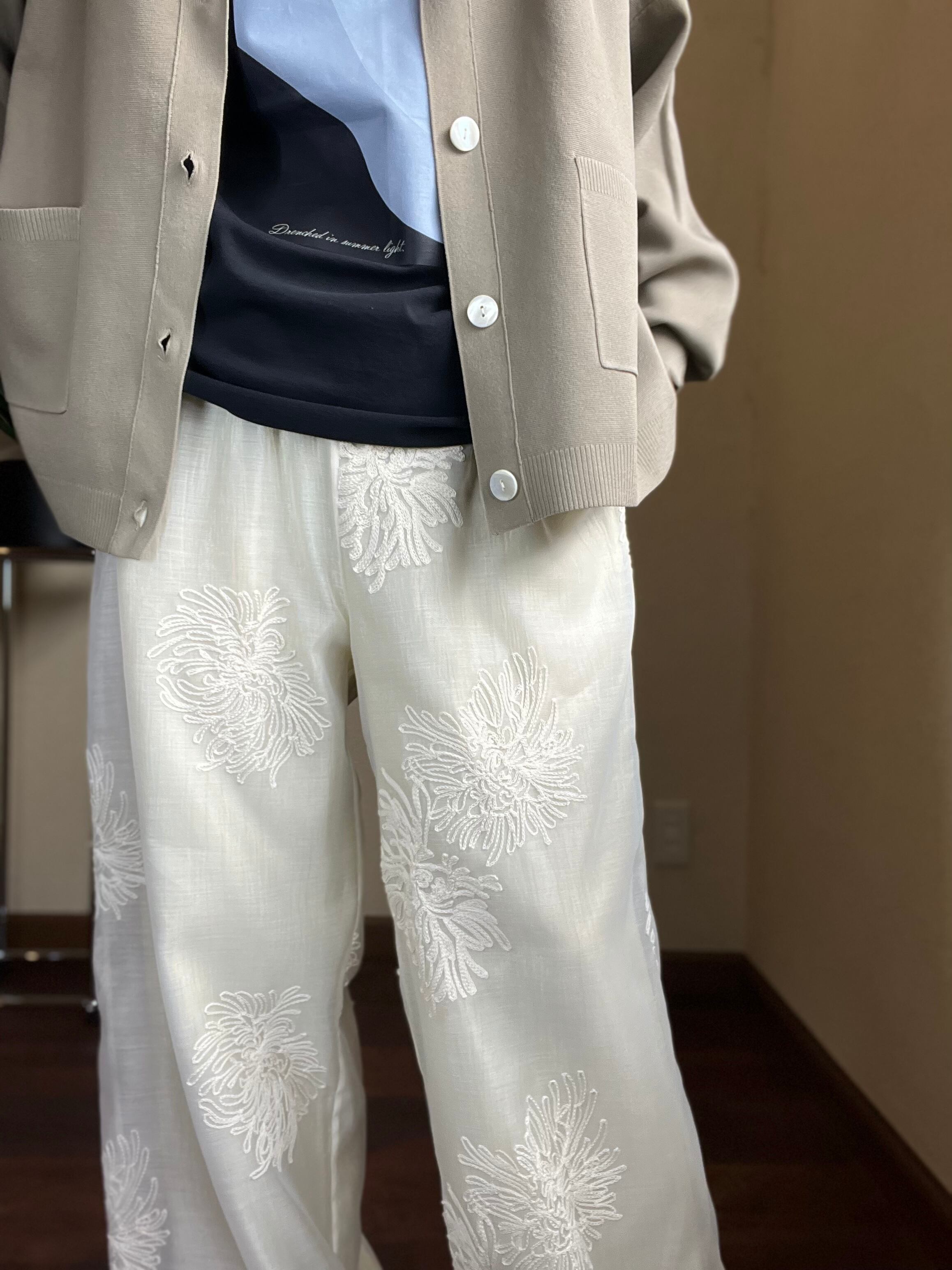 今年らしいオーガンジー素材に刺繍が入ったパンツと