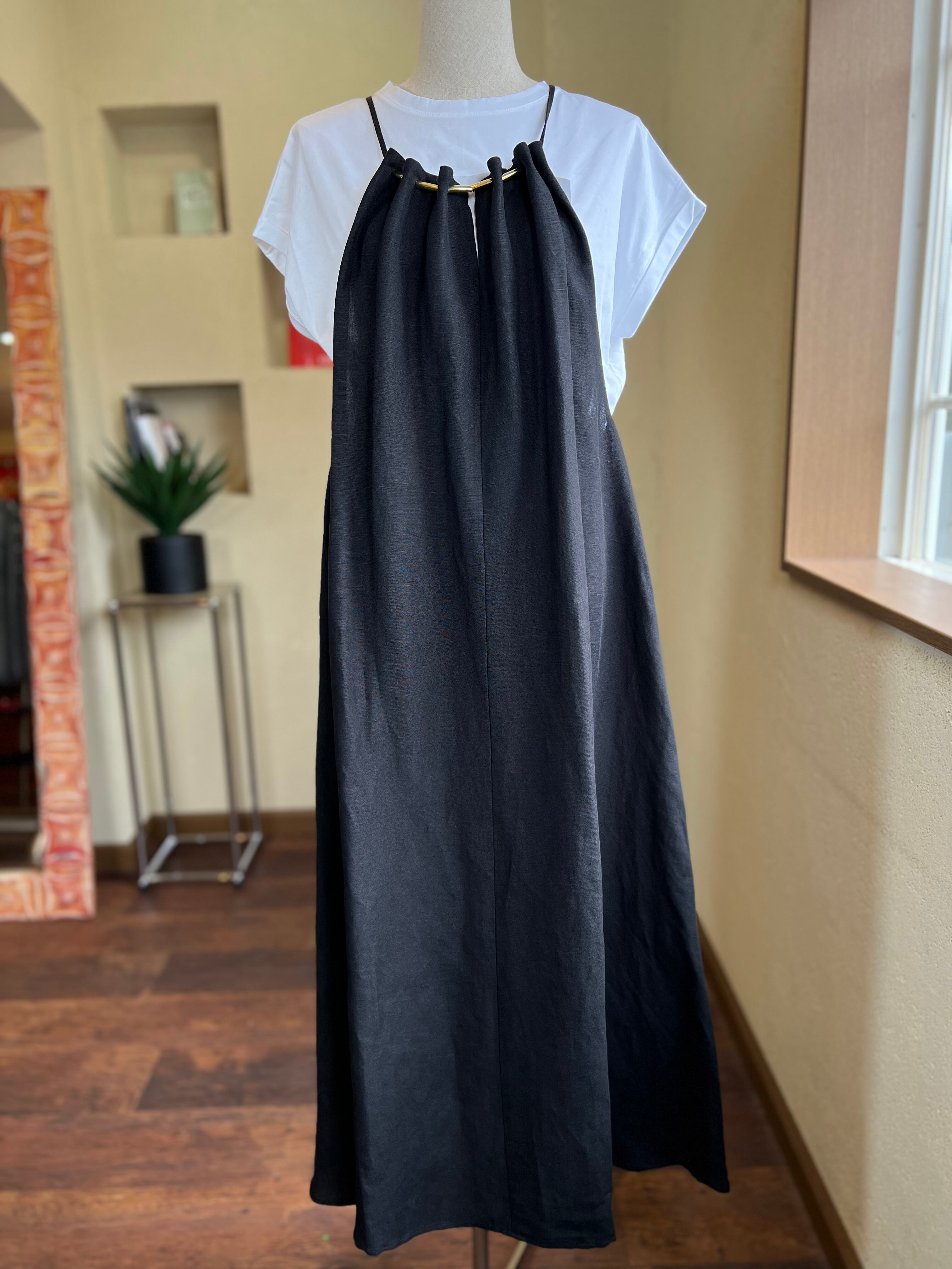 華奢な肩紐と襟元の金具がアクセントになったフレアー型ワンピース