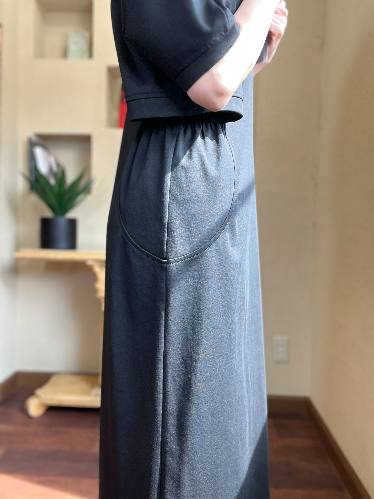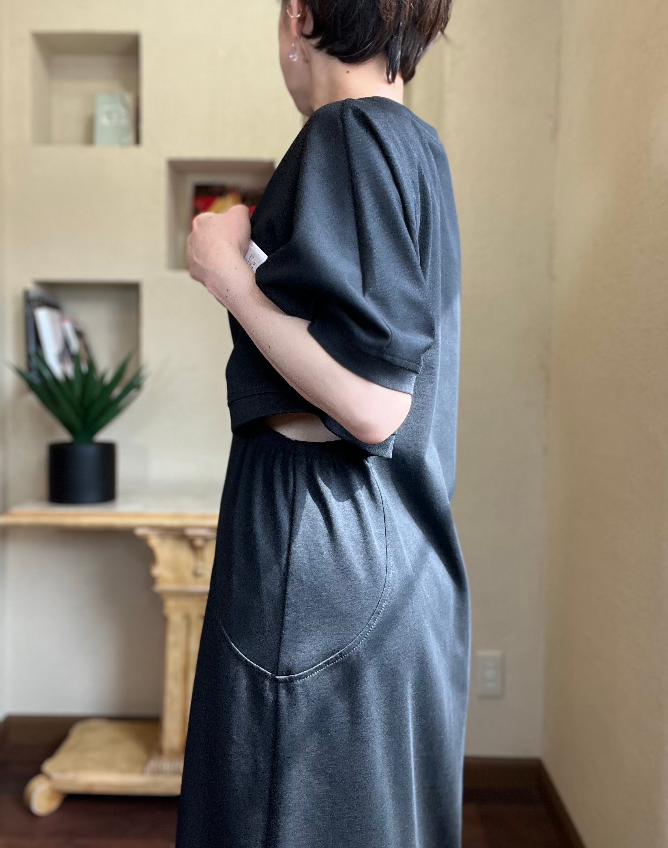 スカート部分は程よい広がりがあり、袖はフレアスリーブ
