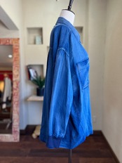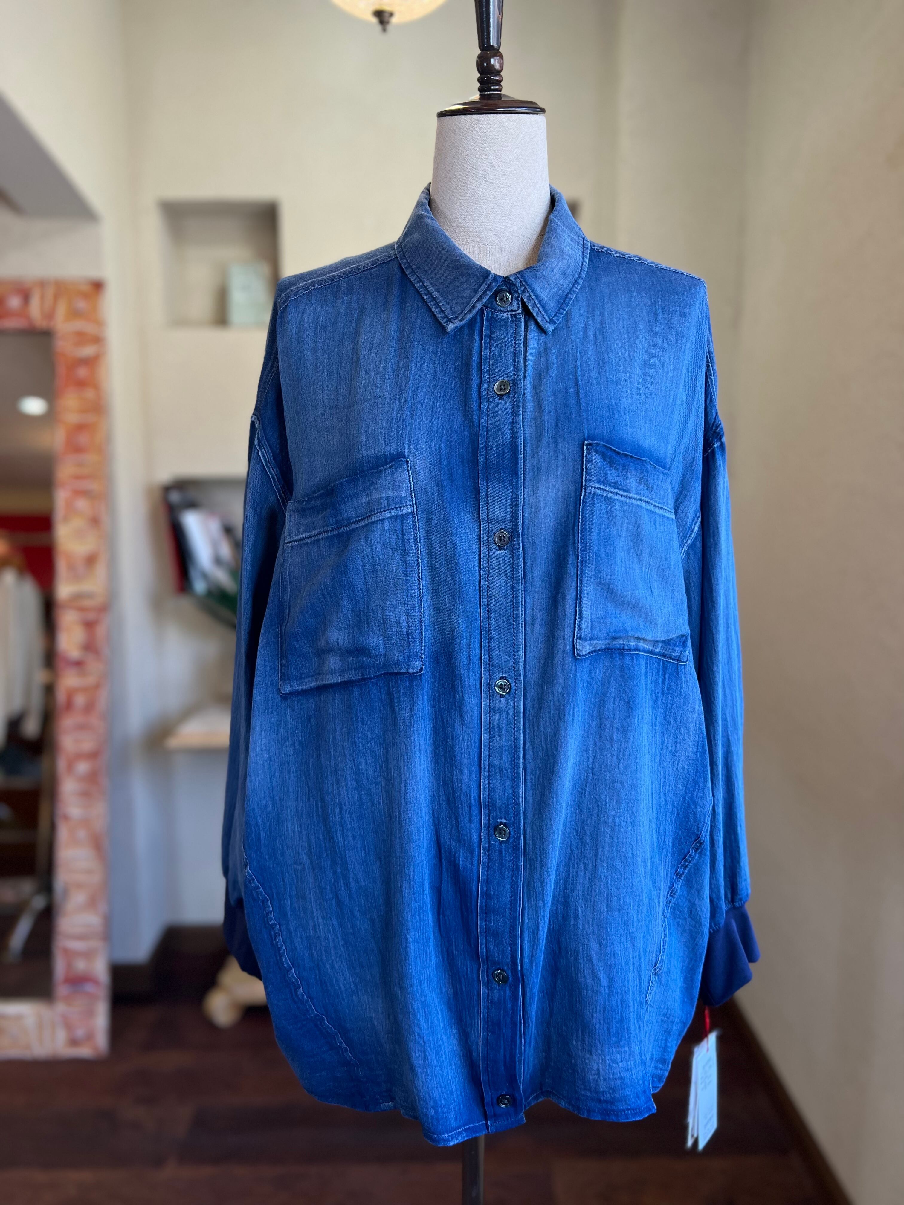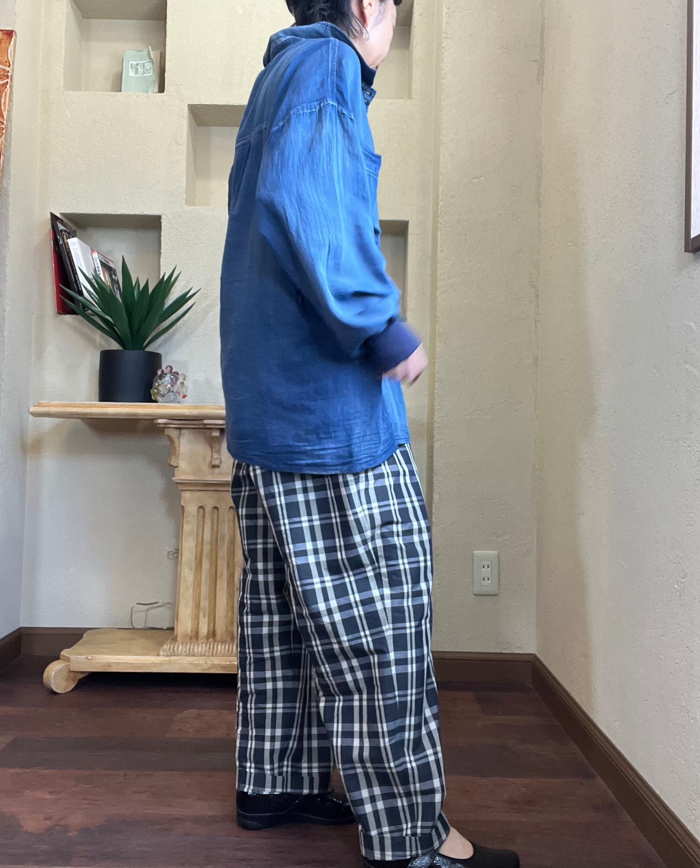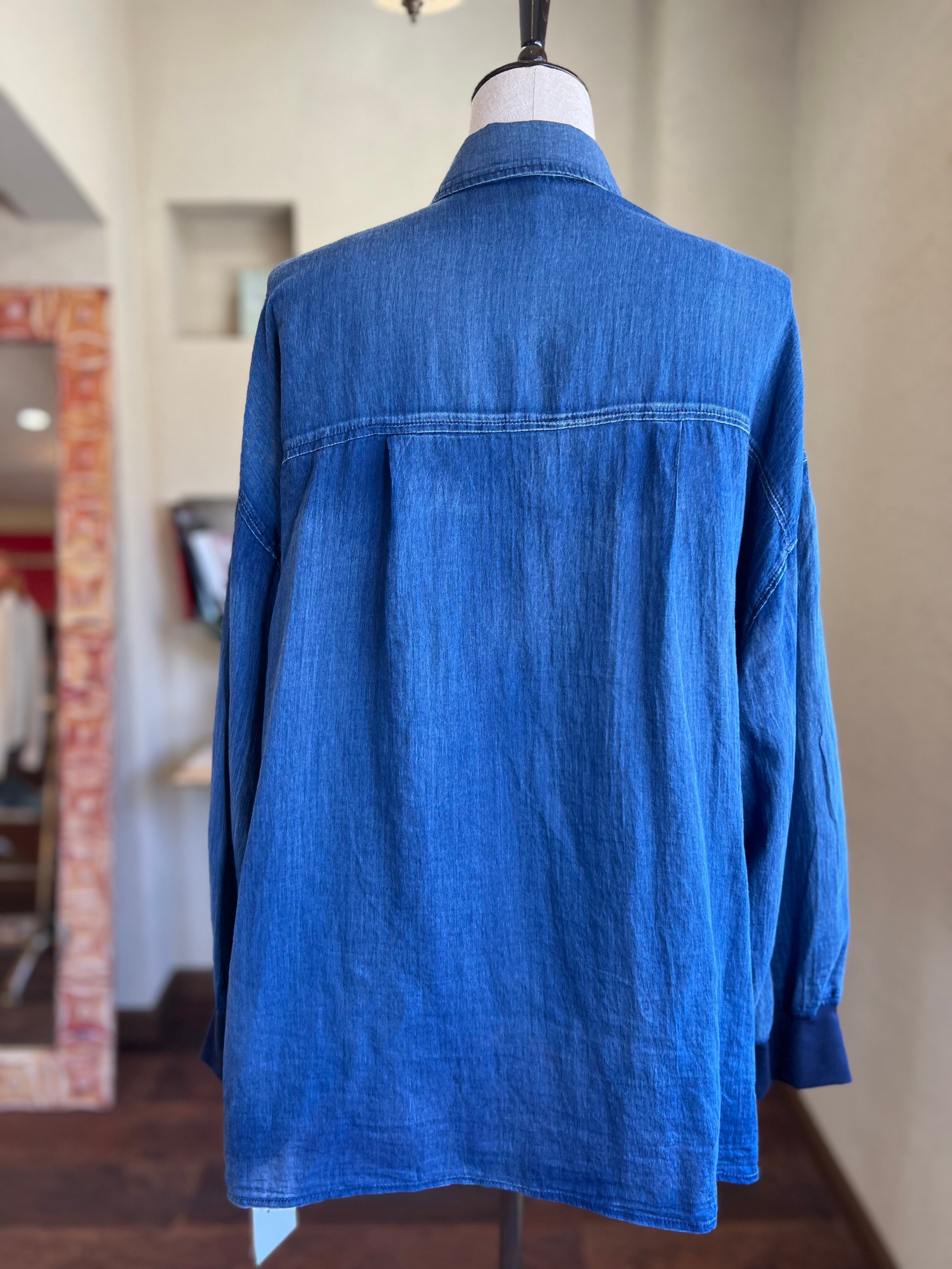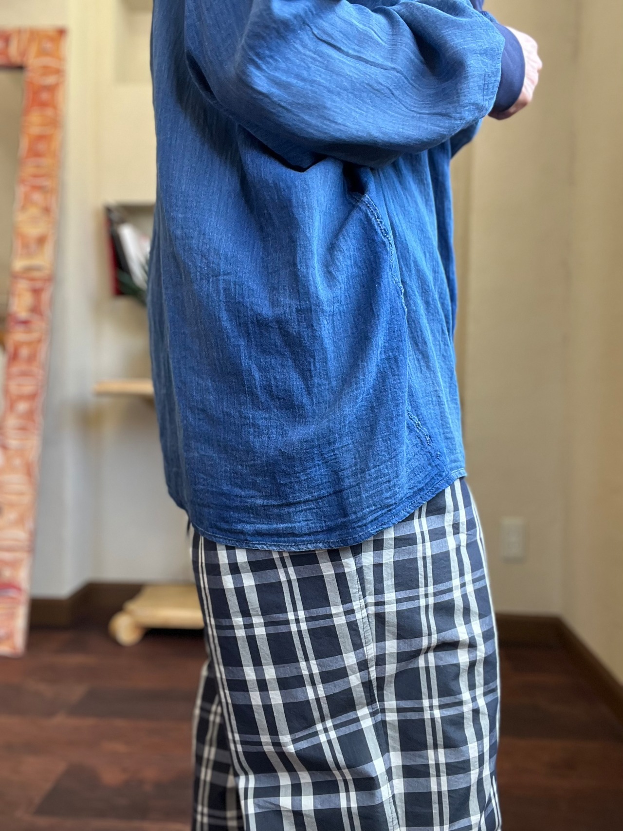柔らかくしなやかな肌触りの、綿100%素材の透け感の少ないデニム風シャツ