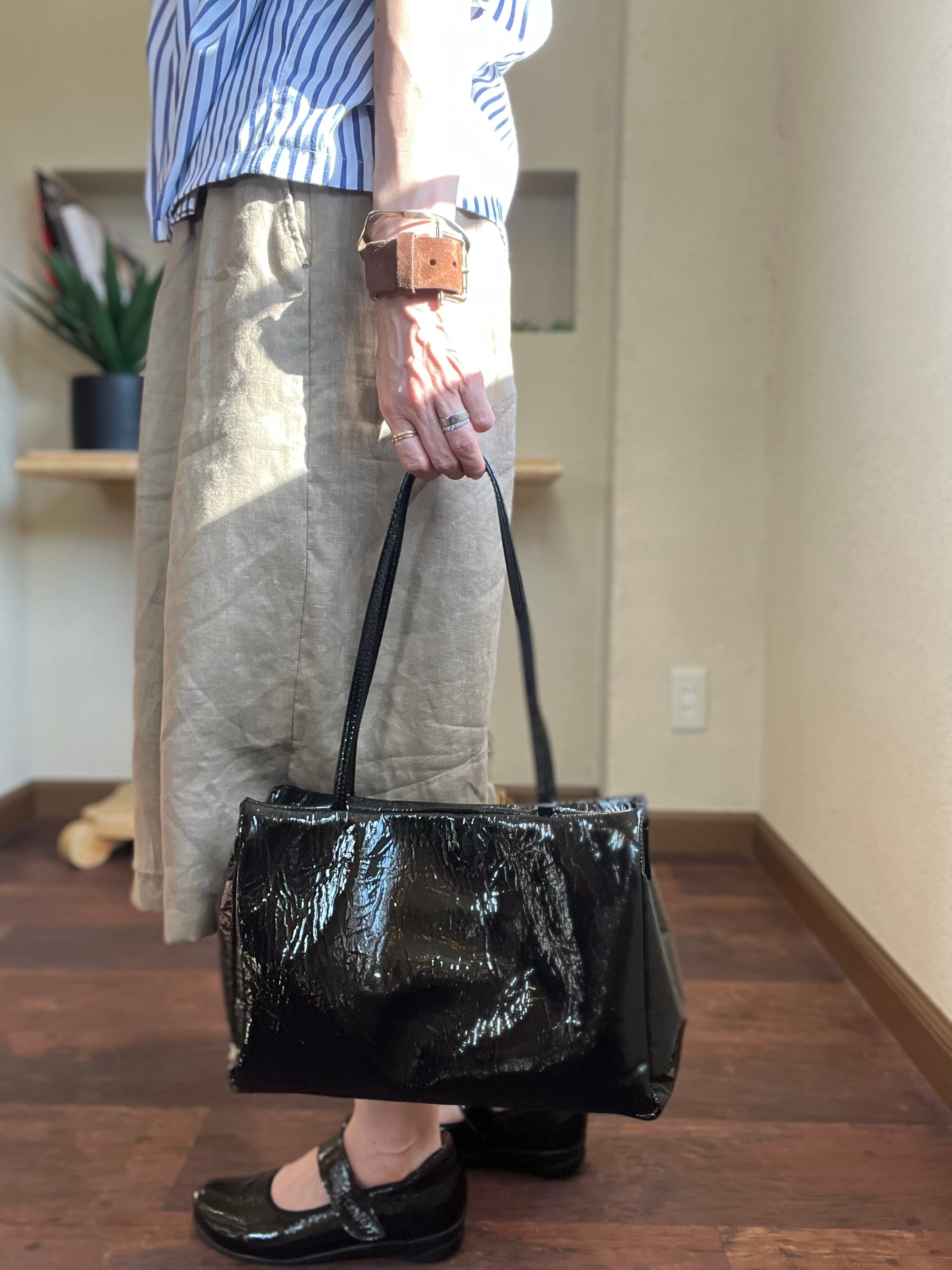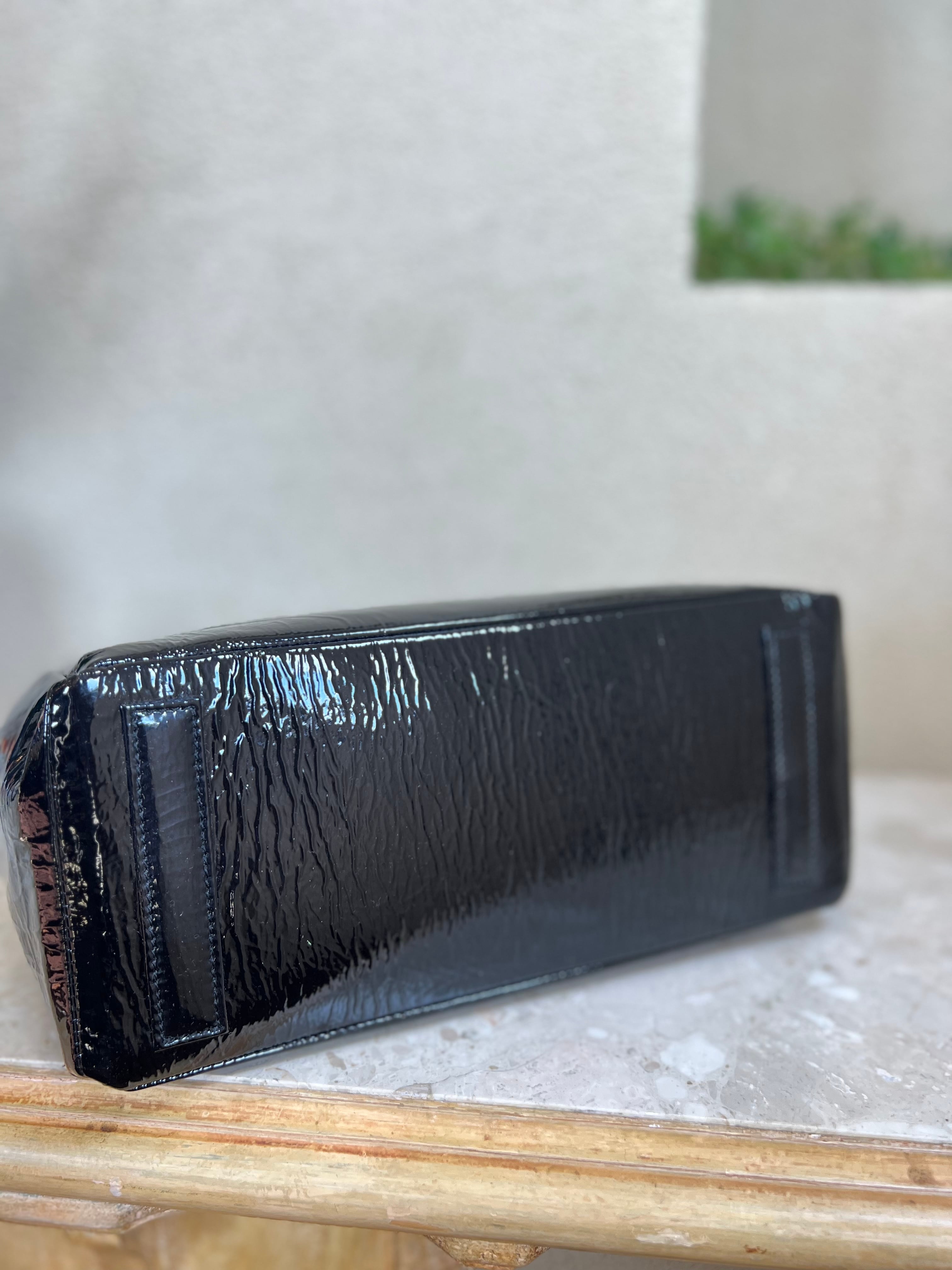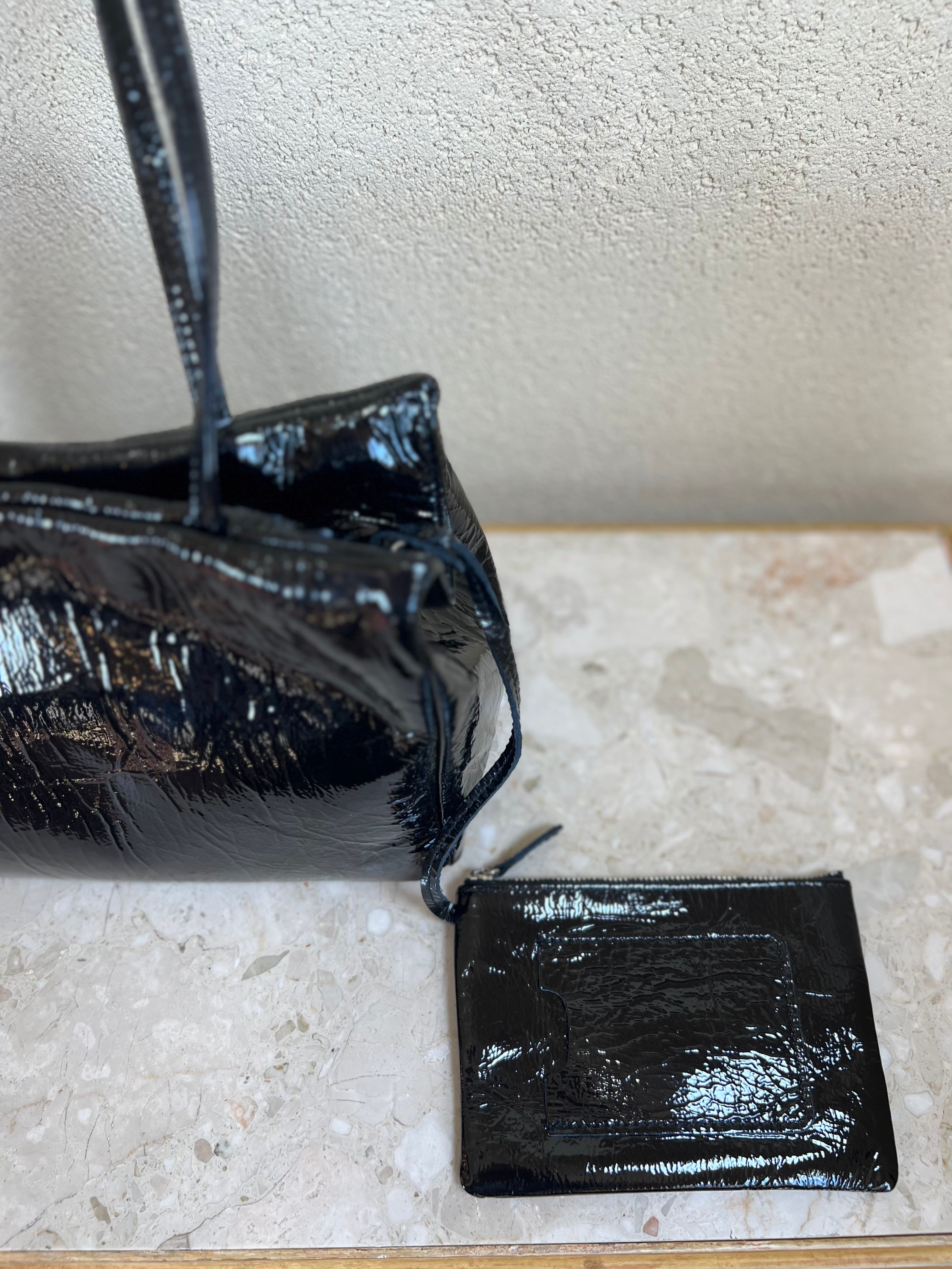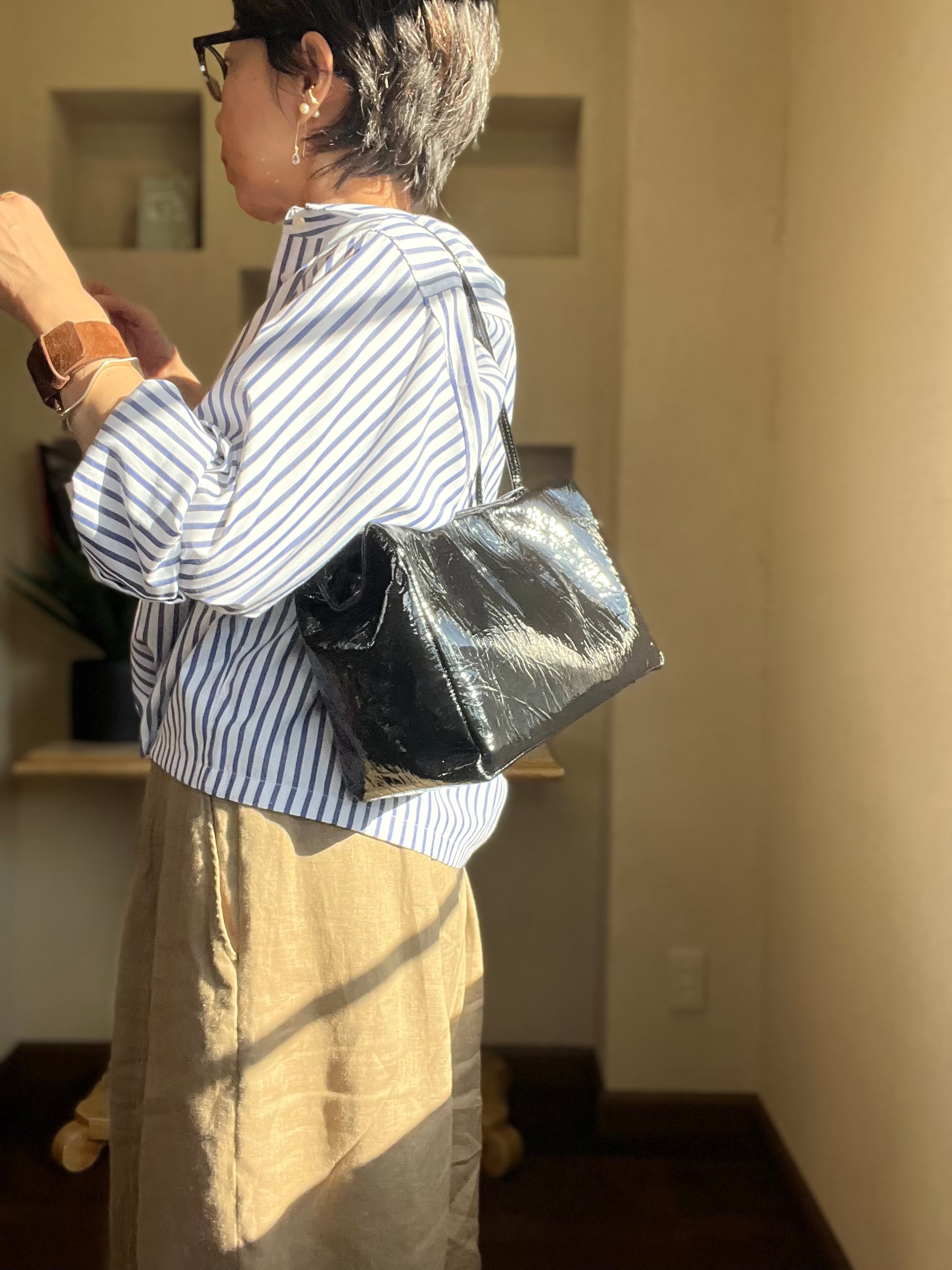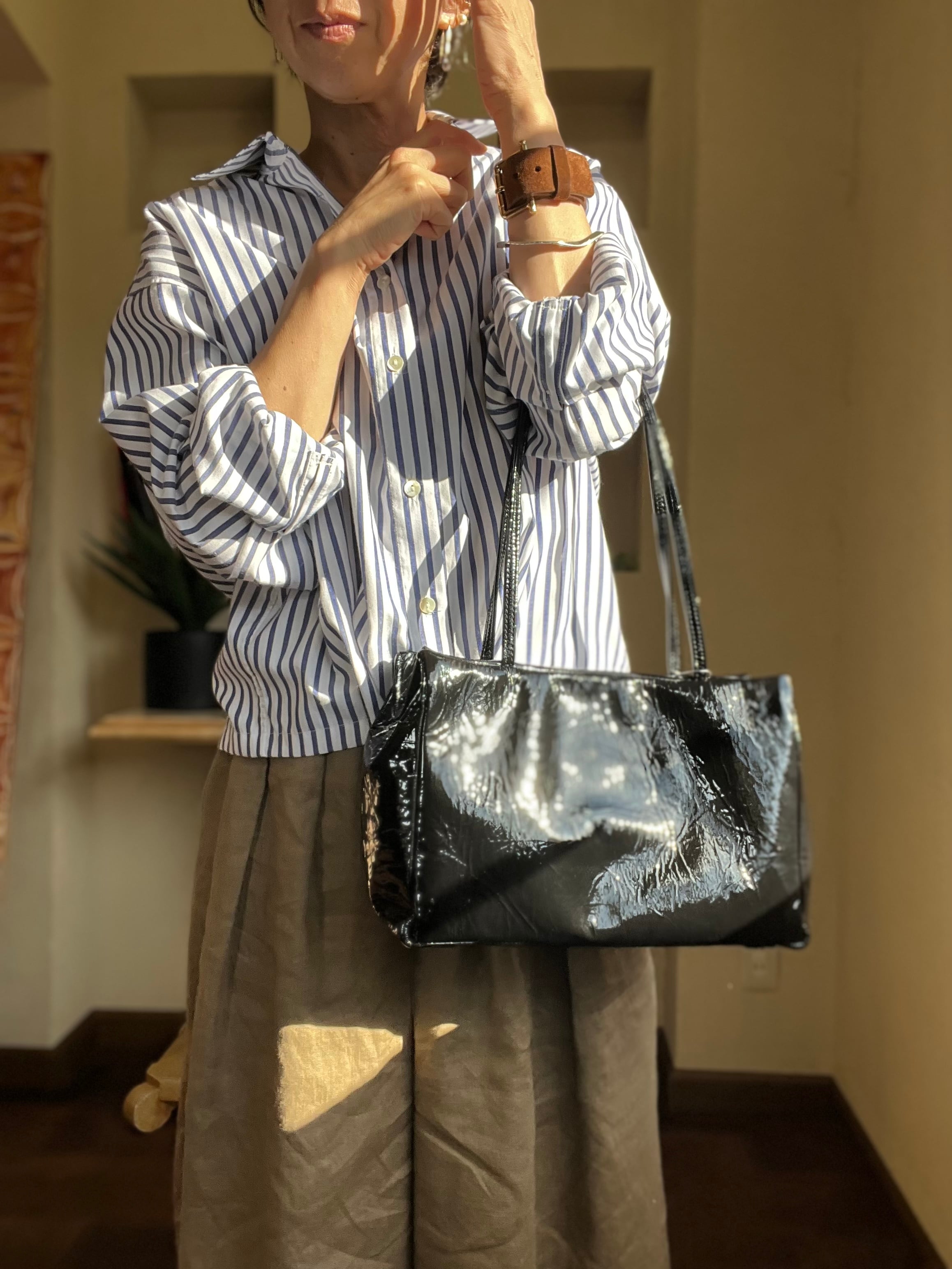 シワ加工が施されたパテントレザーを使用したミニボストンバッグ
