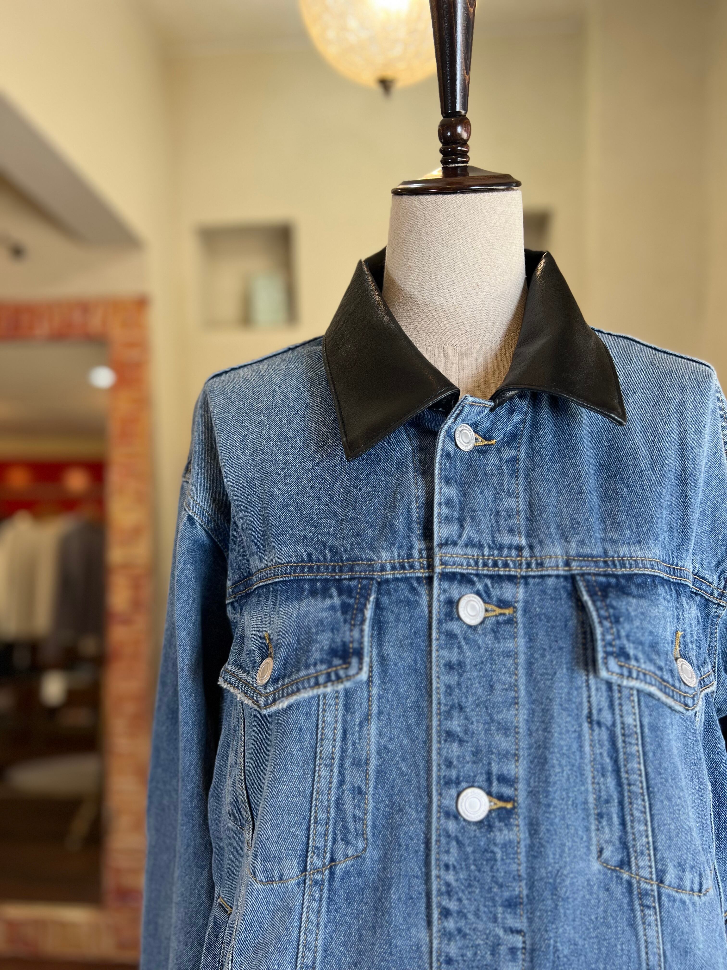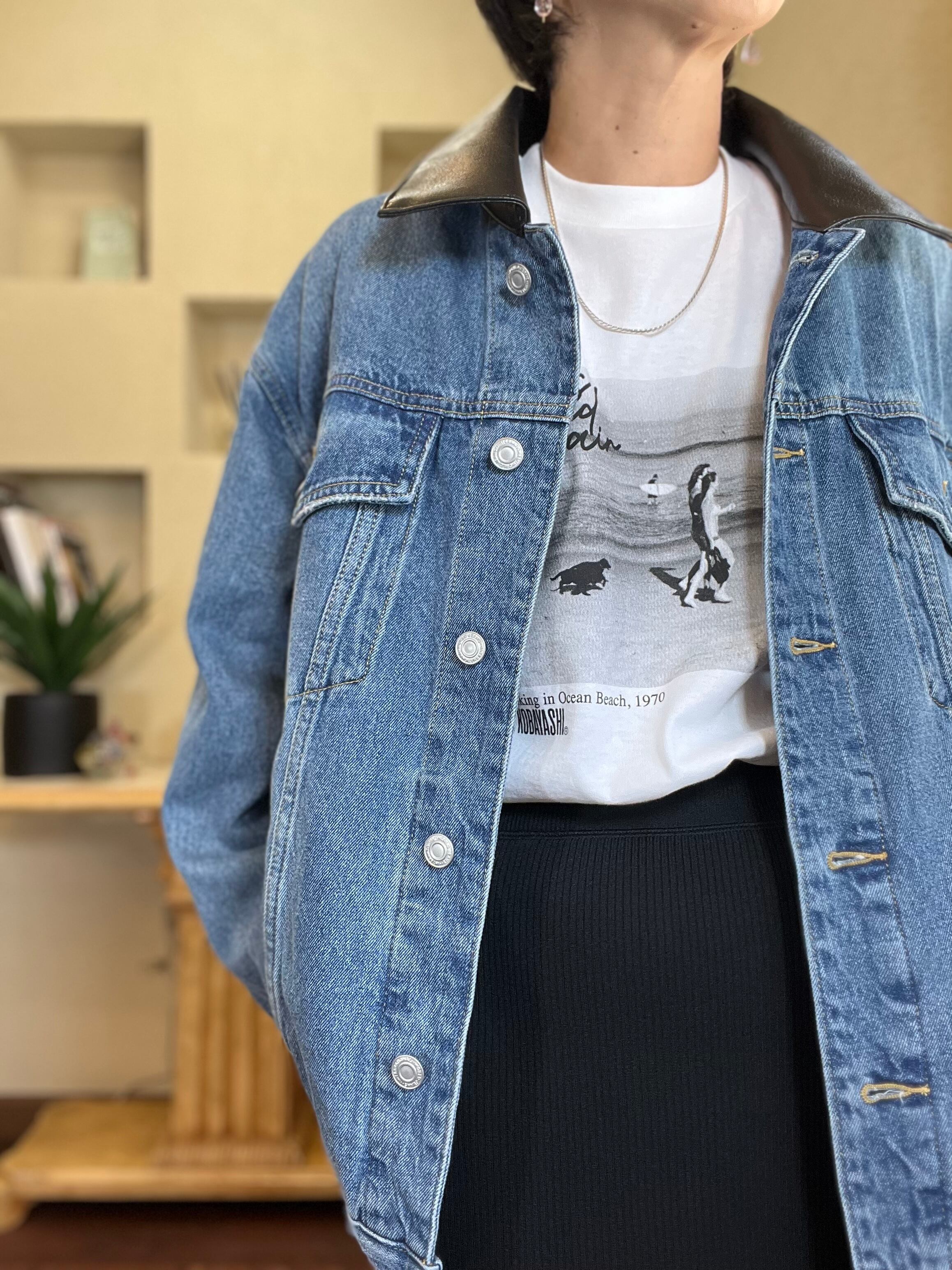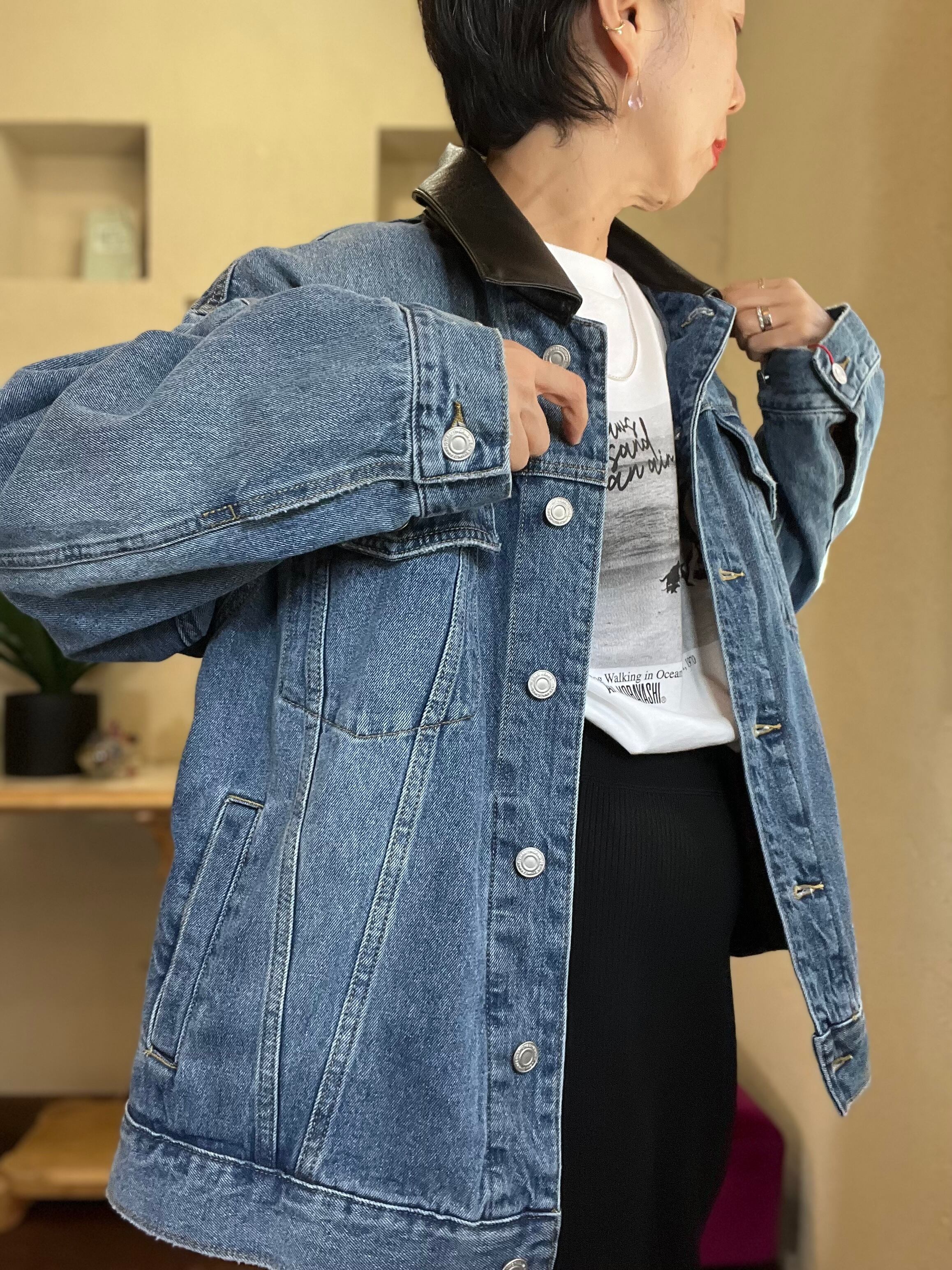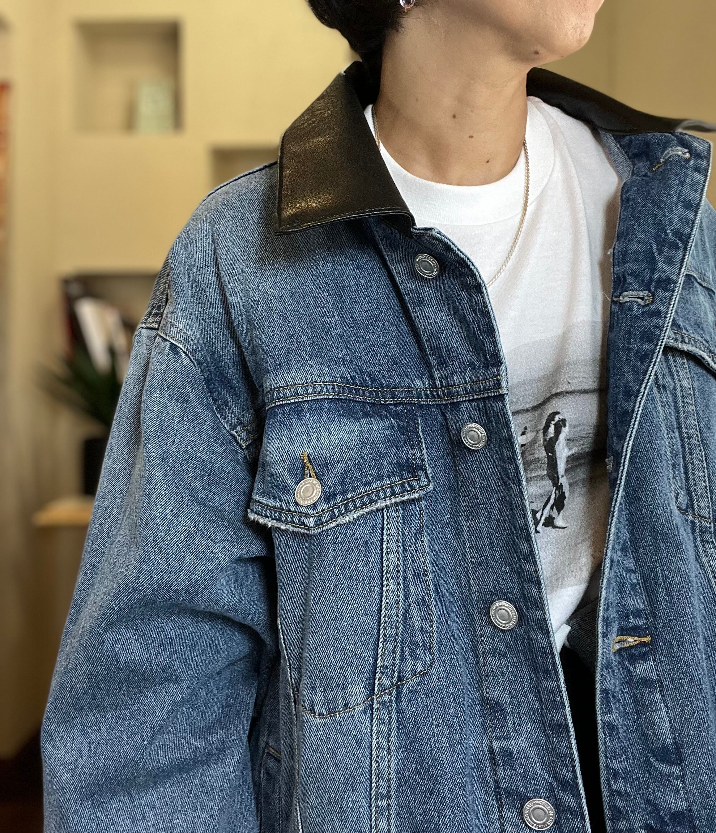 ベーシックなデザインに施されたレザーの襟が目を惹くデニムジャケット