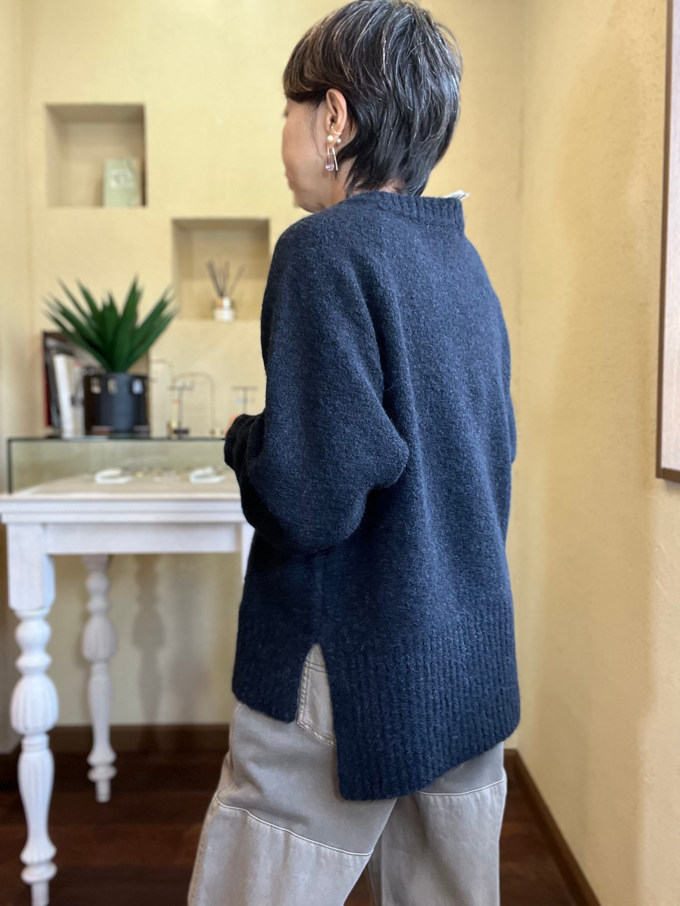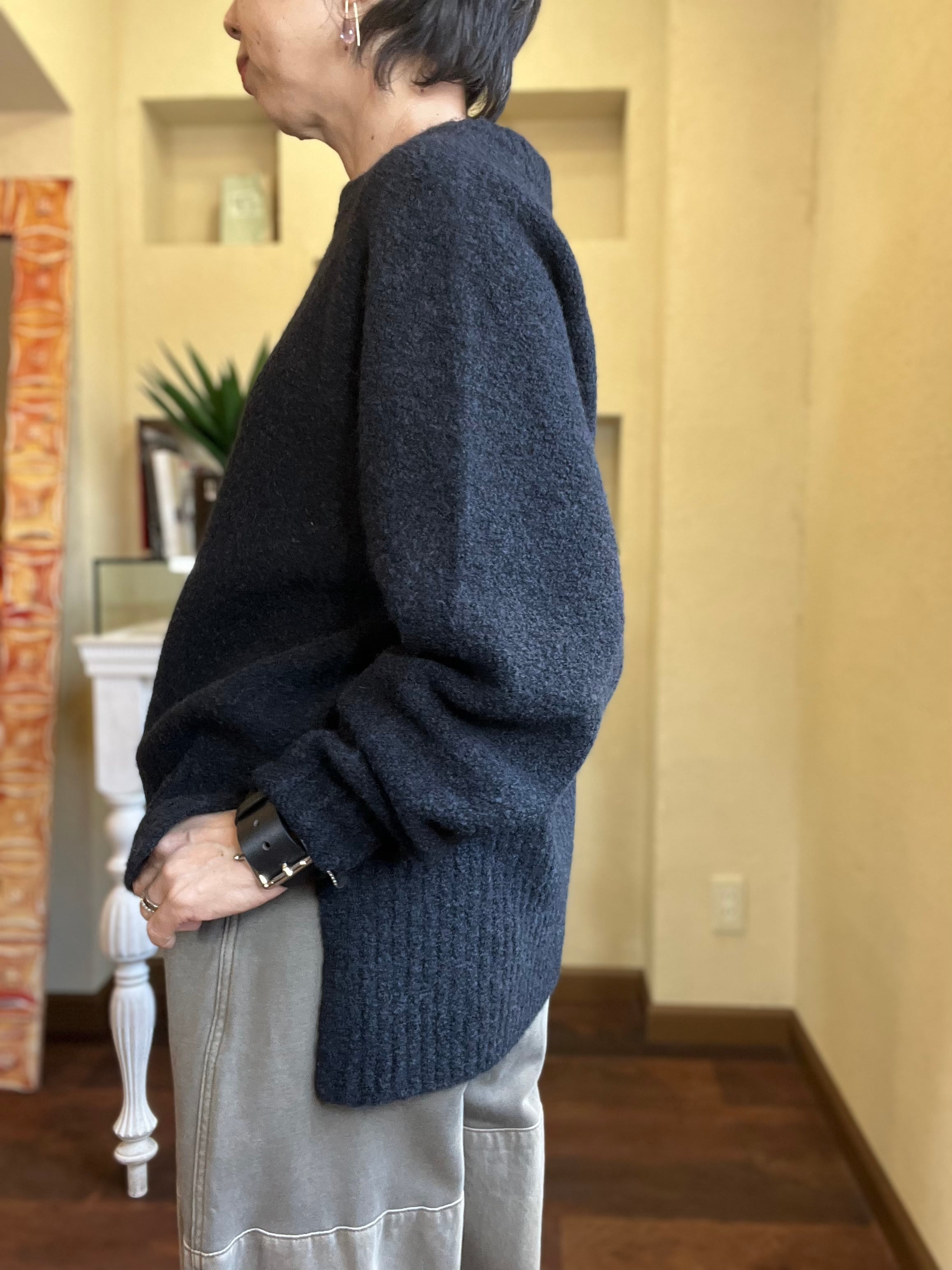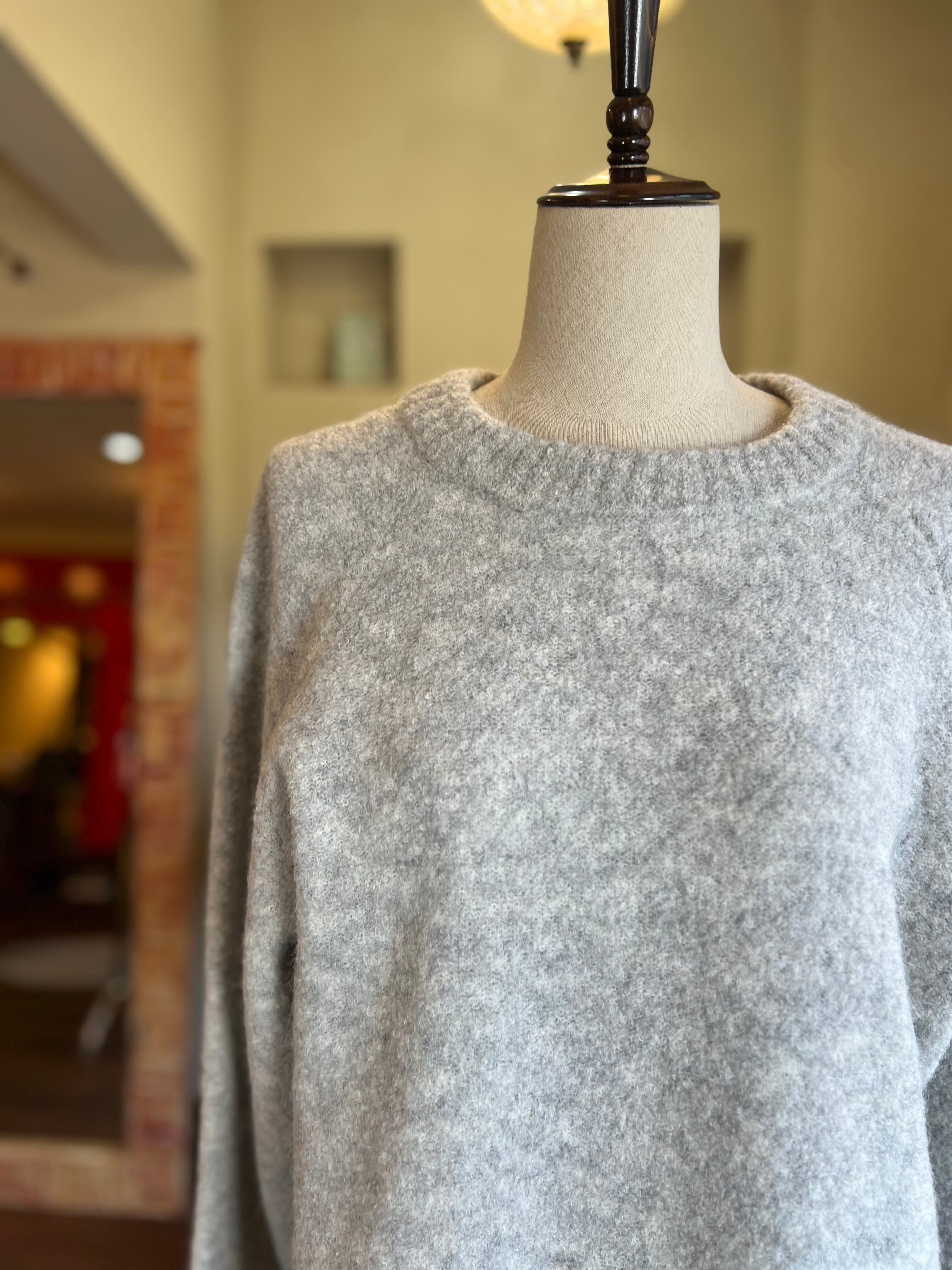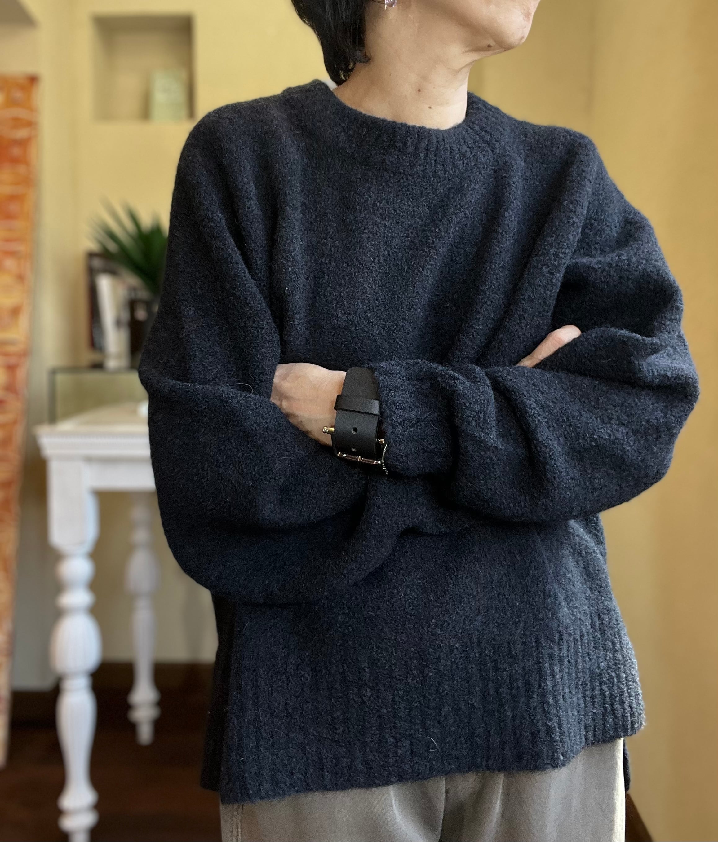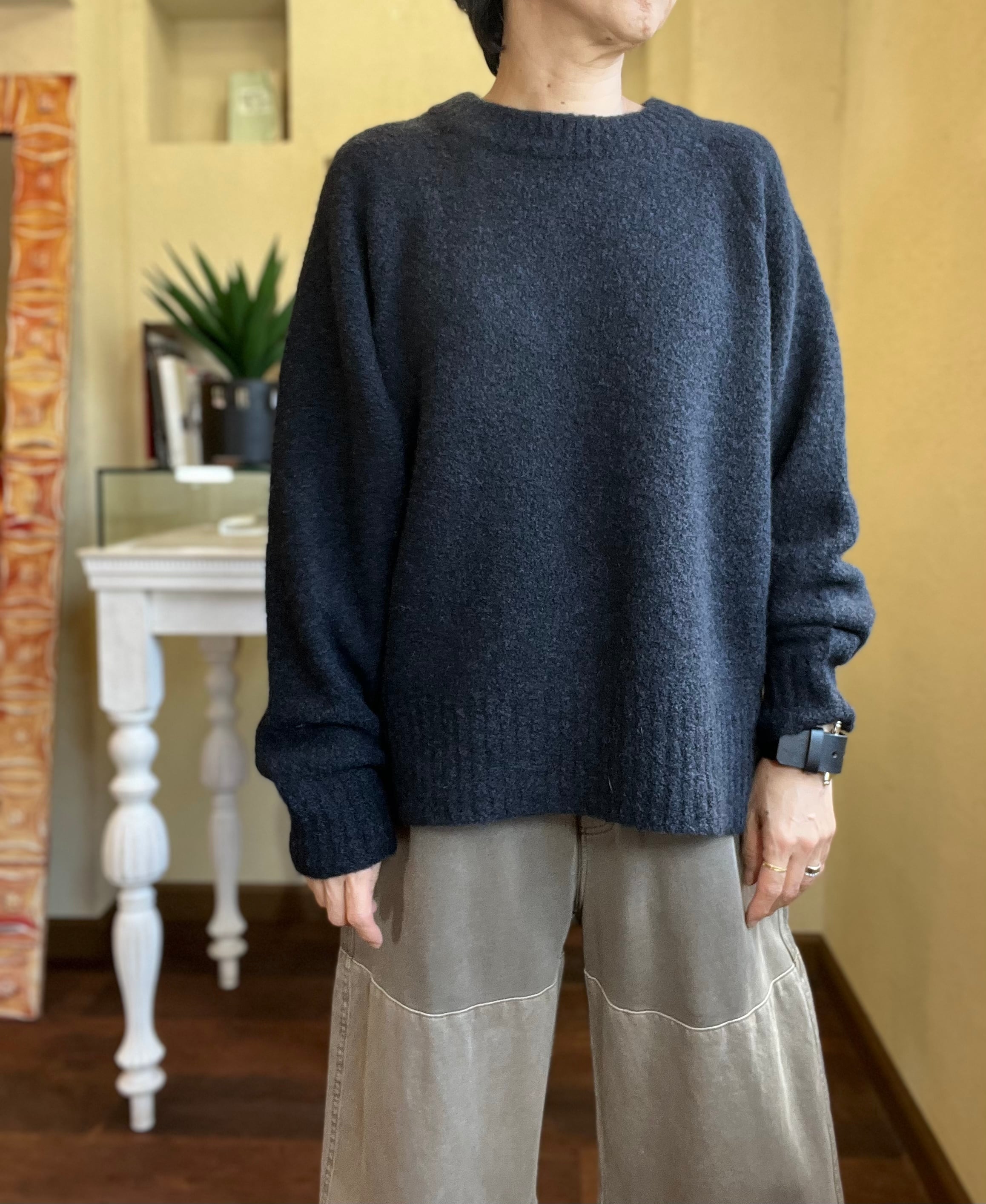 アルパカ混のフワッと軽いブークレー素材のベーシックなクルーネックニット