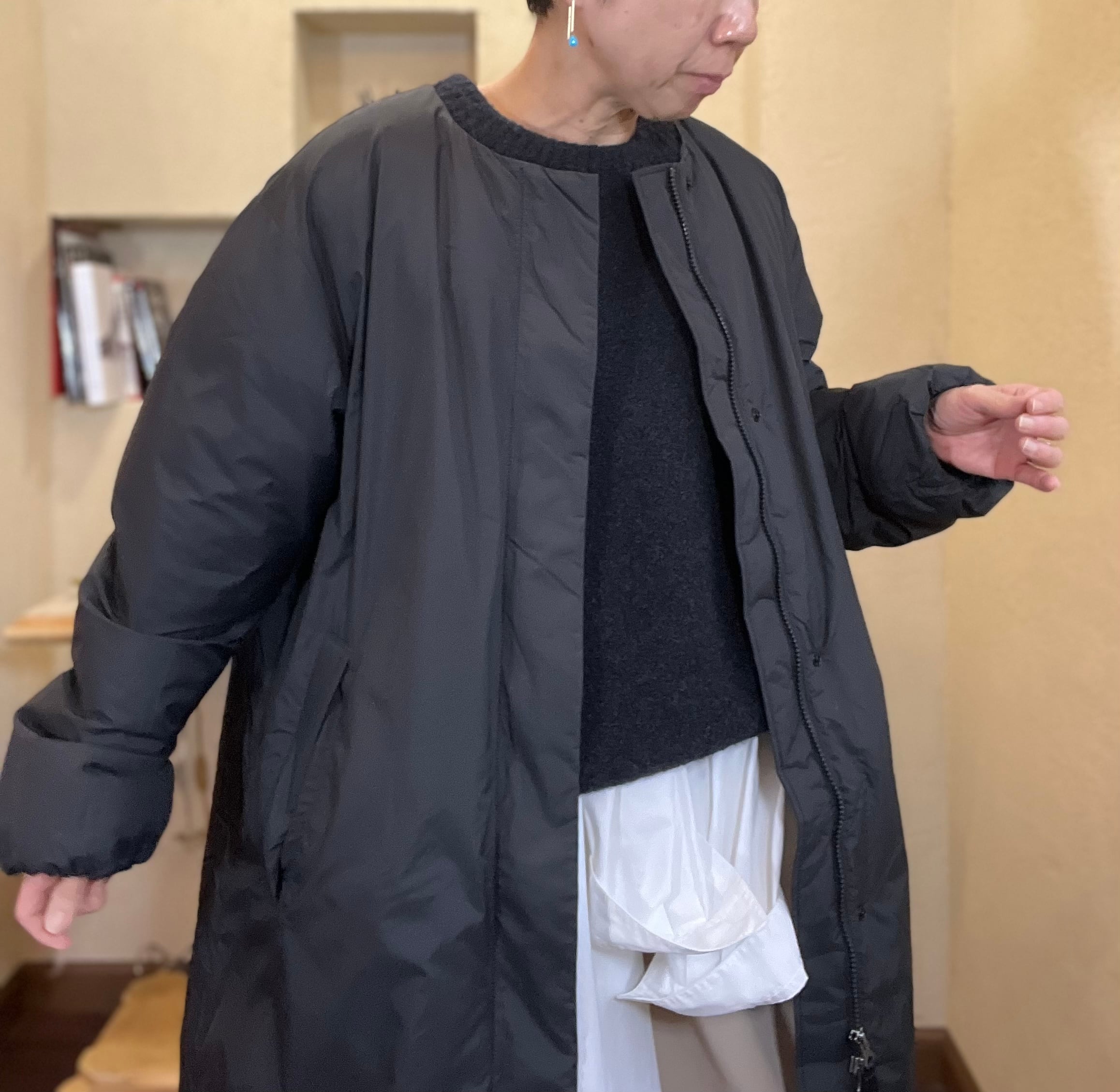 身幅にゆとりのあるリラックスシルエットのノーカラーダウンコート