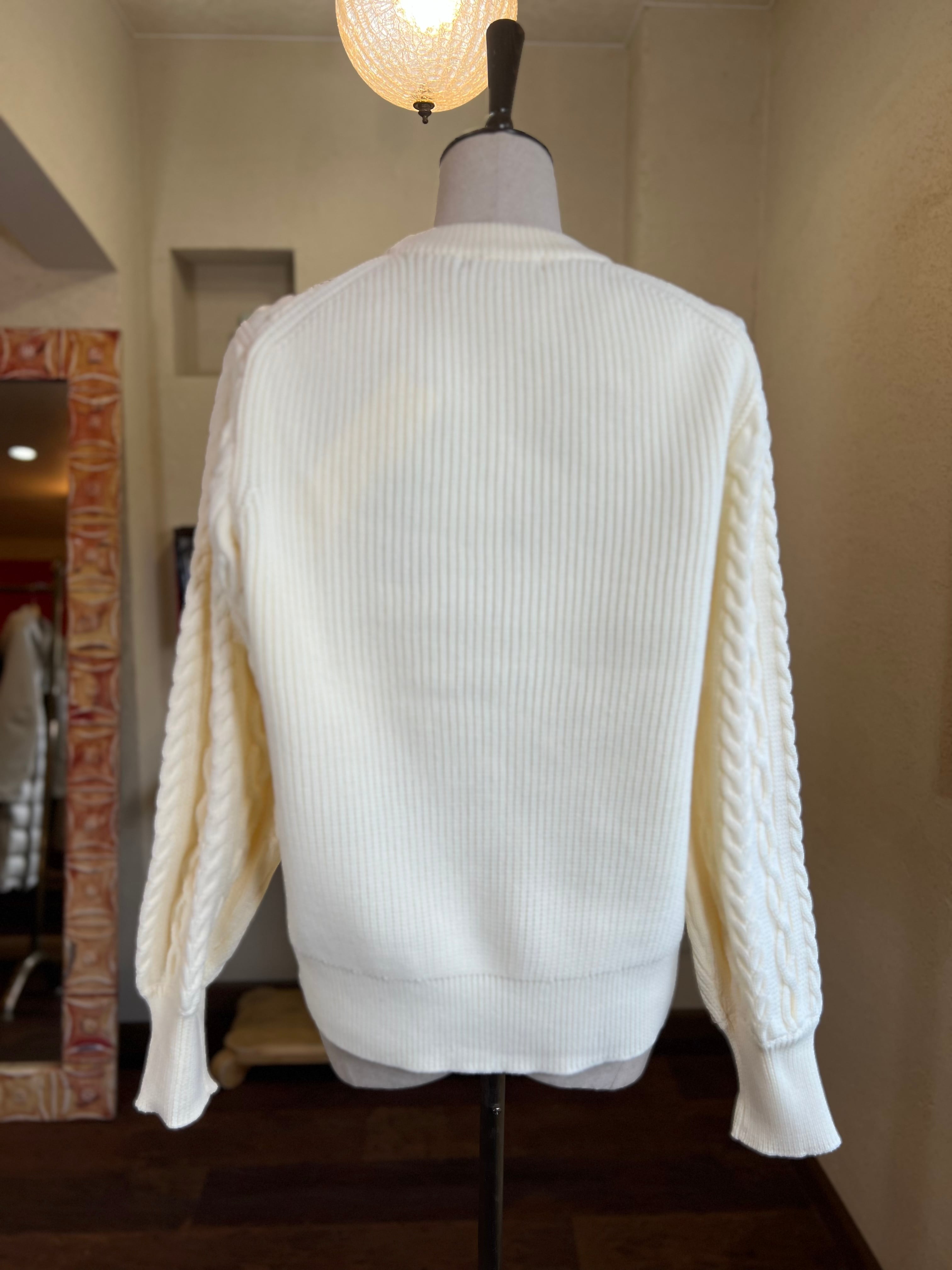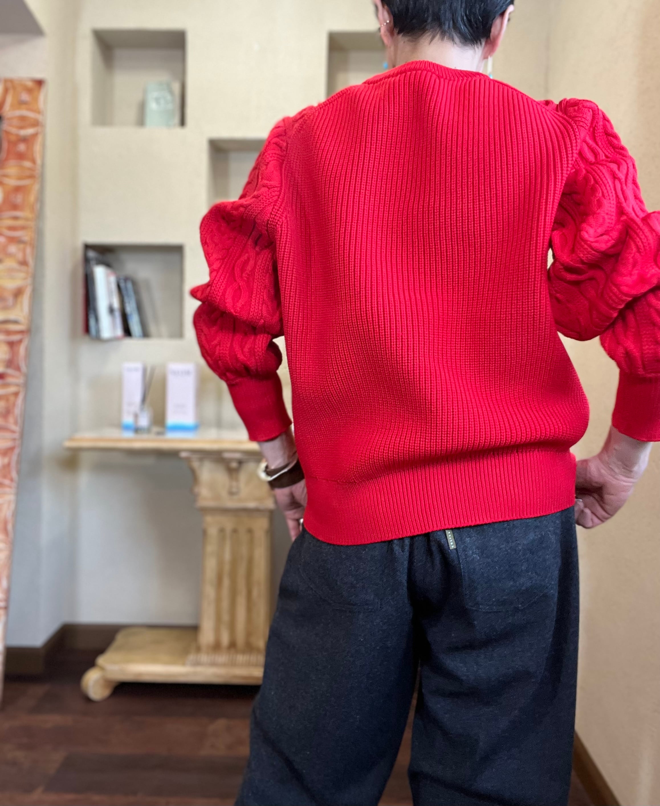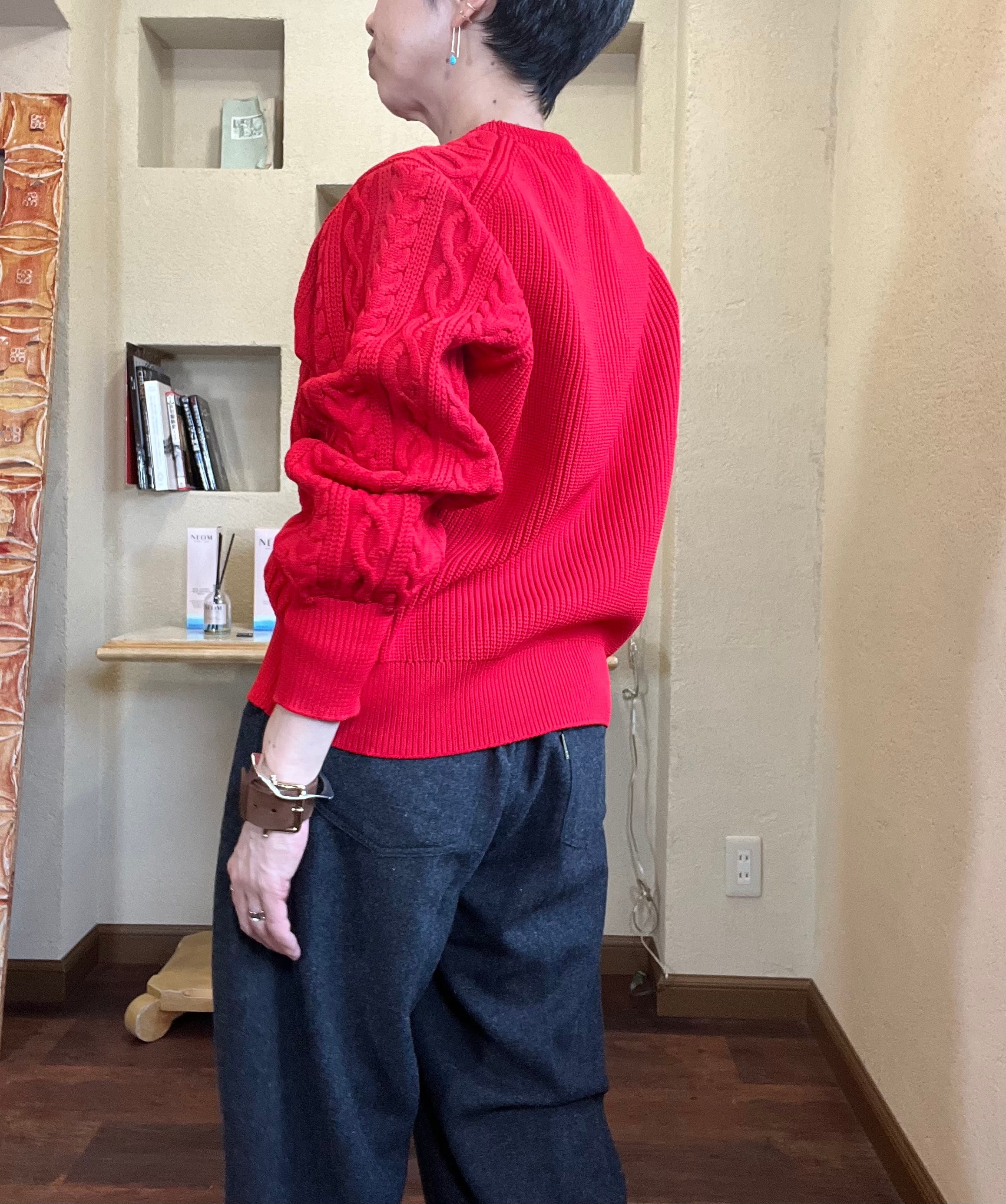 背面はレイヤード時の着ぶくれを防ぐために畦編みを採用するなど細部まで拘った1枚に仕上げています