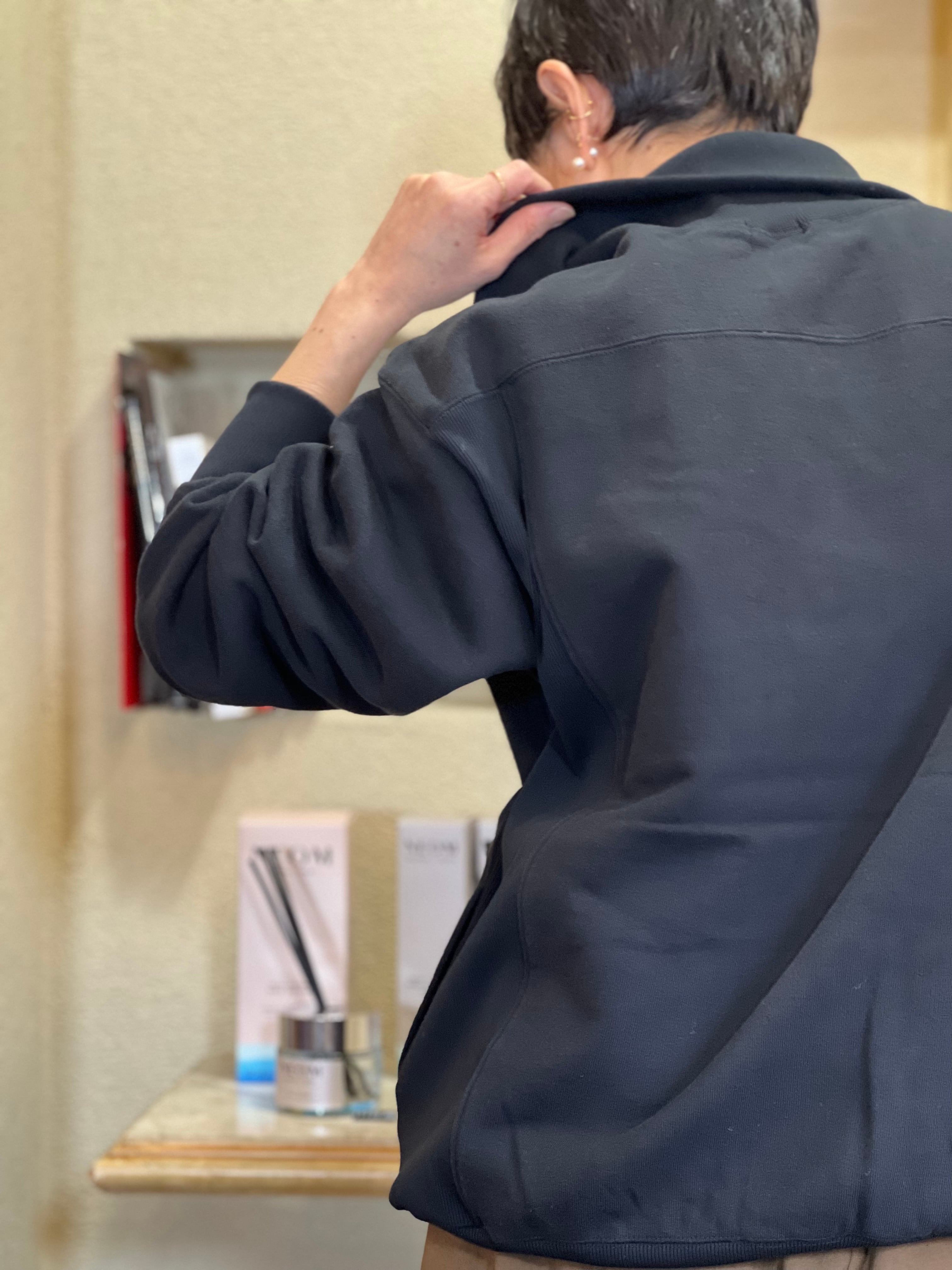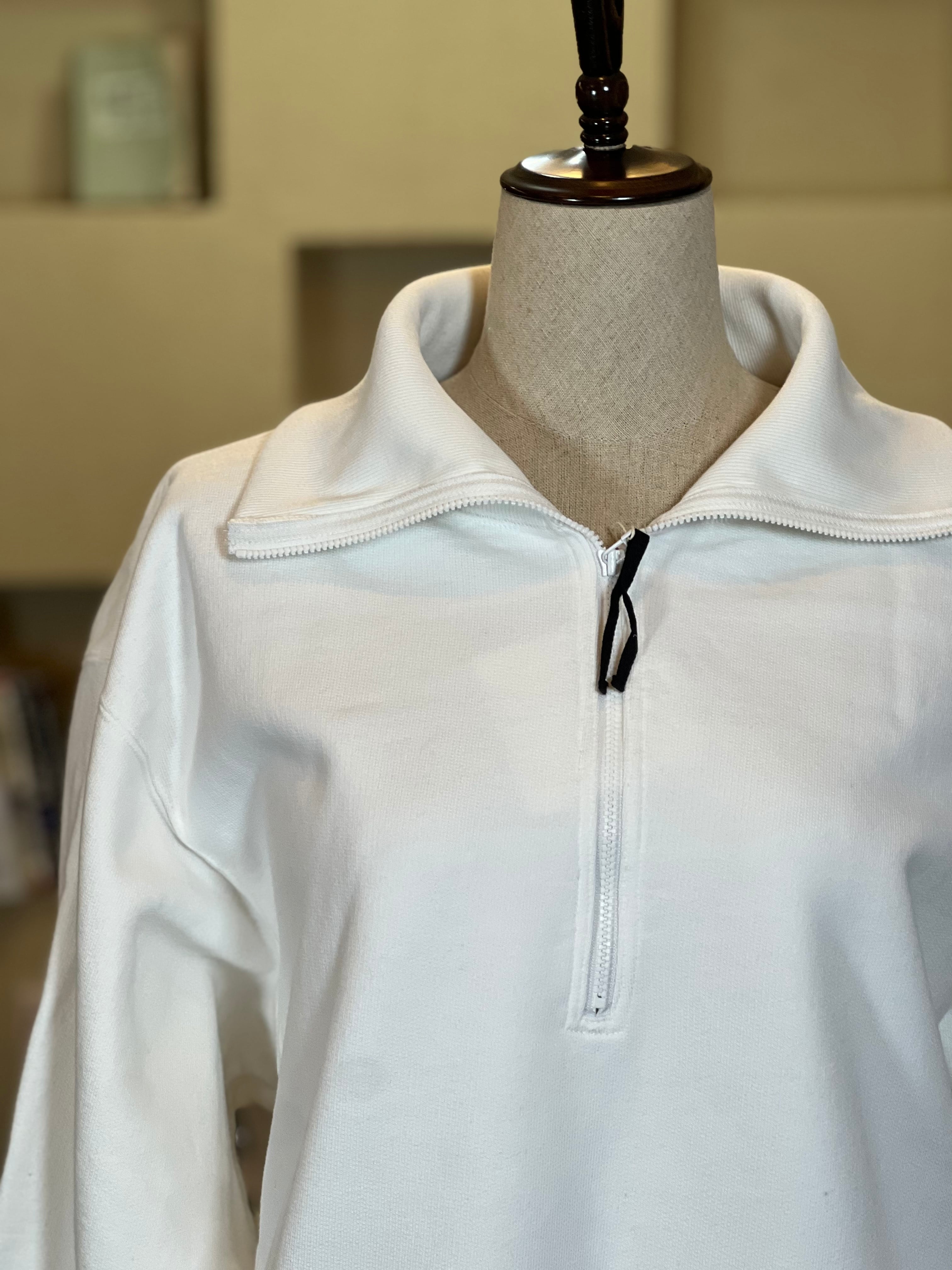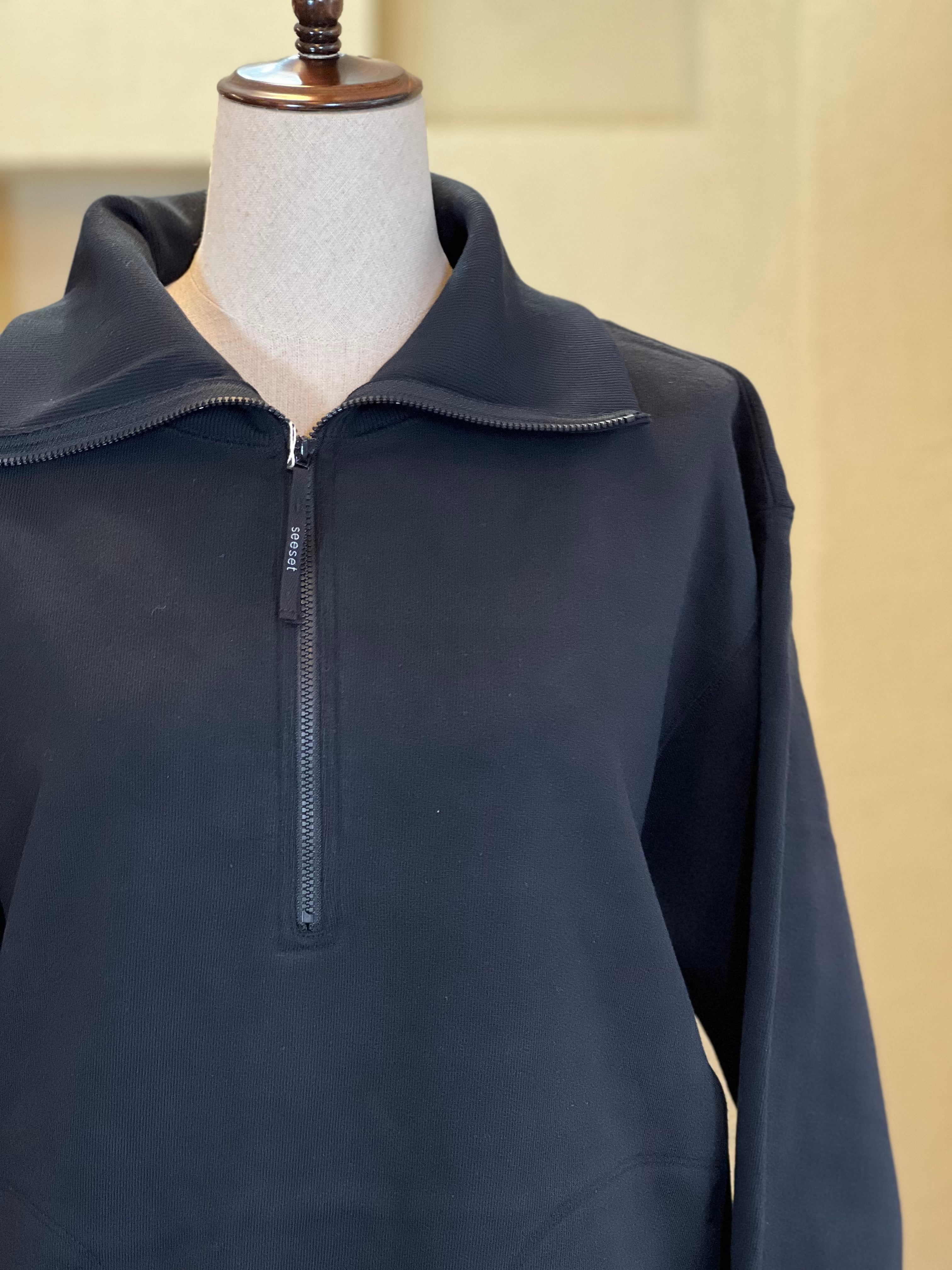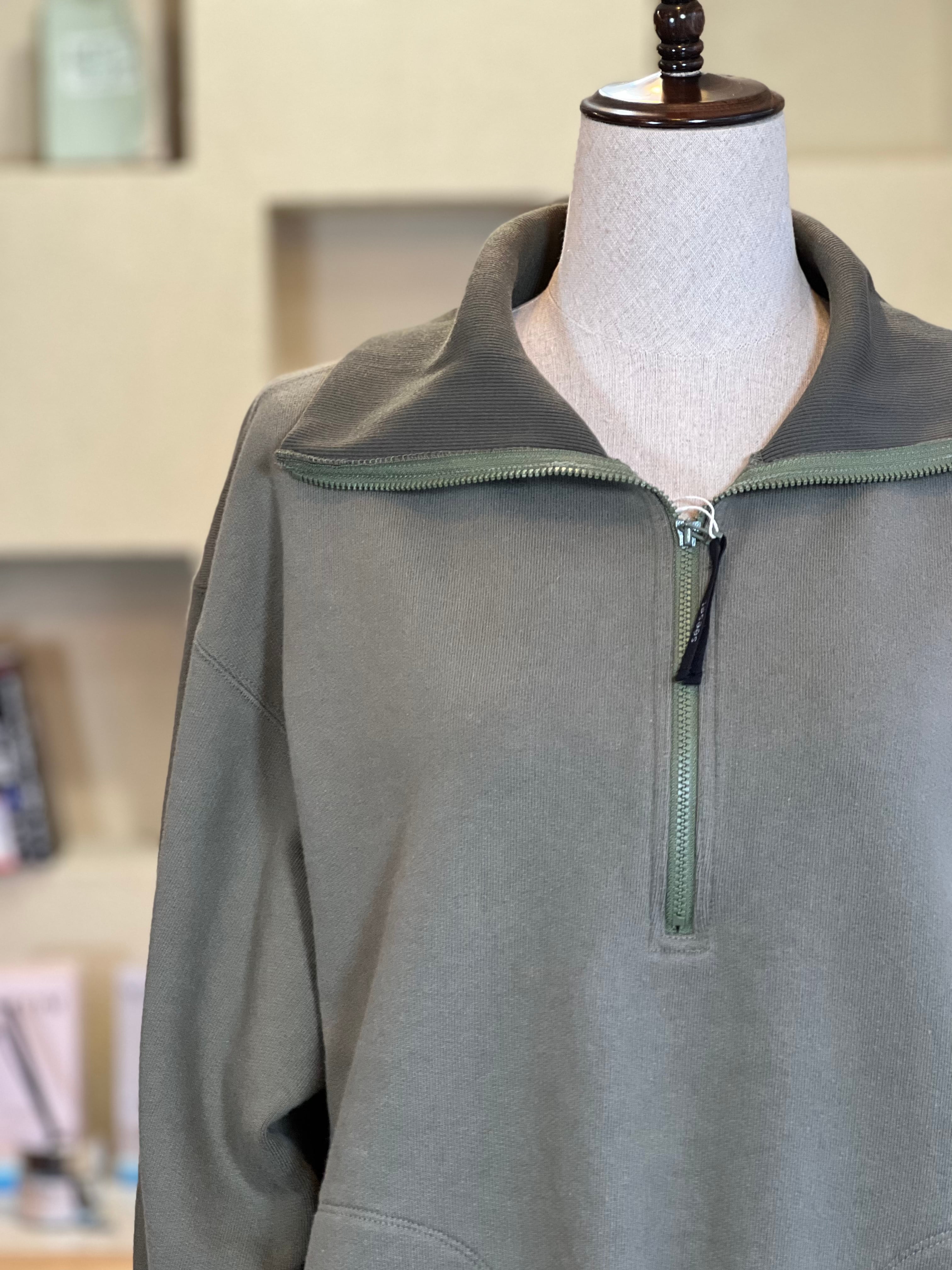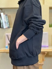 ハーフzip仕様で、一枚でも便利に着れるようハンドウォーマーとしても使用出来る腰ポケットをプラス