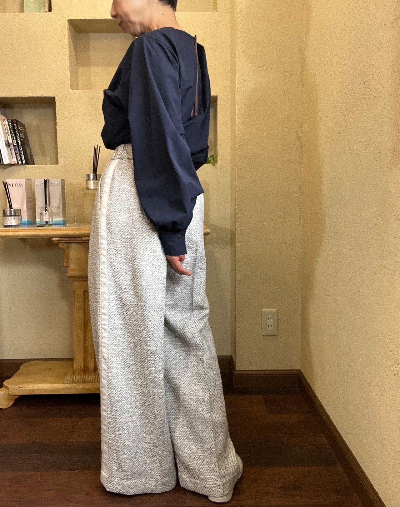 ウエスト後ろはゴム仕様のためストレスが少なく、きちんと見えしながらも快適に着用いただけます