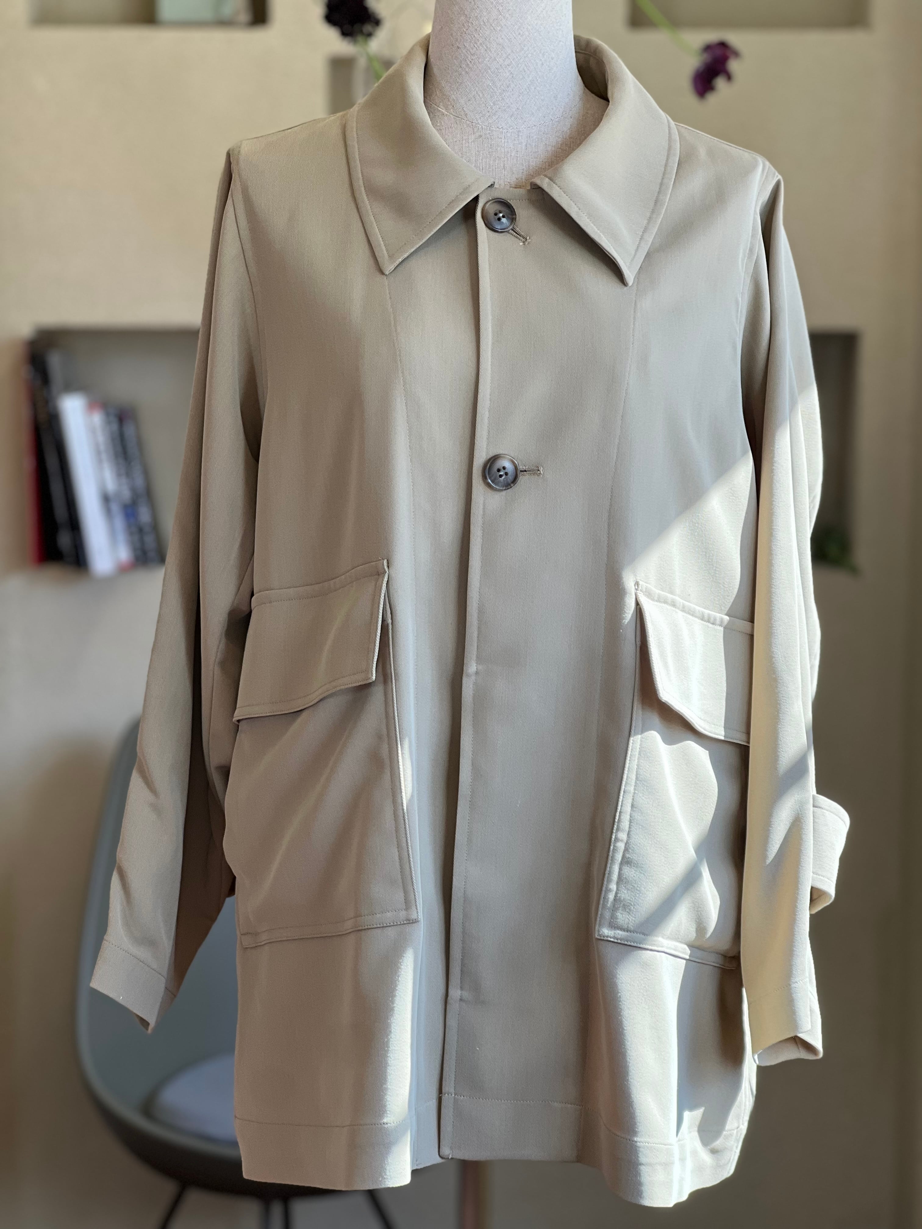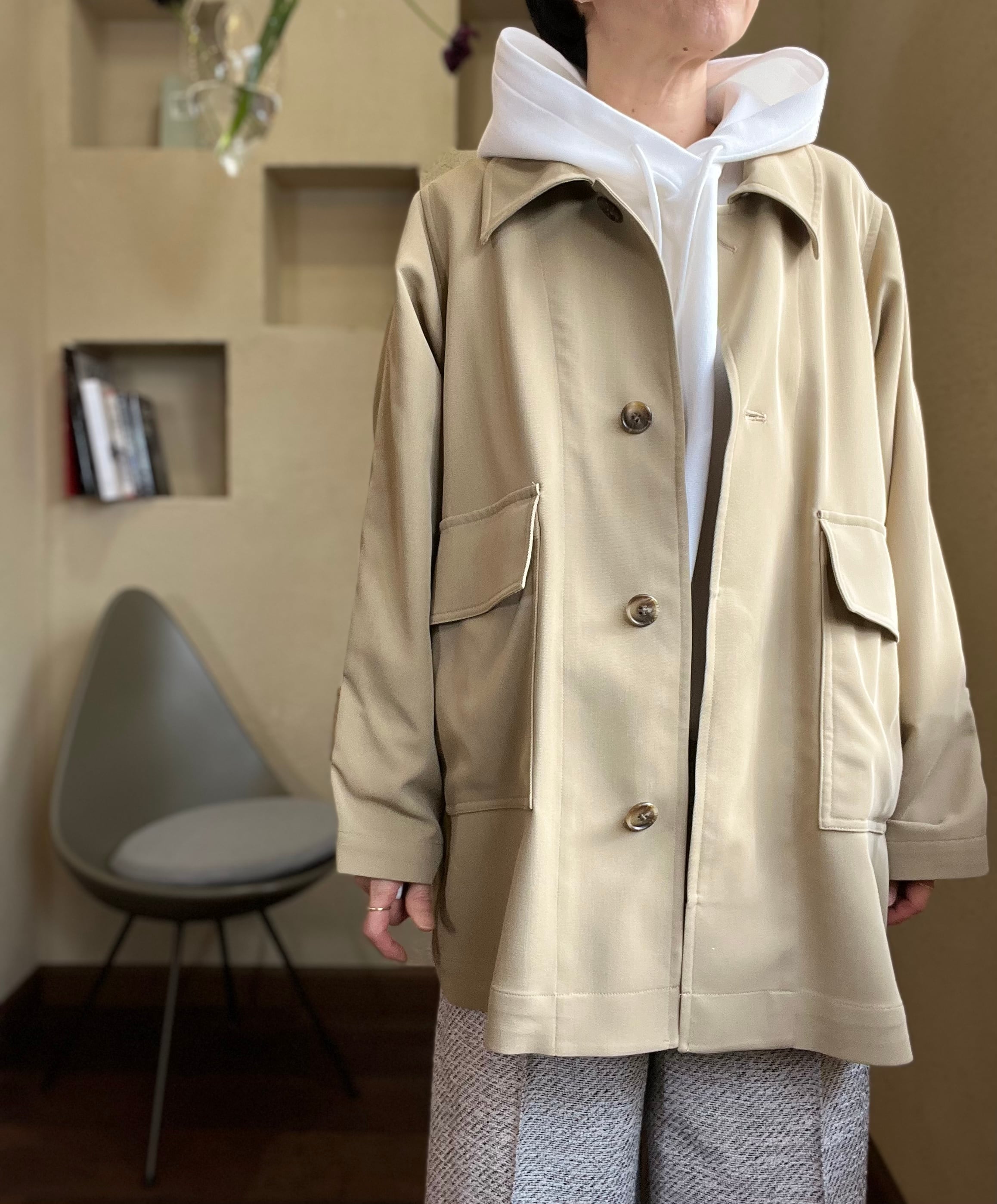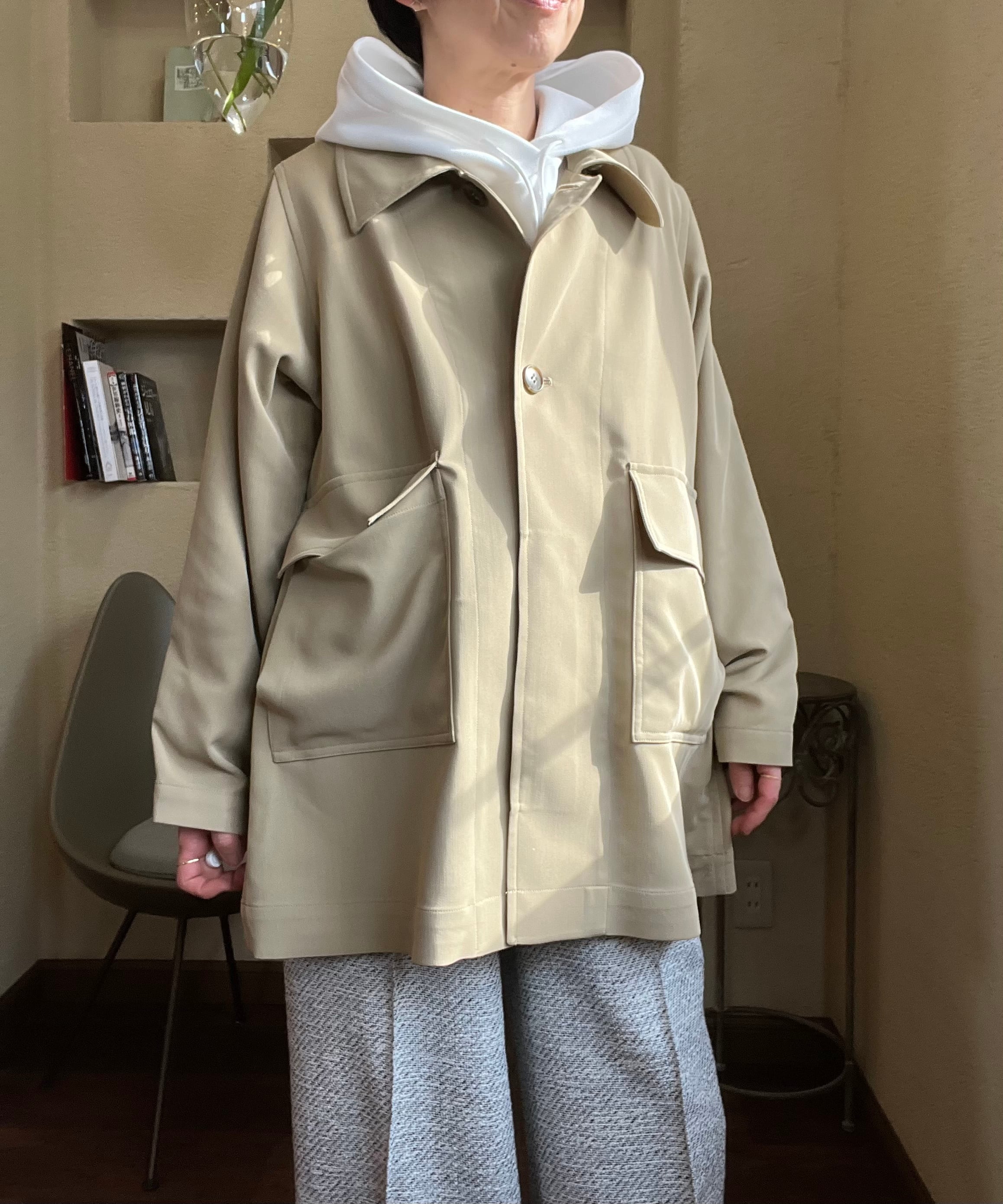 フロントの大型Wポケットも旅行など移動時にも役立つ道具服らしいコートに仕上がってます