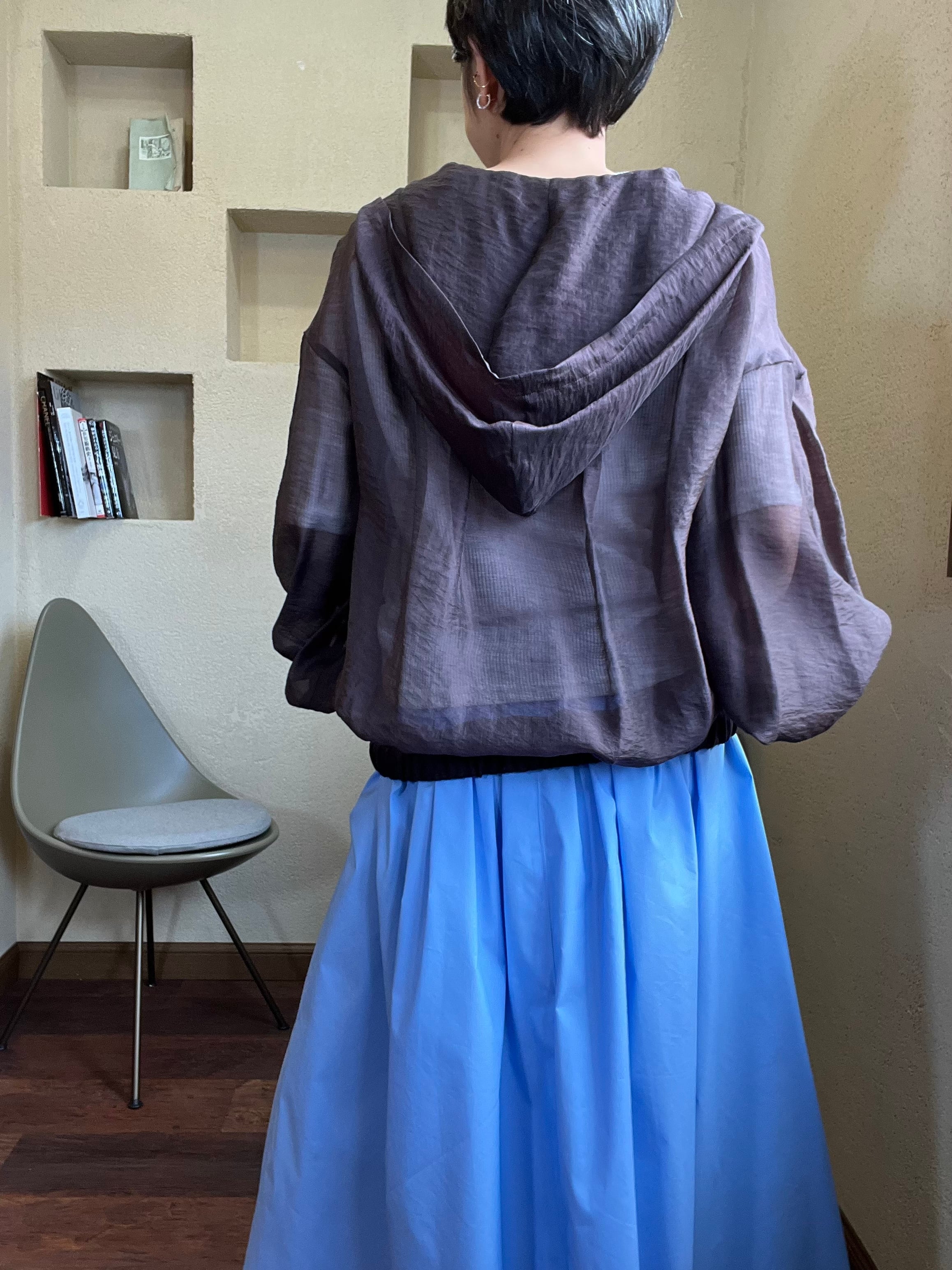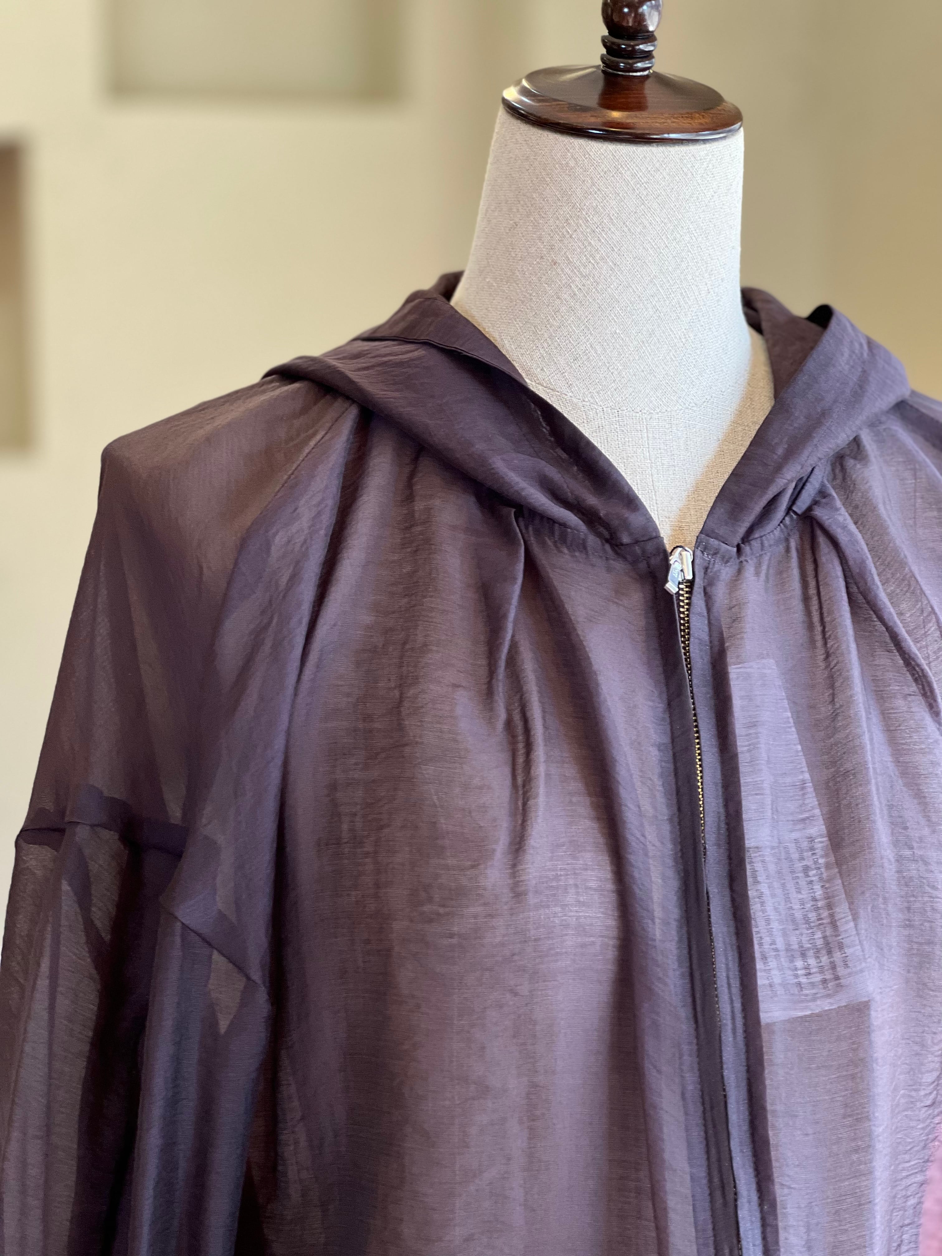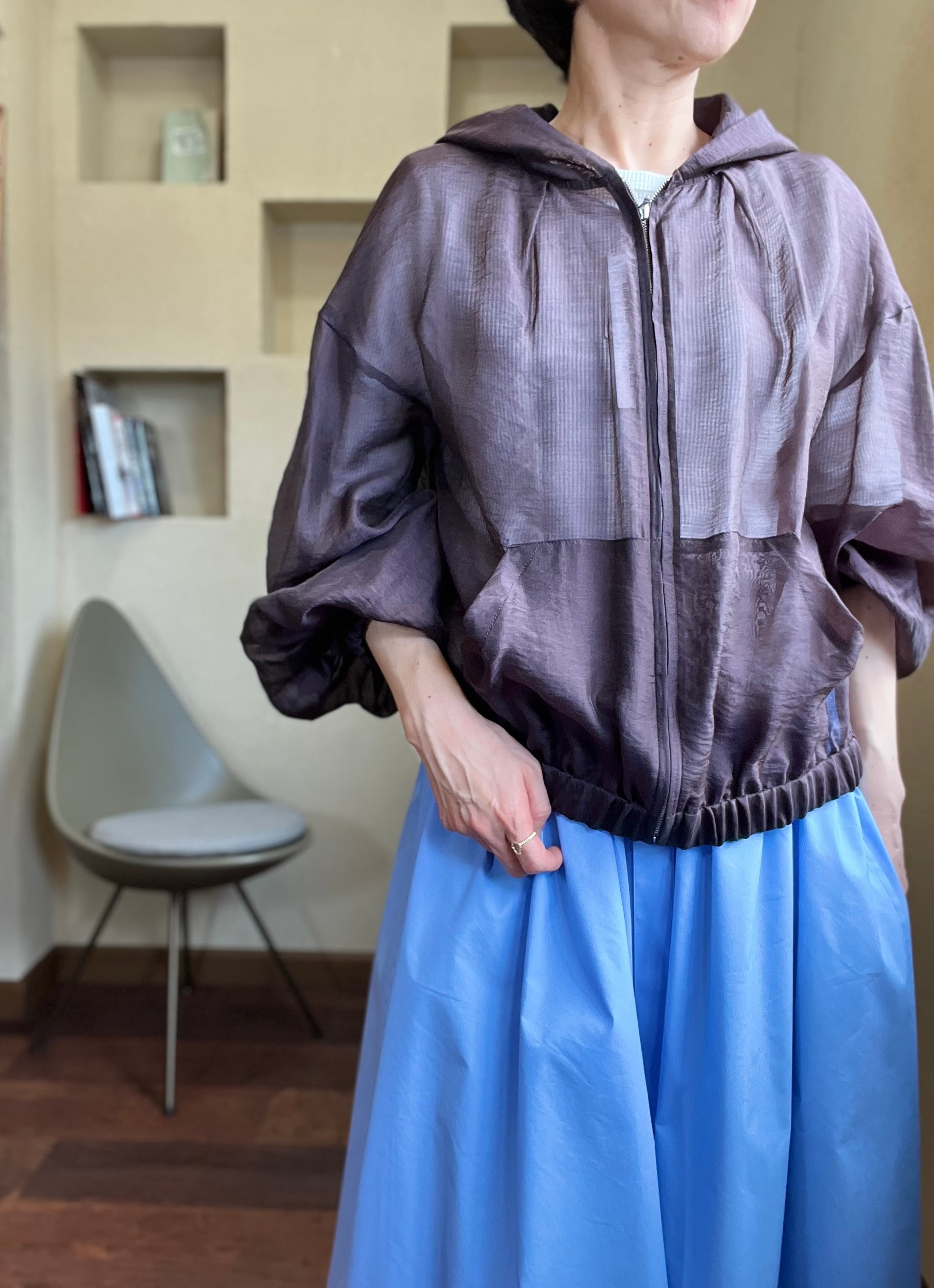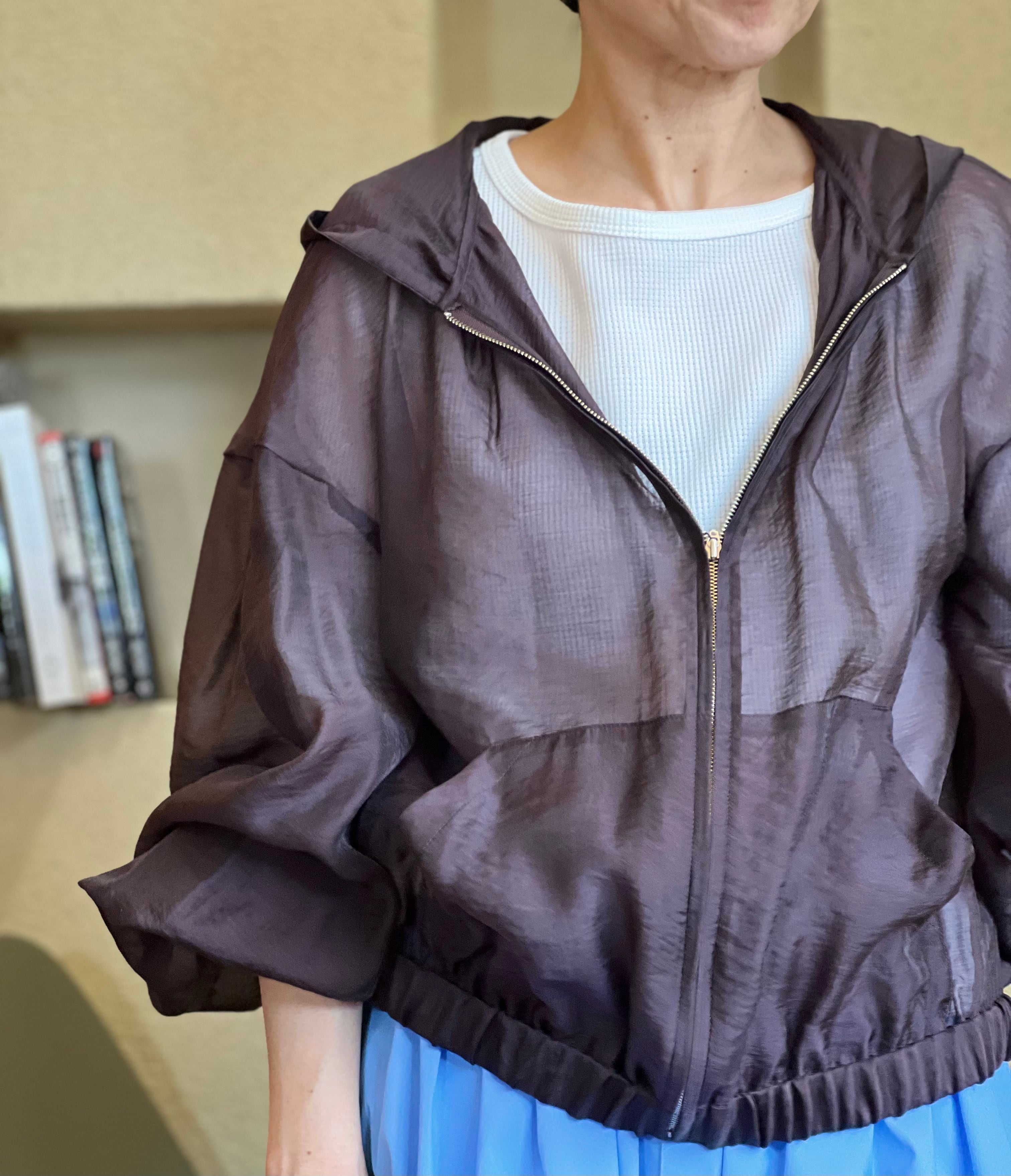 控えめな光沢感&シアー素材のボリュームジップアップフーディー