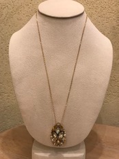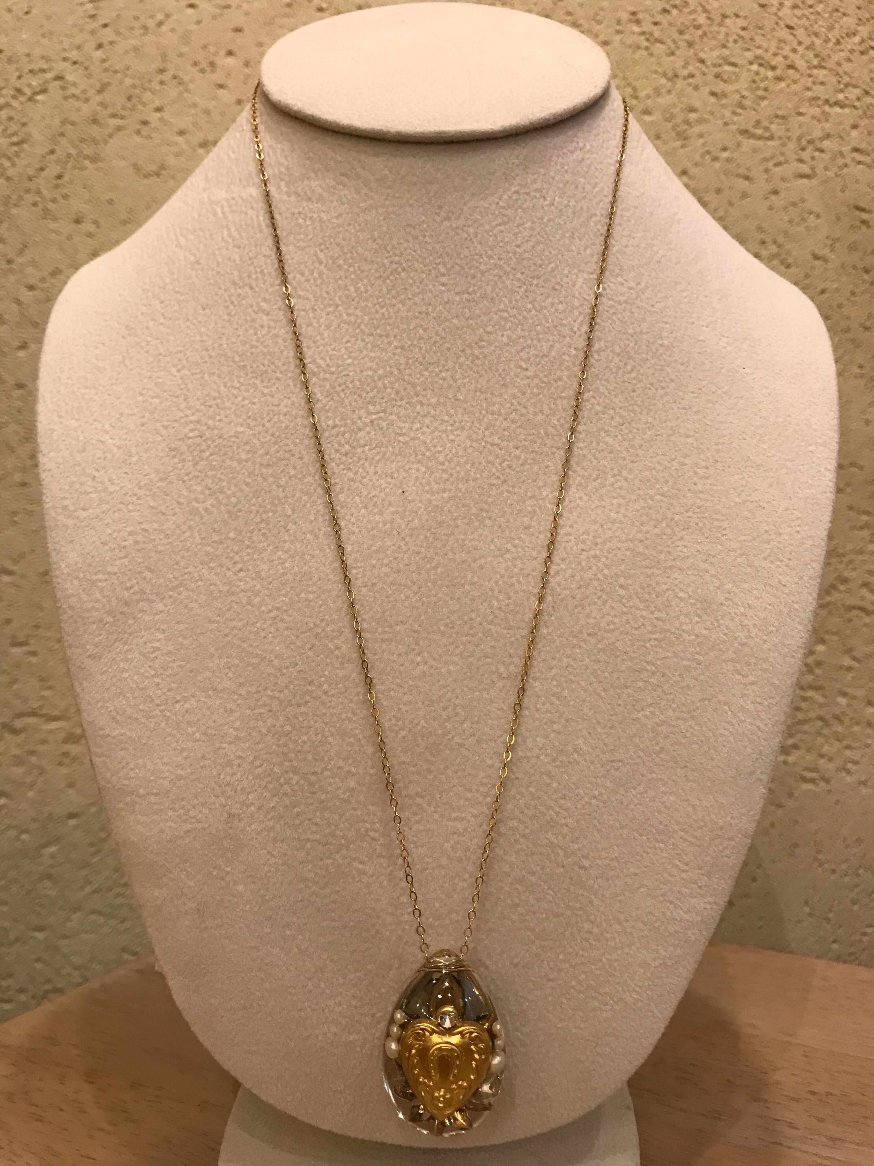 こちらはしずく型のトップの中にパール、ゴールド系のパーツが入っているネックレスになります。