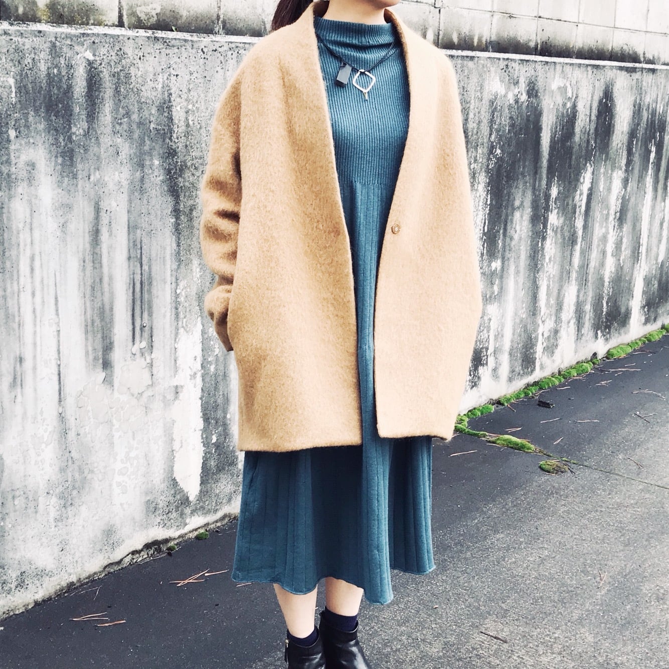 ノーカラーでスッキリとみせてくれ旬のタートルニットとの合わせは絶妙です。