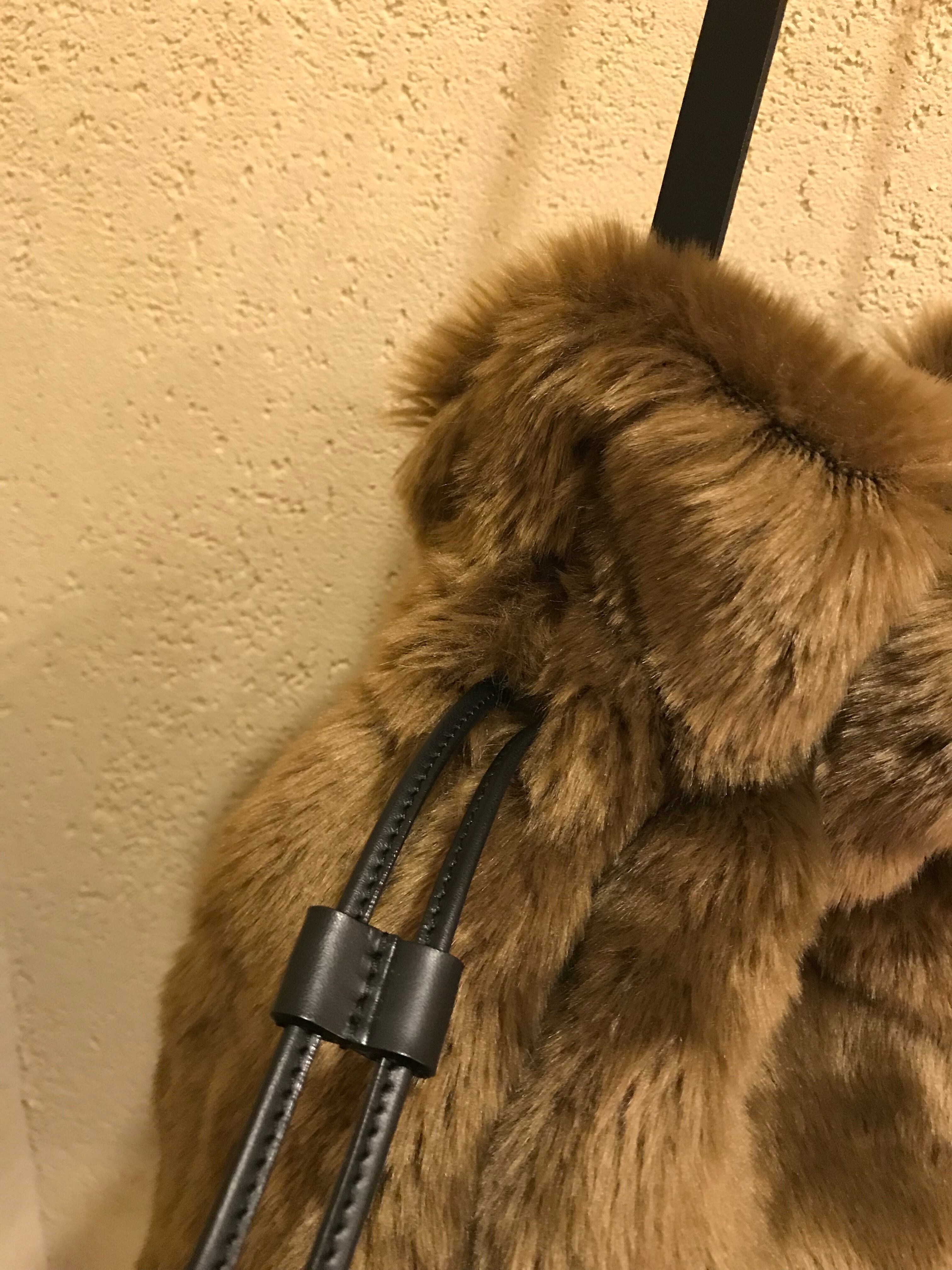 モコモコでやや大きめの巾着型バックが秋冬のお洋服のアクセントに。