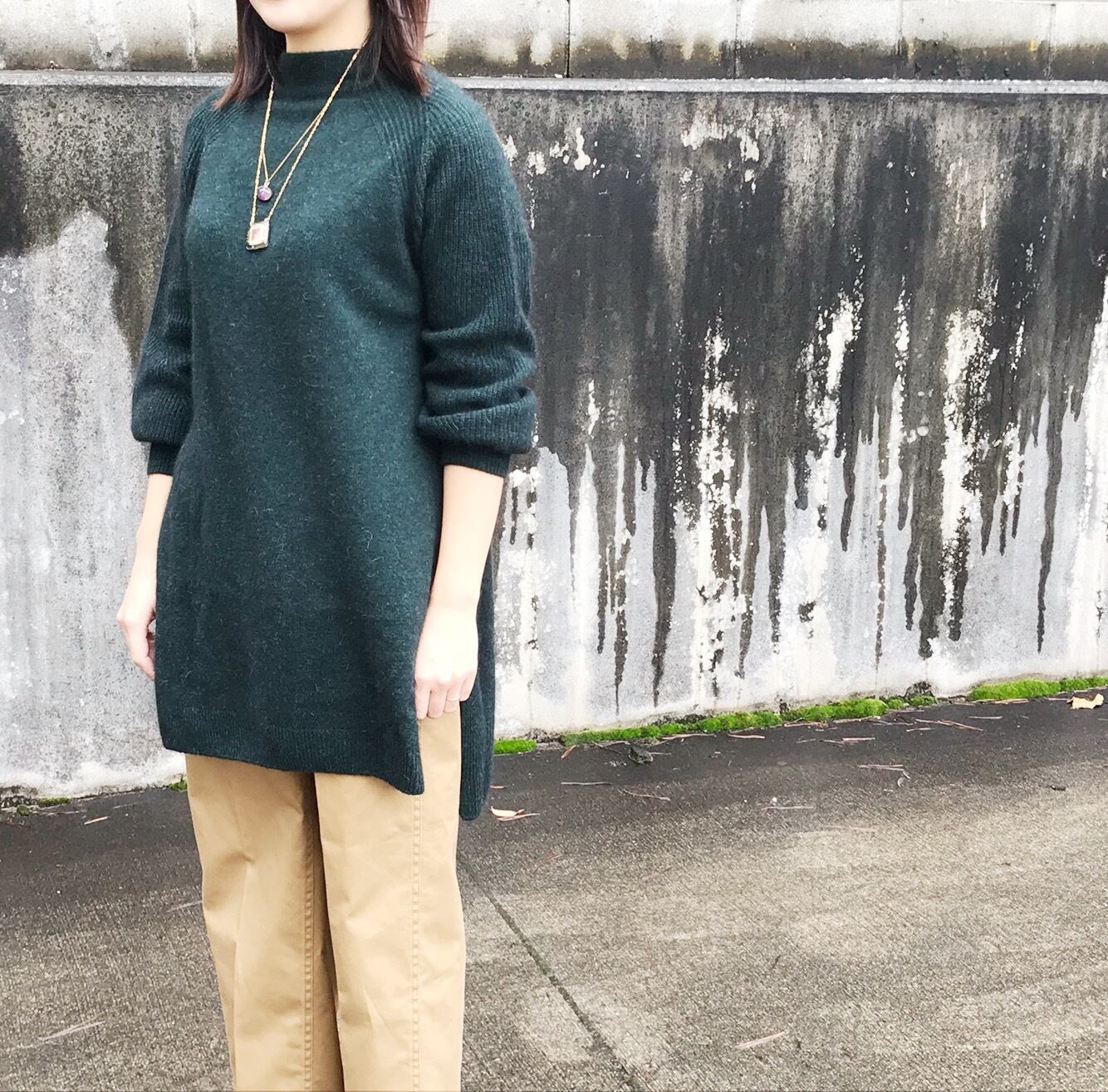 アルドリッジよりハイネックのミドル丈のニットプルオーバー。