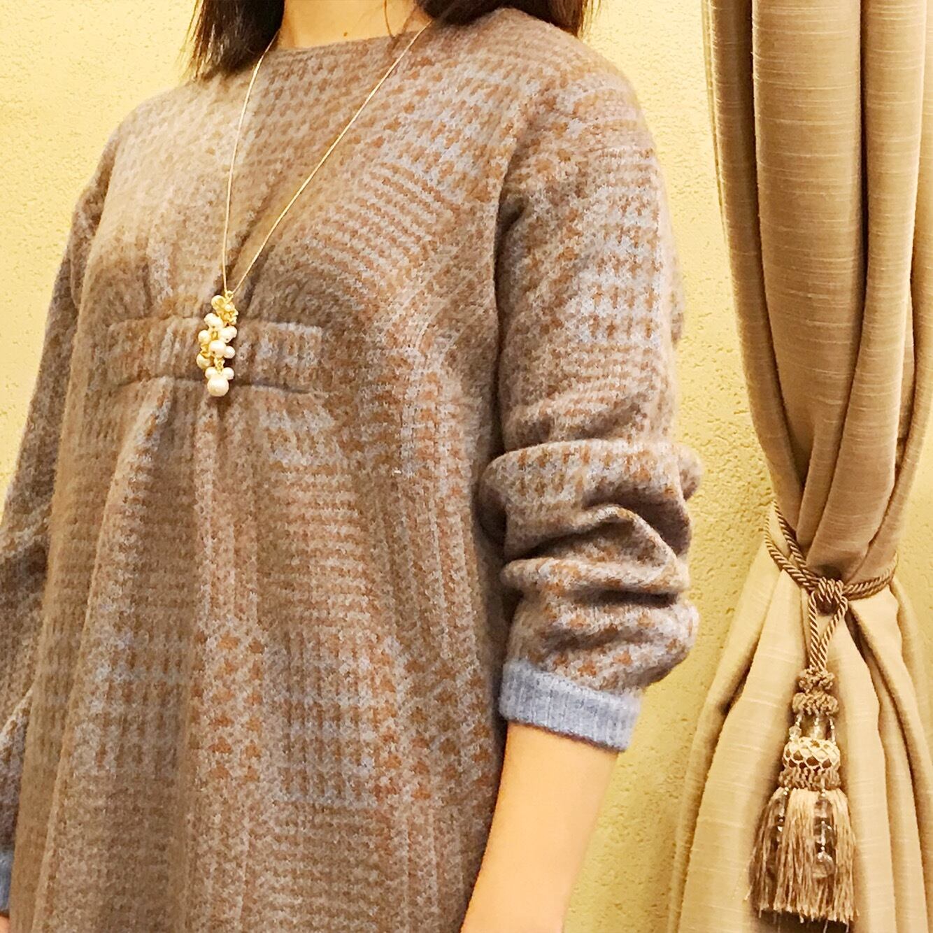 マドラスチェック柄のニットワンピース。