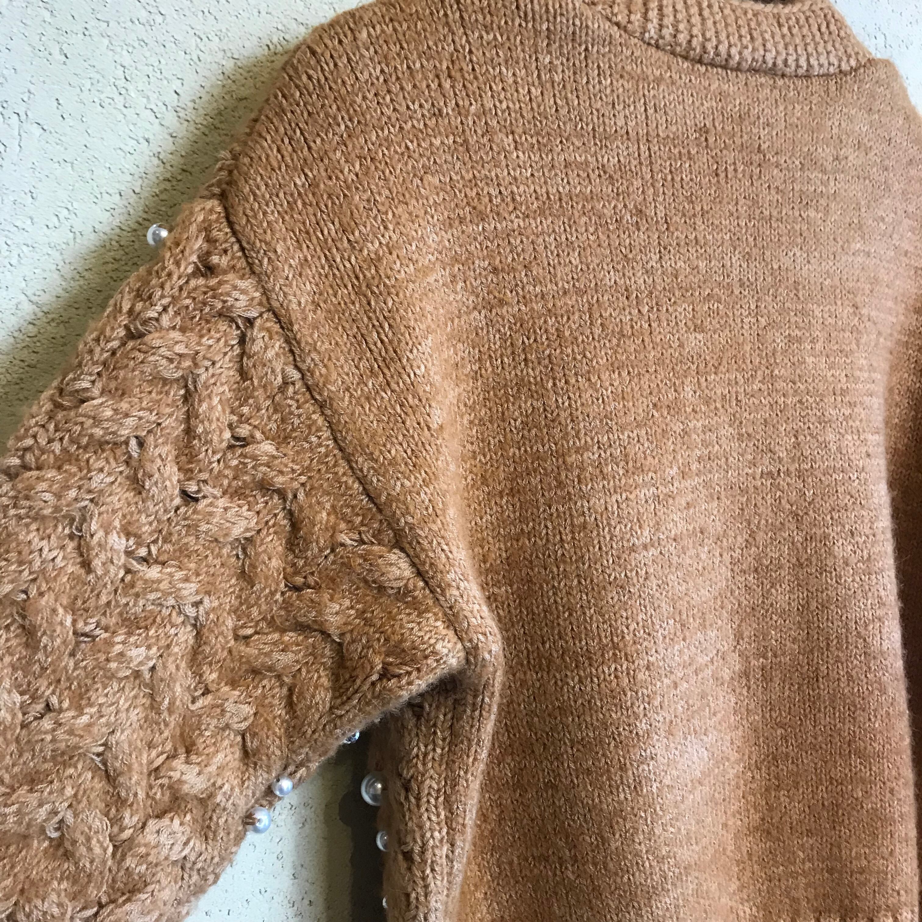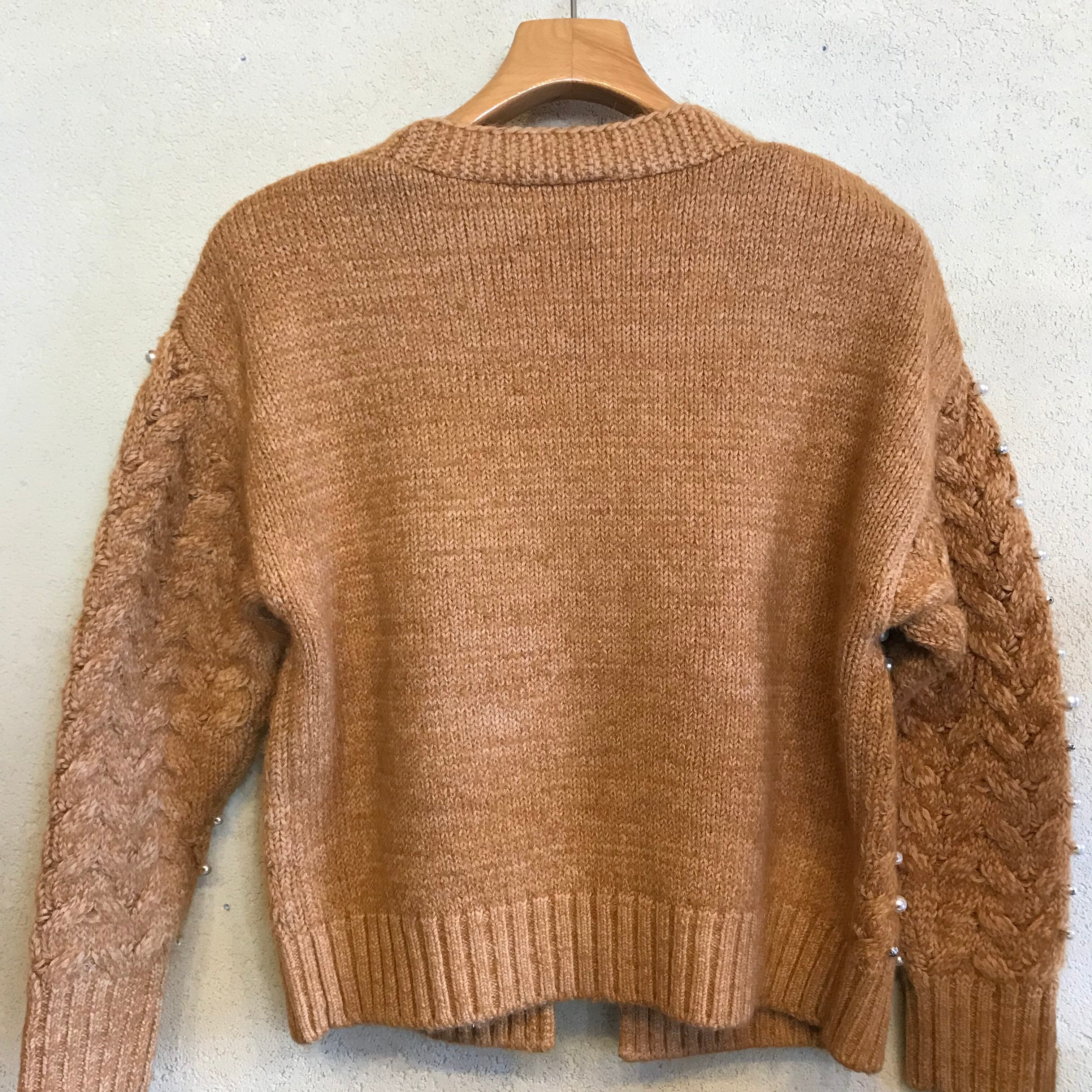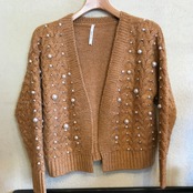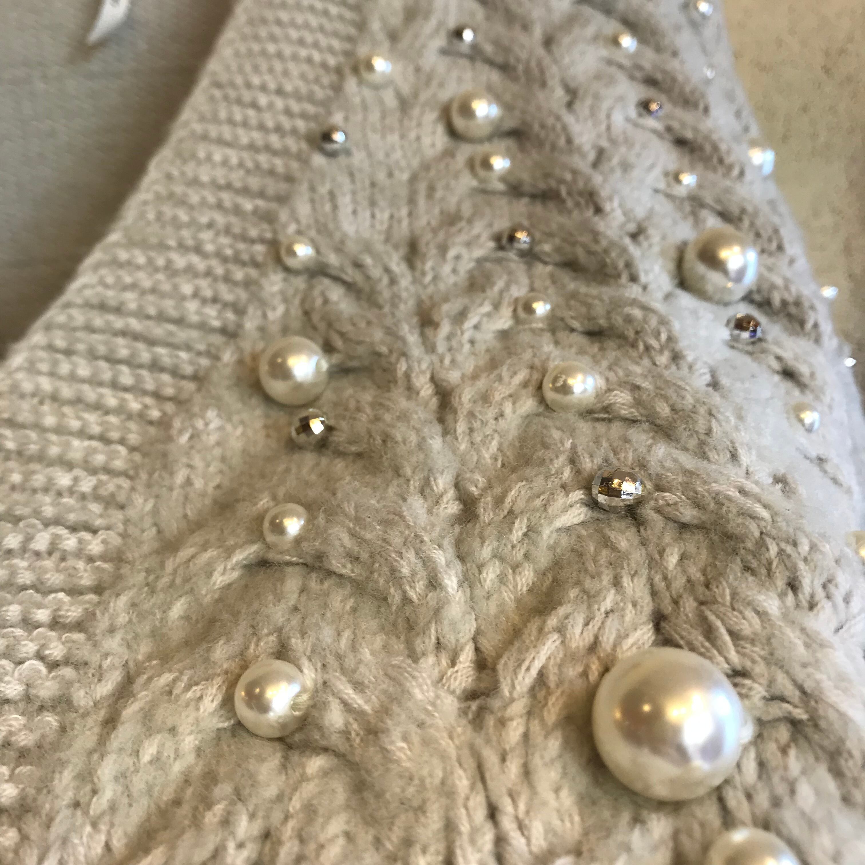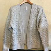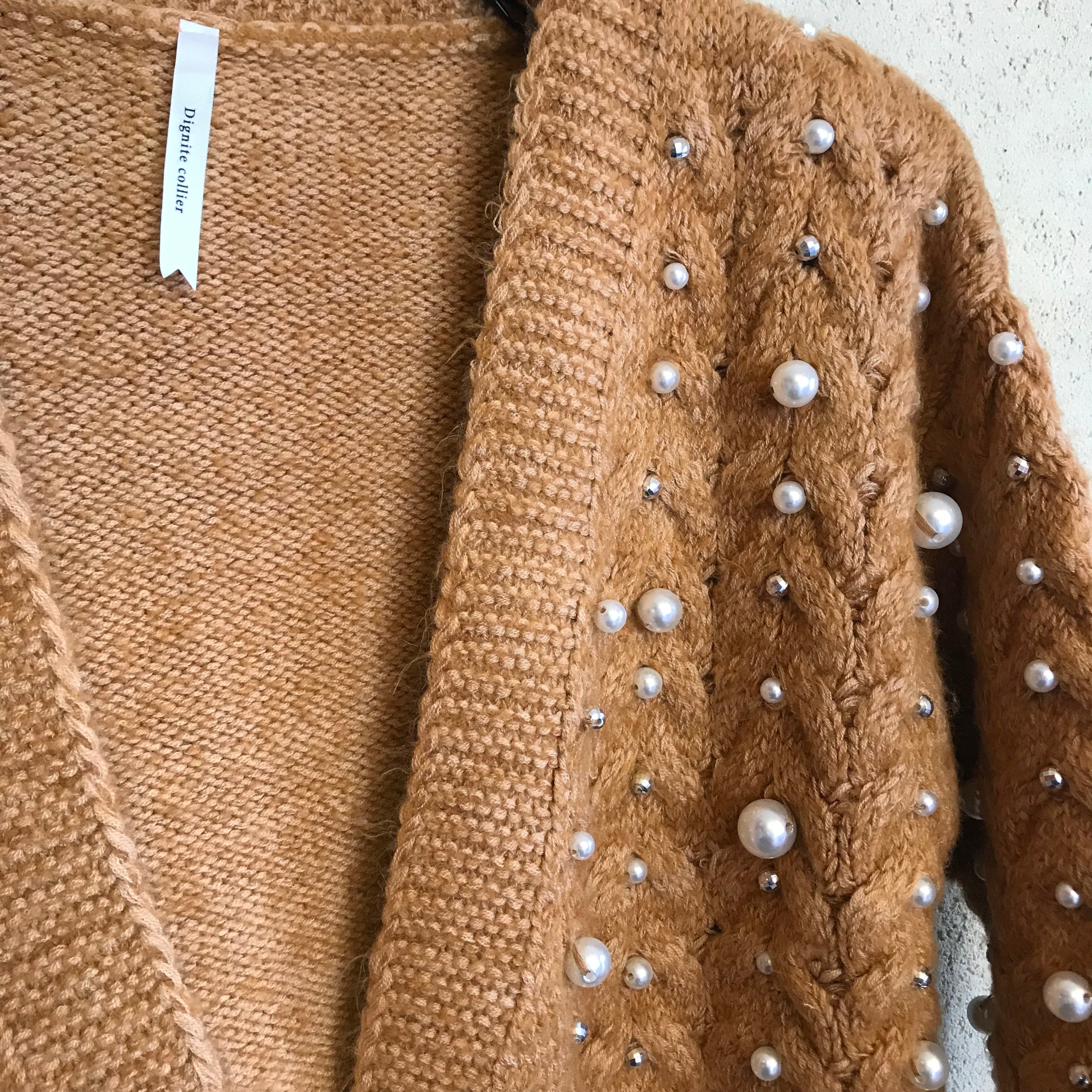 ざっくりと編まれたふんわりとやわらかなニットカーディガンはパールやビジューがあしらわれ