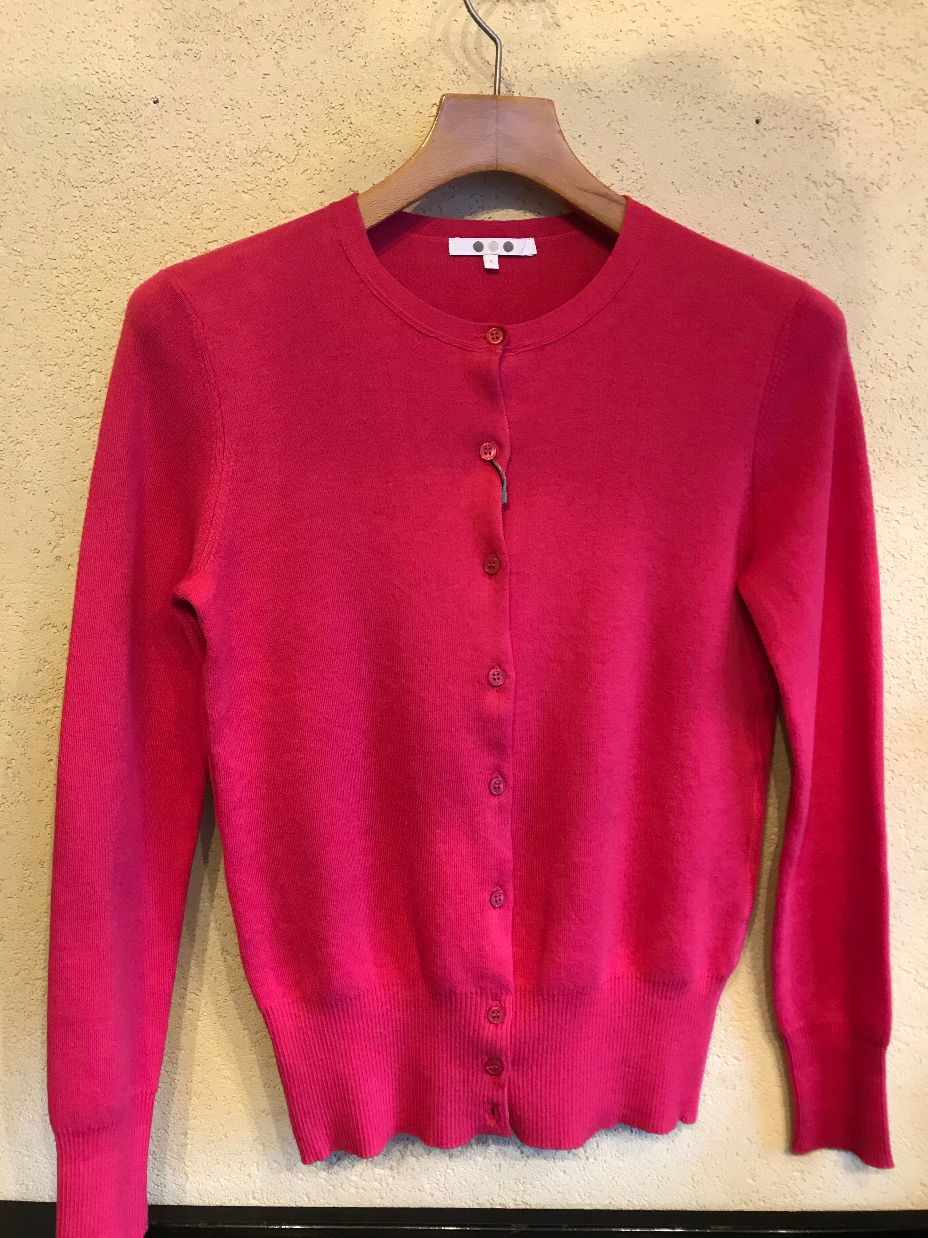 こちらはスリードッツのコットンニットカーディガン。肌触りもよくコットンとは気づかないクオリティ。コットンなのでシーズンレスでお使いいただけますね。