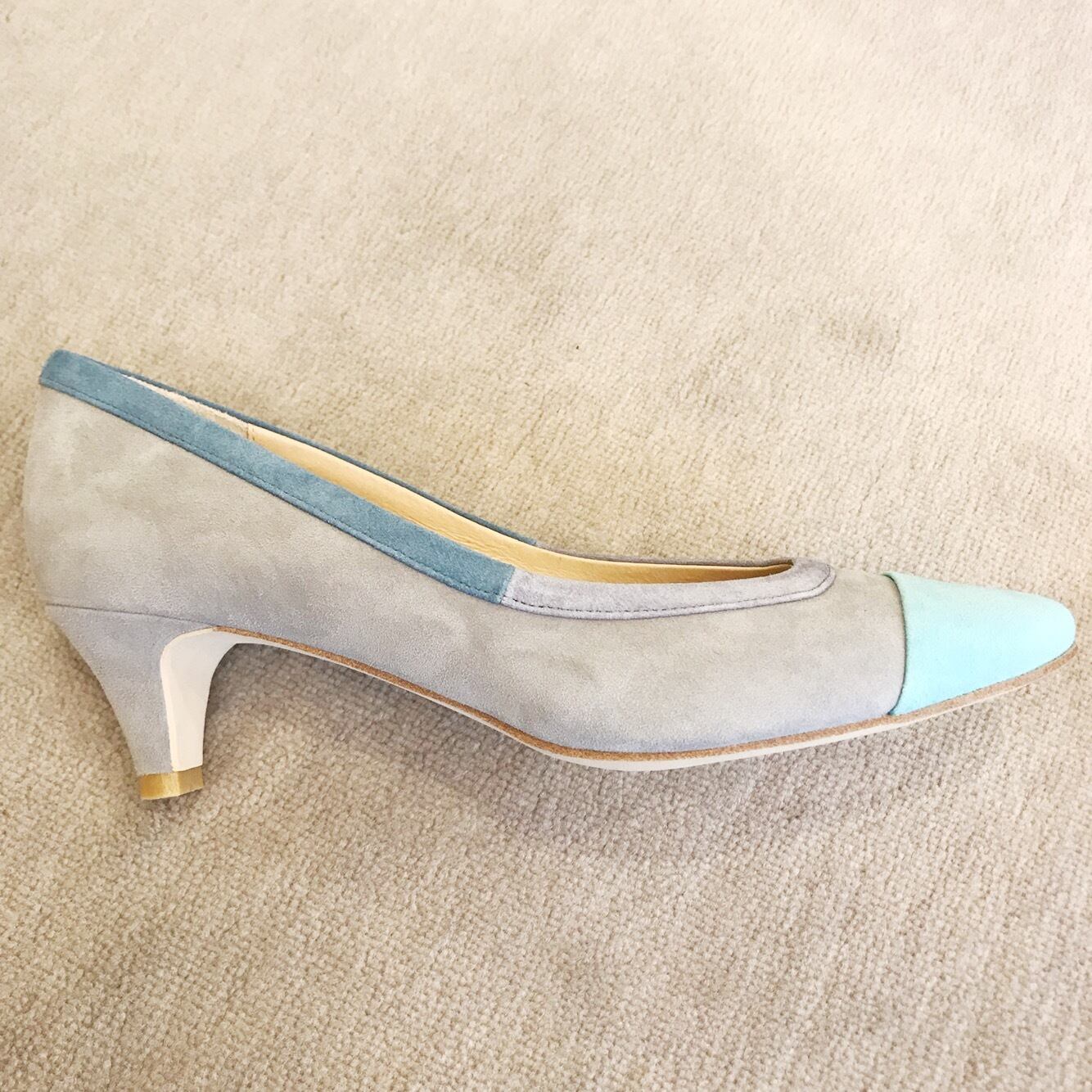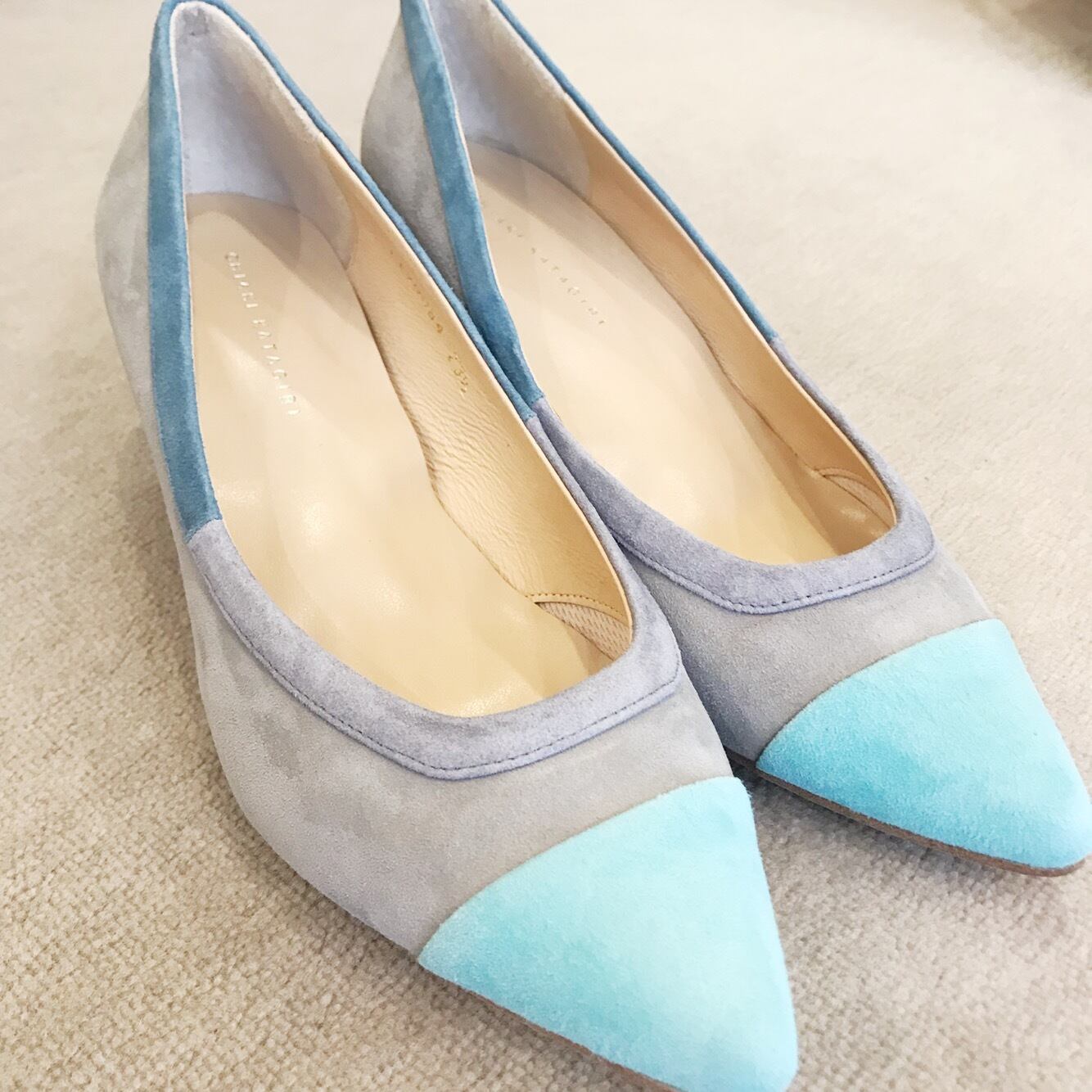 4色で配色されたスエード素材の春らしいパンプス。ヒールは約5.5センチ。