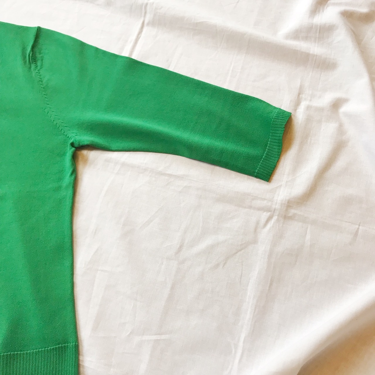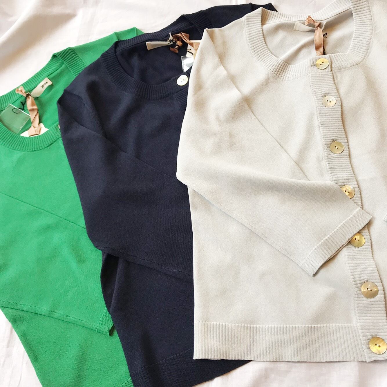 jeune よりシャリ味のある七分袖のカーディガン。