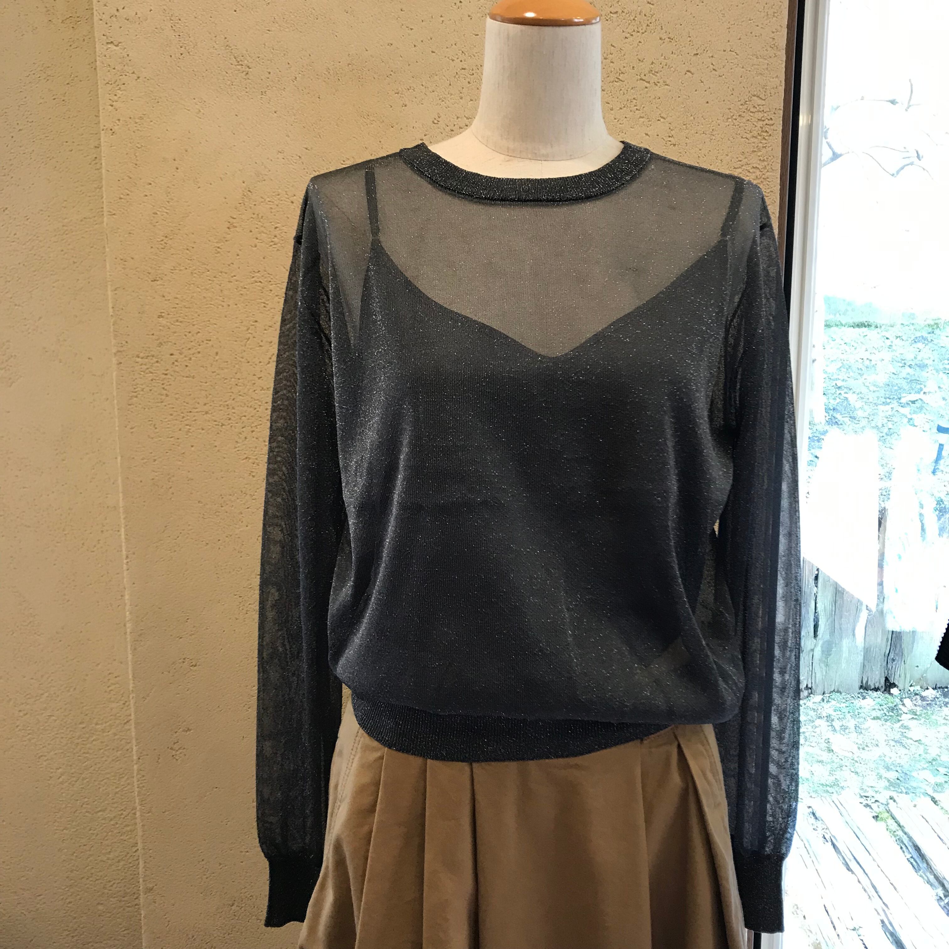 トレンドのシアーな素材と上品なラメ感で、スタイリングに今を呼び込むプルオーバーニット。着なれたクルーネック型も、素材の変化で華やかアイテムにアップデート!艶やかなサテン素材のキャミソール付きかつ、前後どちらでも着られる2WAY仕様で多彩な着こなしが楽しめます。ラウンドにカットされたキャミソールの裾は、敢えて出して着るのがポイント。