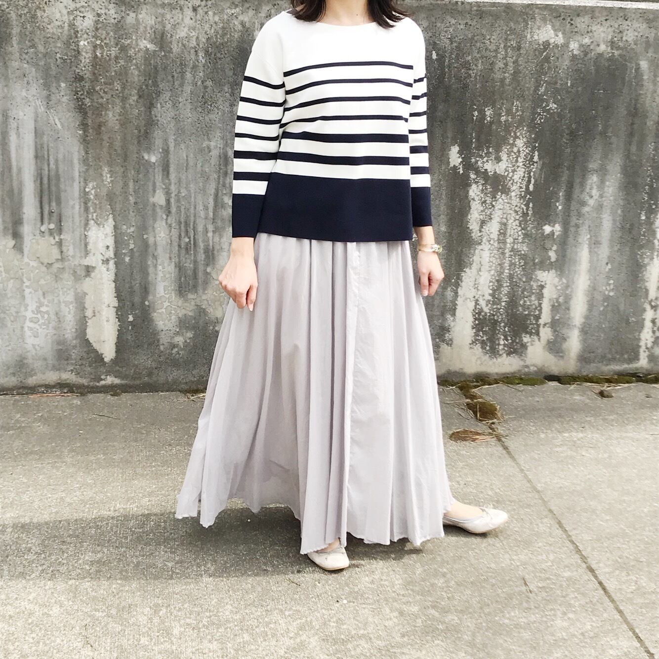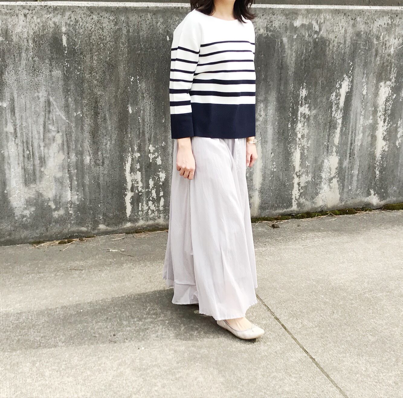 ピッチの違うボーダーデザインのコットンニット。お袖は手首がのぞく長さ。