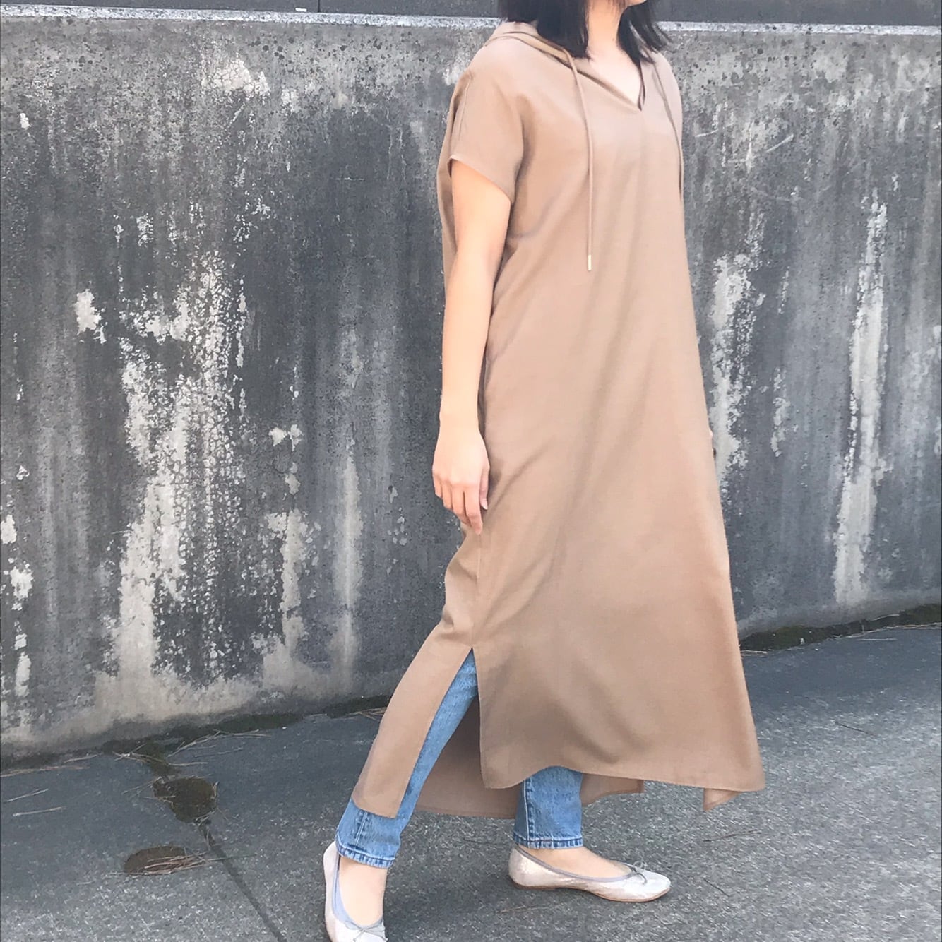 ツヤのある生地を使用したフーディーがかわえロングワンピース。