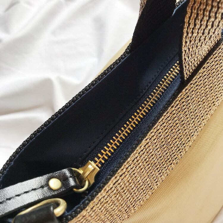 内側にはファスナー付きポケットが1つとミニポケットが2つ付いています。【実寸】F(フリー)(縦23cm×間口横幅36cm、底幅18.5cm×マチ18.5cm、ハンドル27.5cm、ショルダー69〜122cm)【素材】ナイロン【生産国】Japan