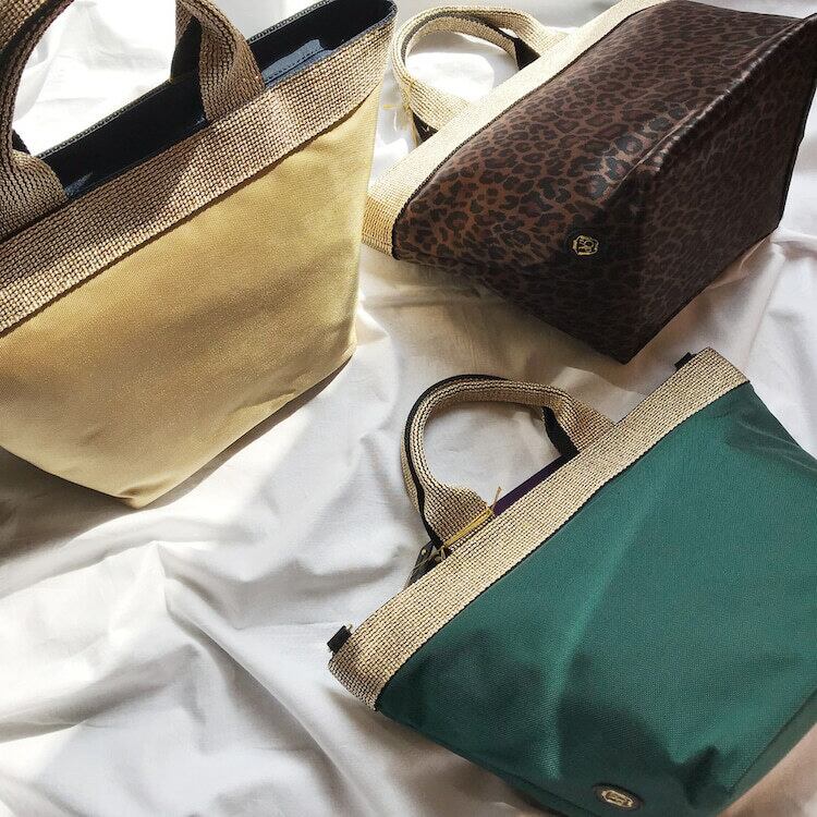 ラメテープを配したバッグ上部とハンドルがゴージャスなアクセントに♪