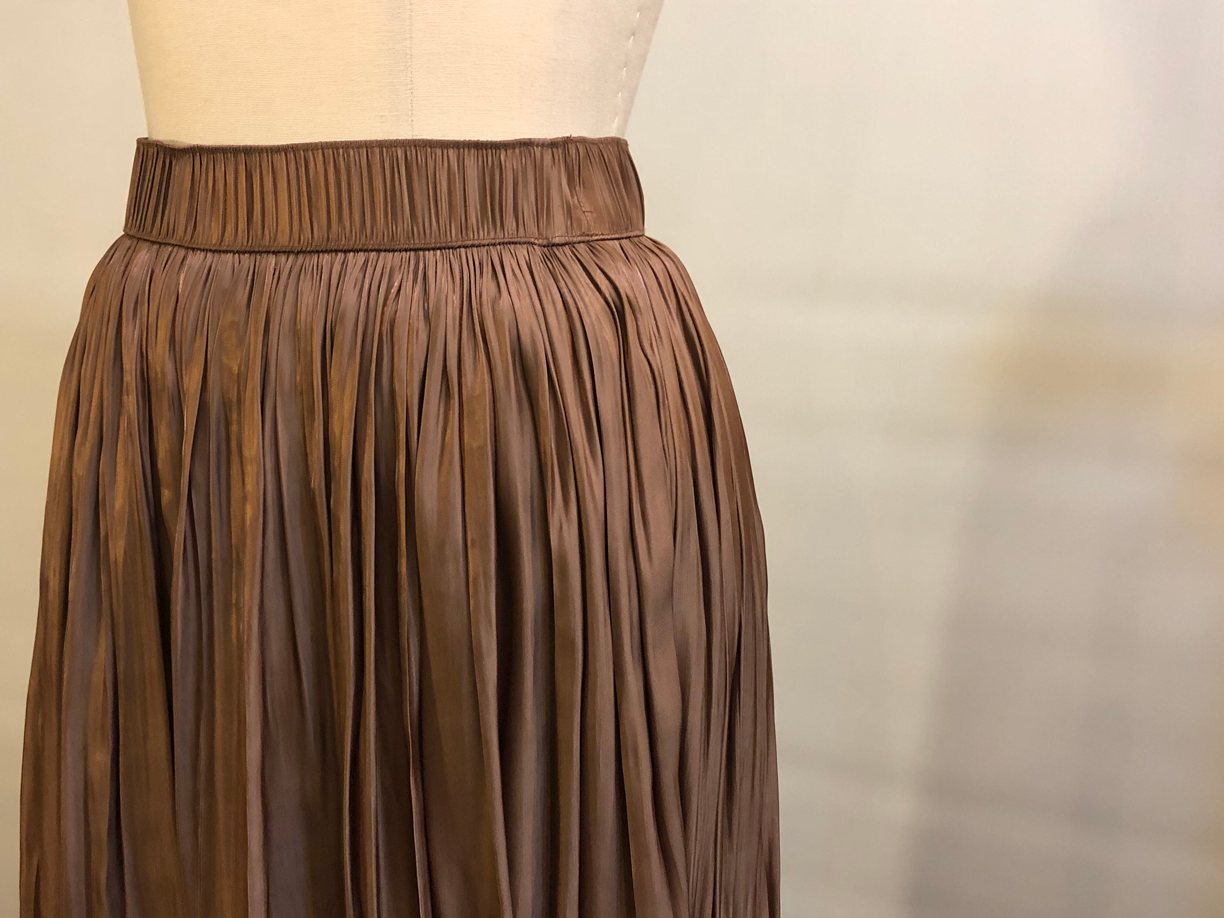 ボリュームは抑えられた、縦長ラインのプリーツスカート