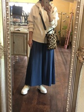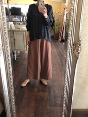 スカートにも見えるワイドパンツ、着丈長めのトップスのインに合わせるコーディネートもおすすめです。