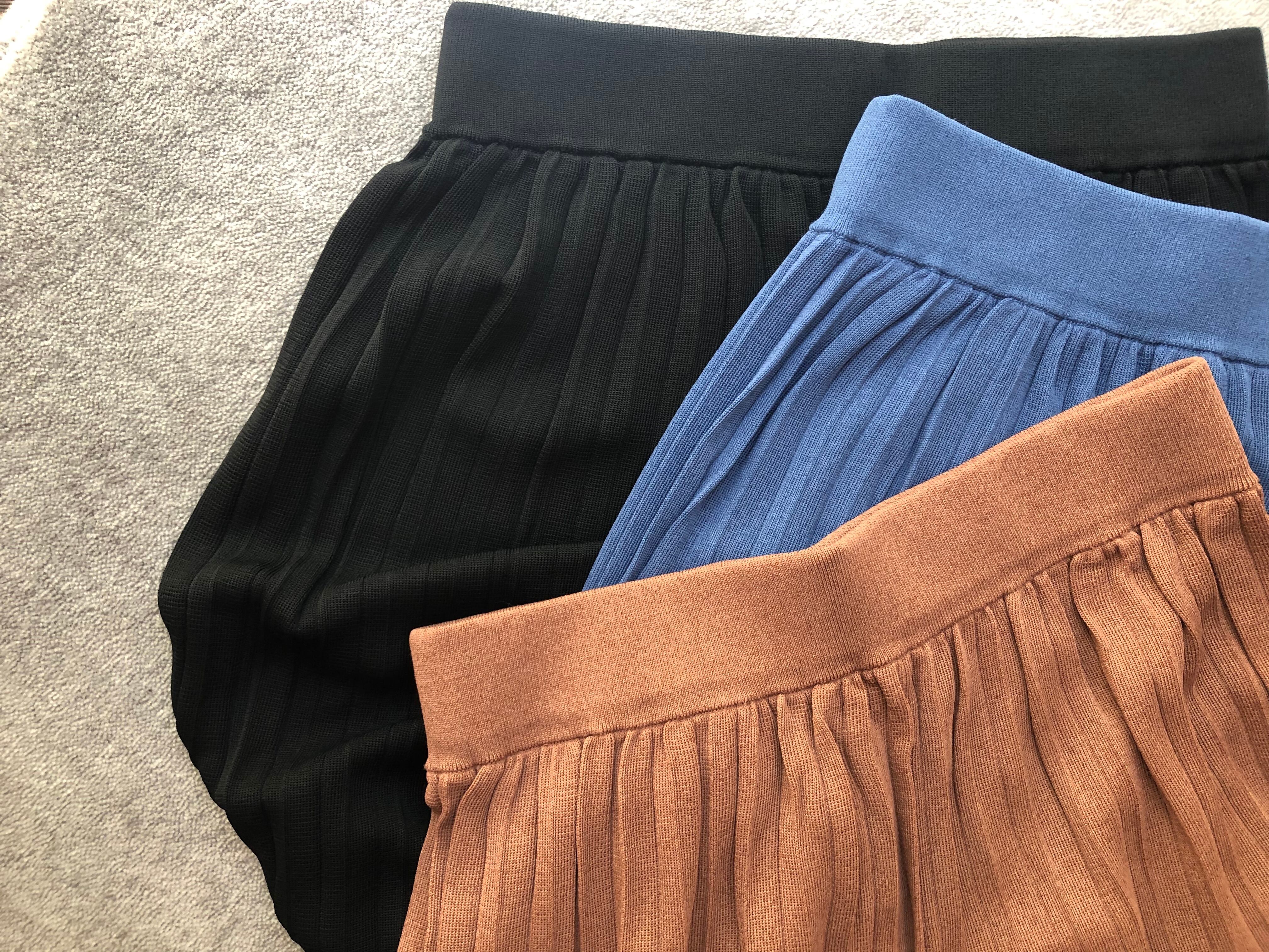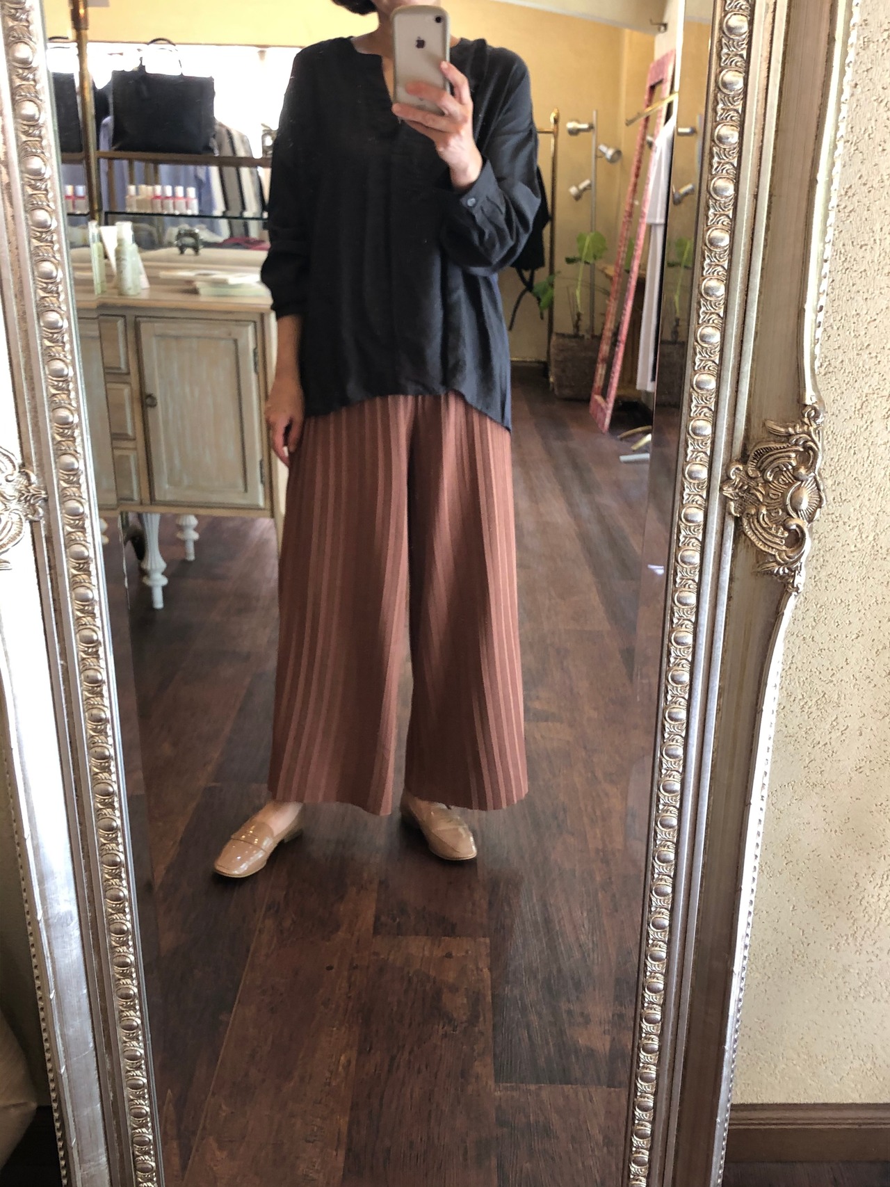 ニット素材のプリーツパンツ。アセテート、ポリエステルのサラサラとした肌触り。