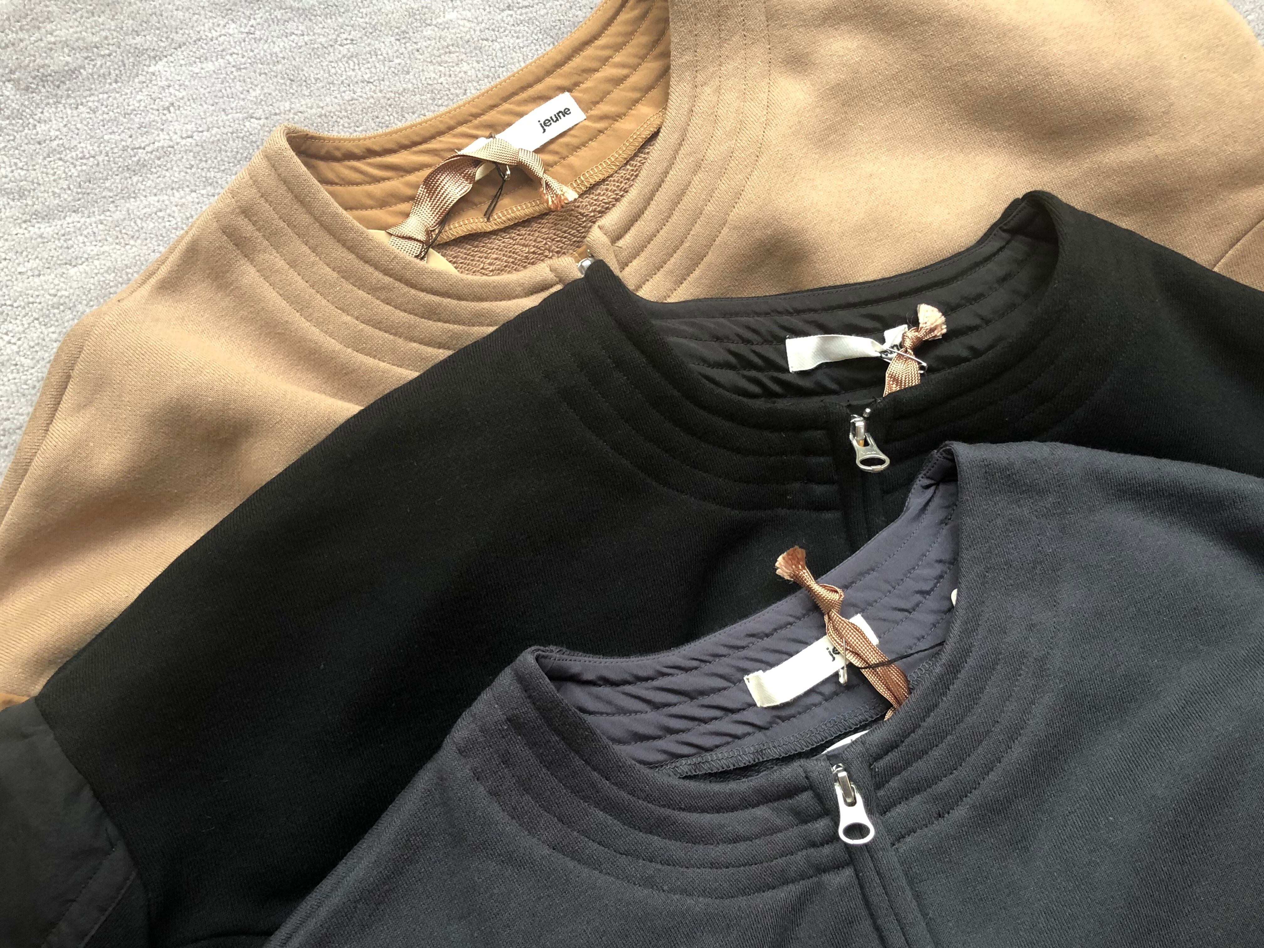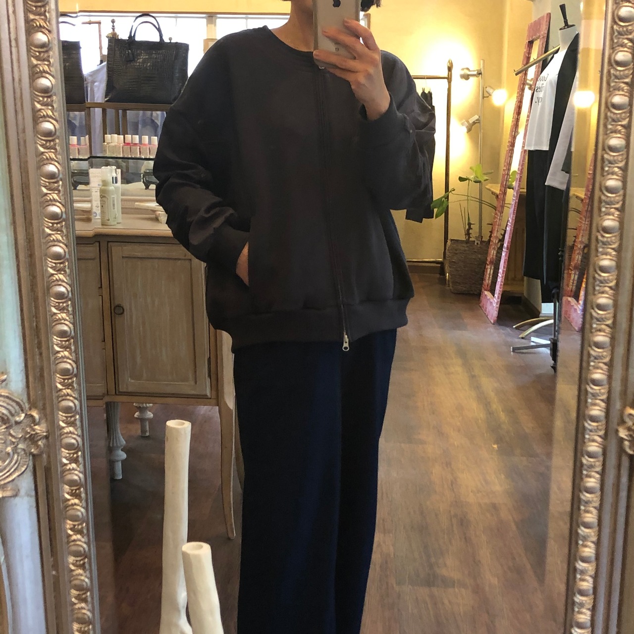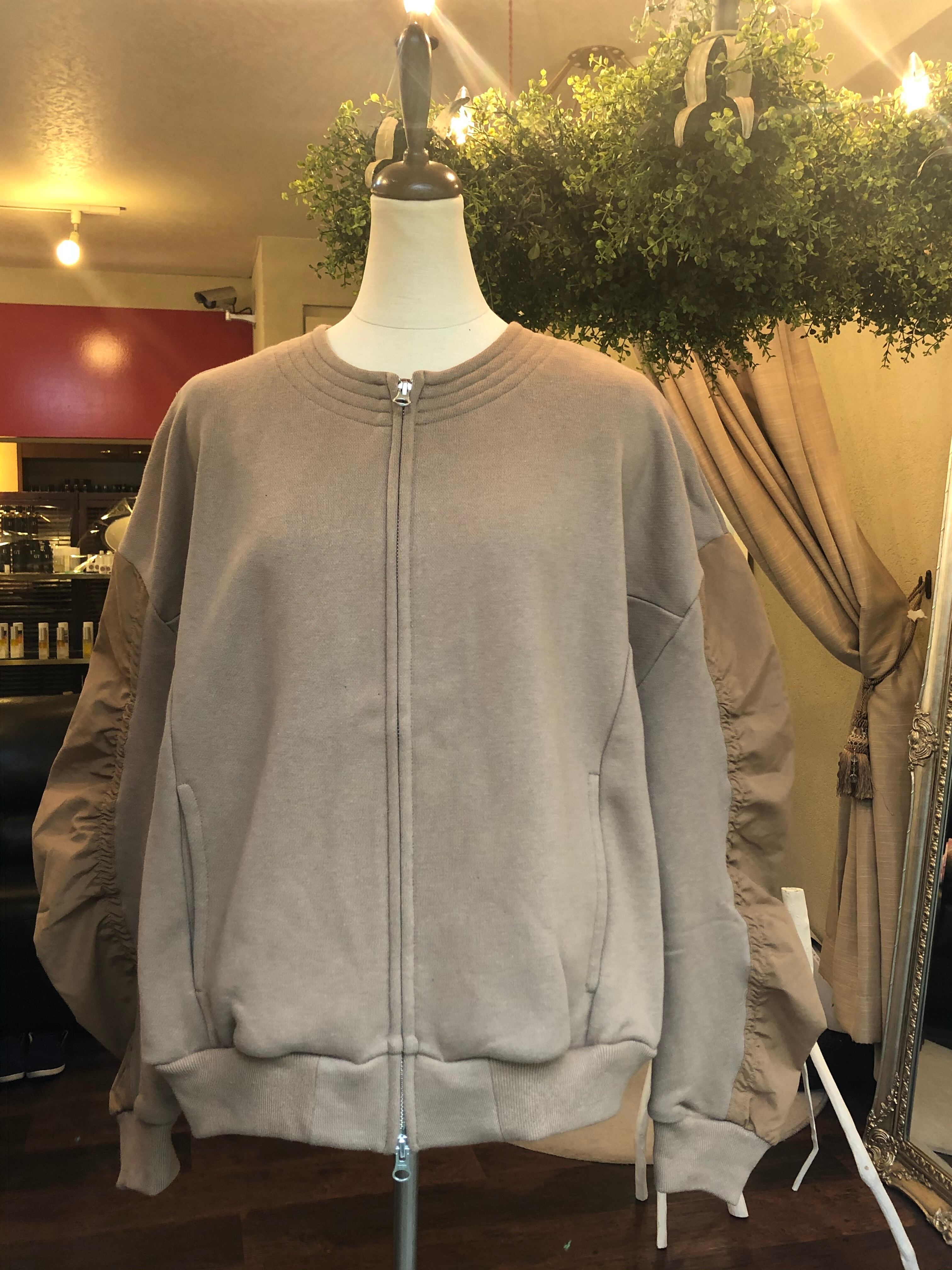 デイリーに着用しやすいスウェット素材。袖に異素材を組み合わせ、シャーリングが寄ることで