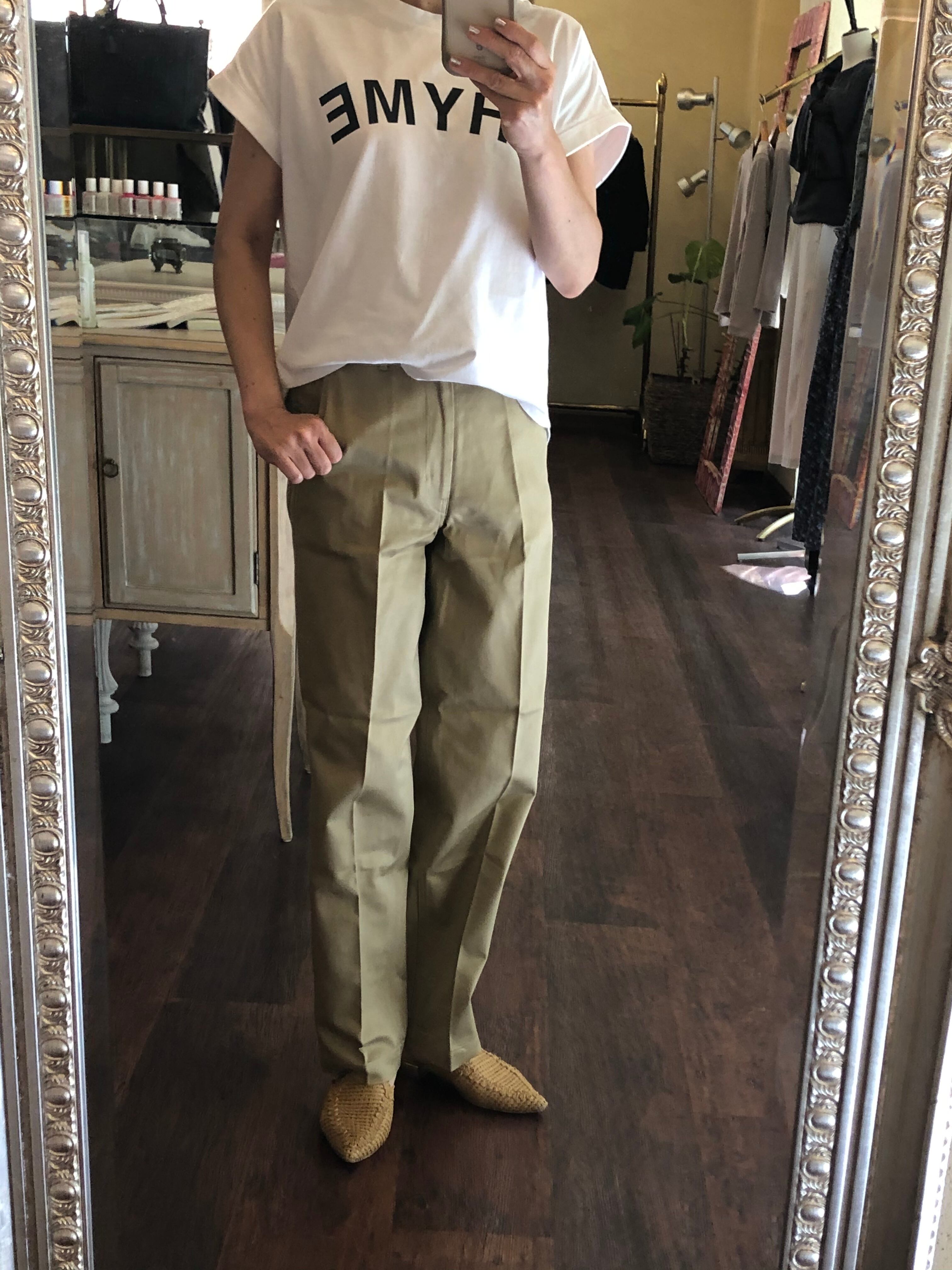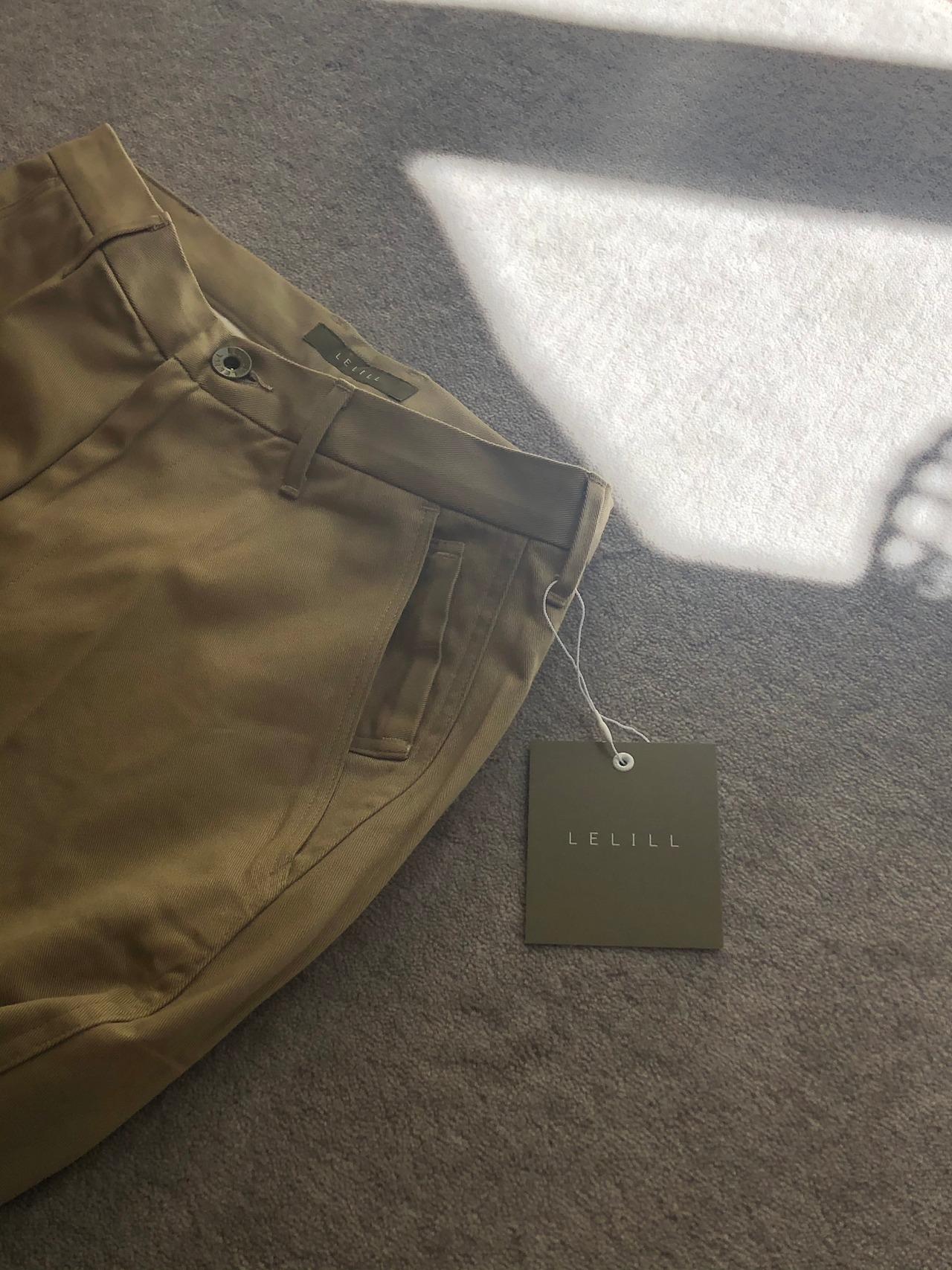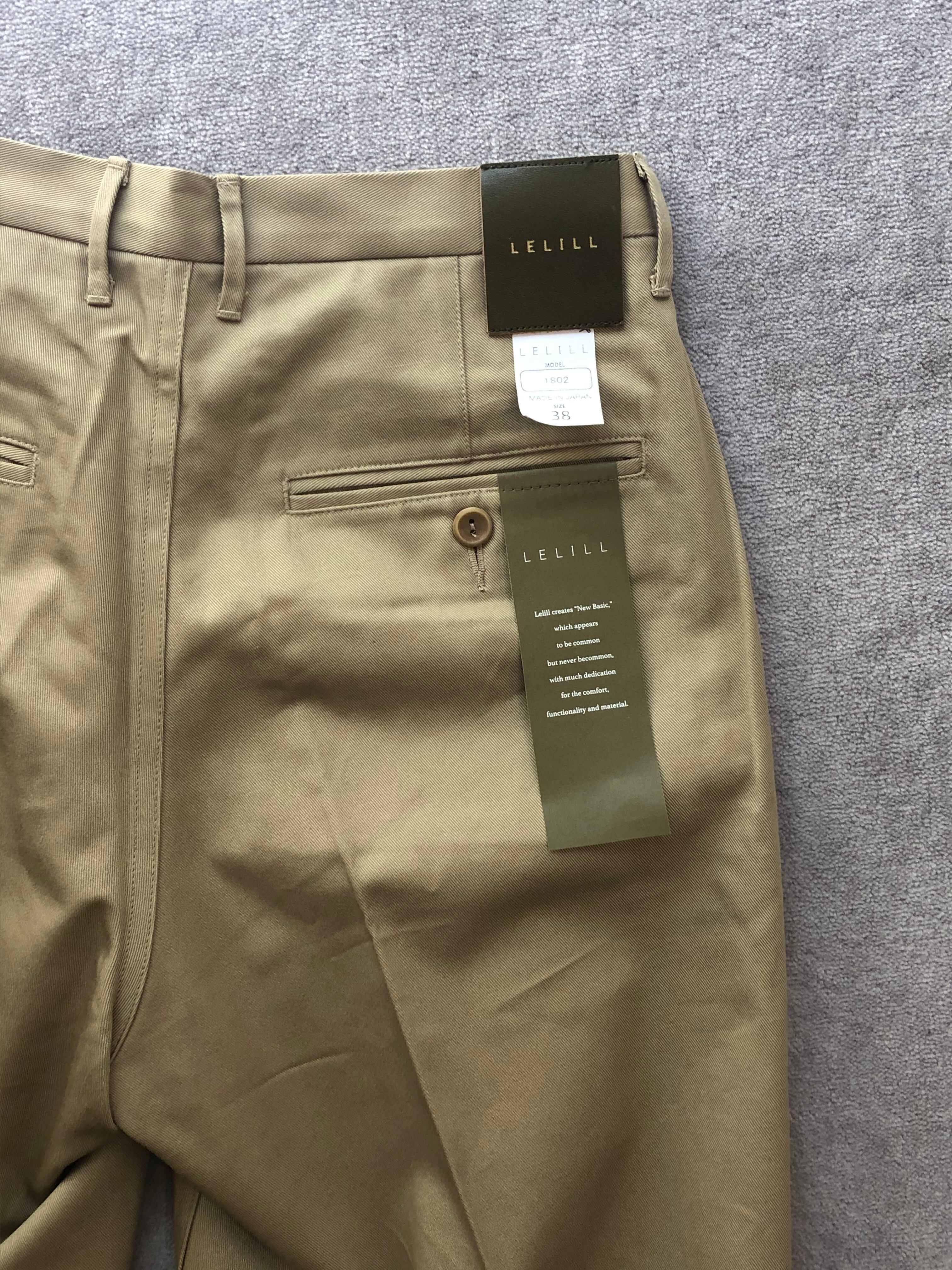 ややゆったりめのテーパードストレート型。ドレスパンツのウエストベルトを採用し、カジュアルな中にきれいめ要素が感じられるチノ。