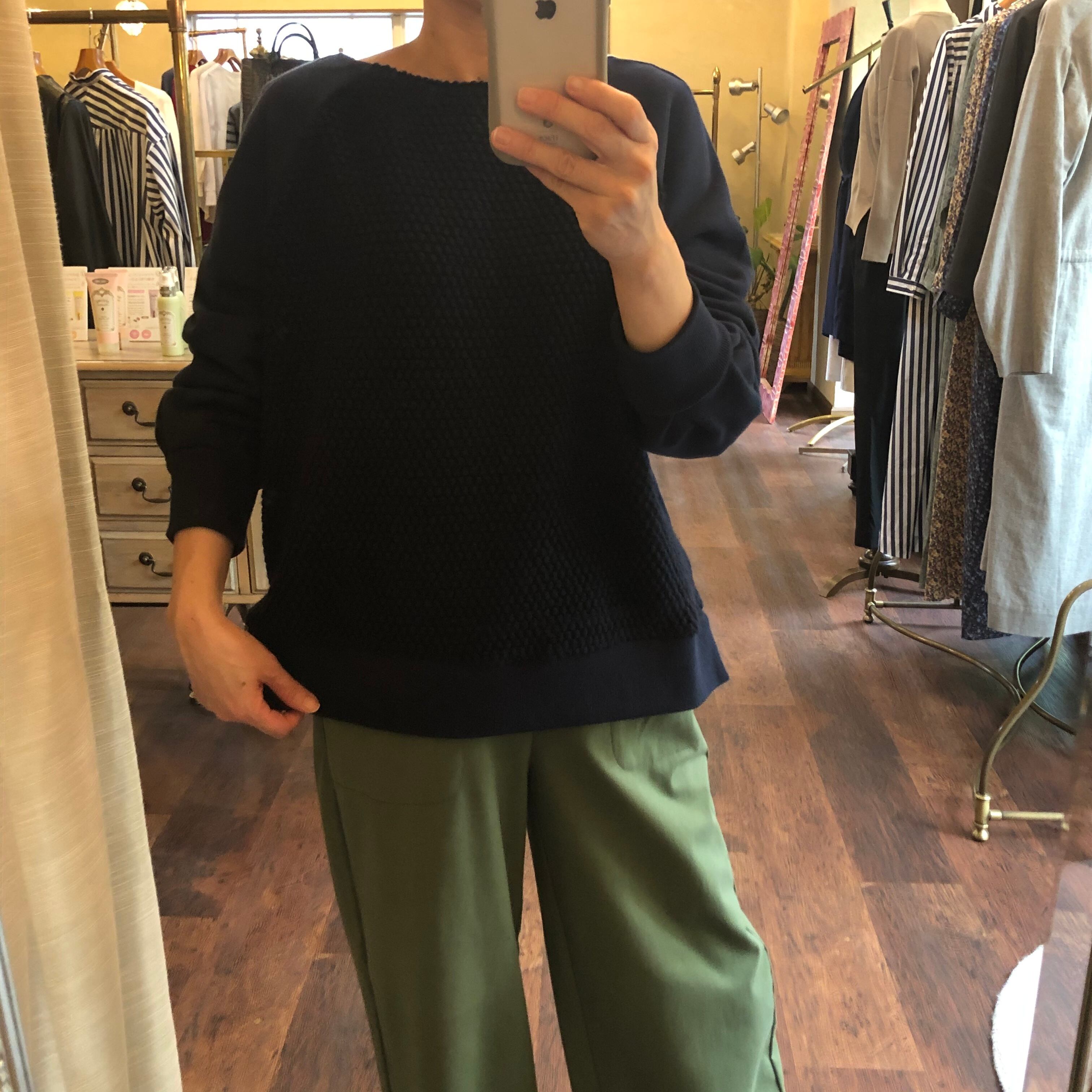 前身頃のみポコポコと表情あるスウェットプルオーバー。ボートネックの襟元、袖口は止まりが良く、ボトムを選ばないシルエットです。