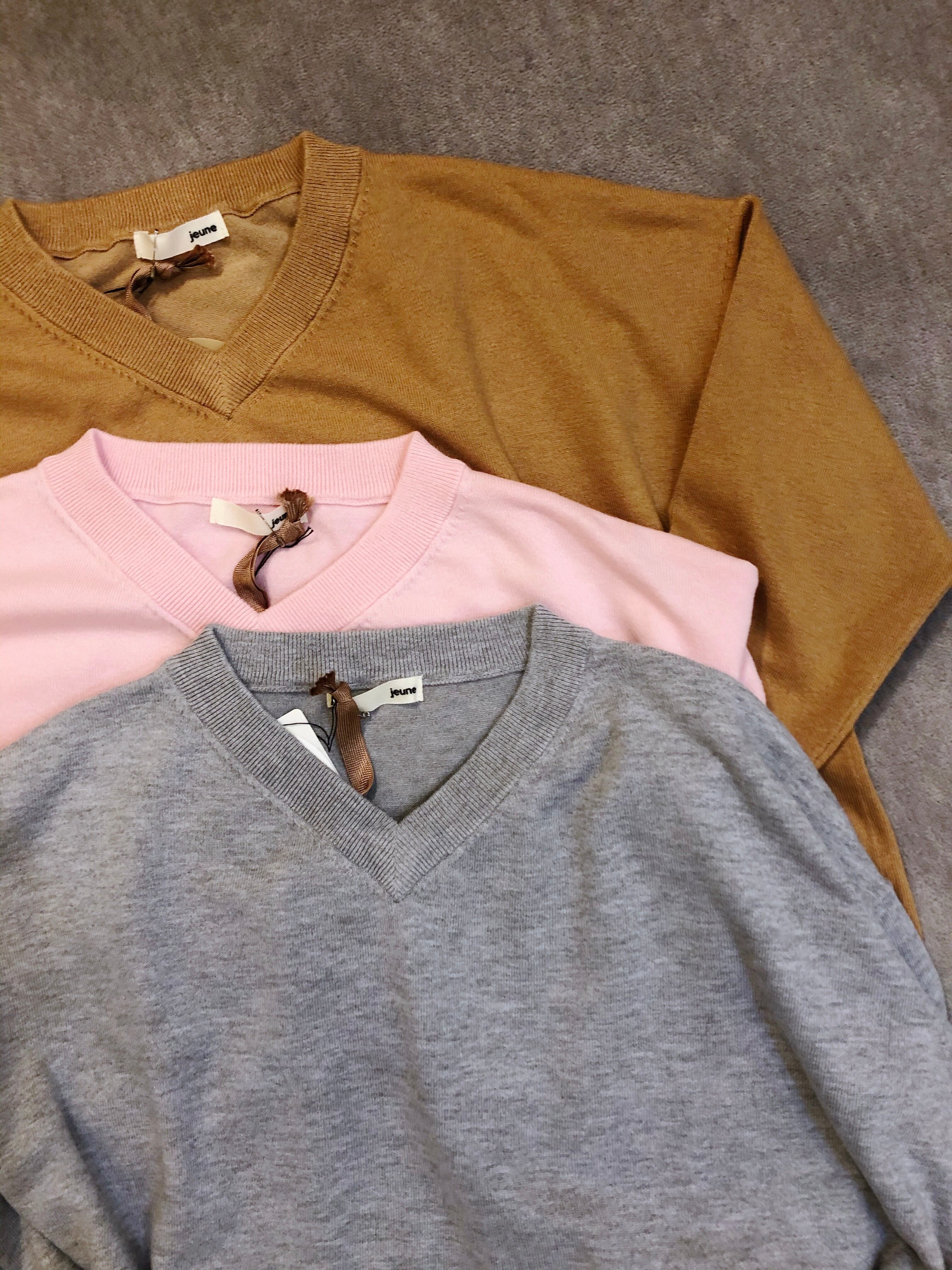 スタンダードなV襟プルオーバー。ウールが入っていないので、しっとりとした肌触り。