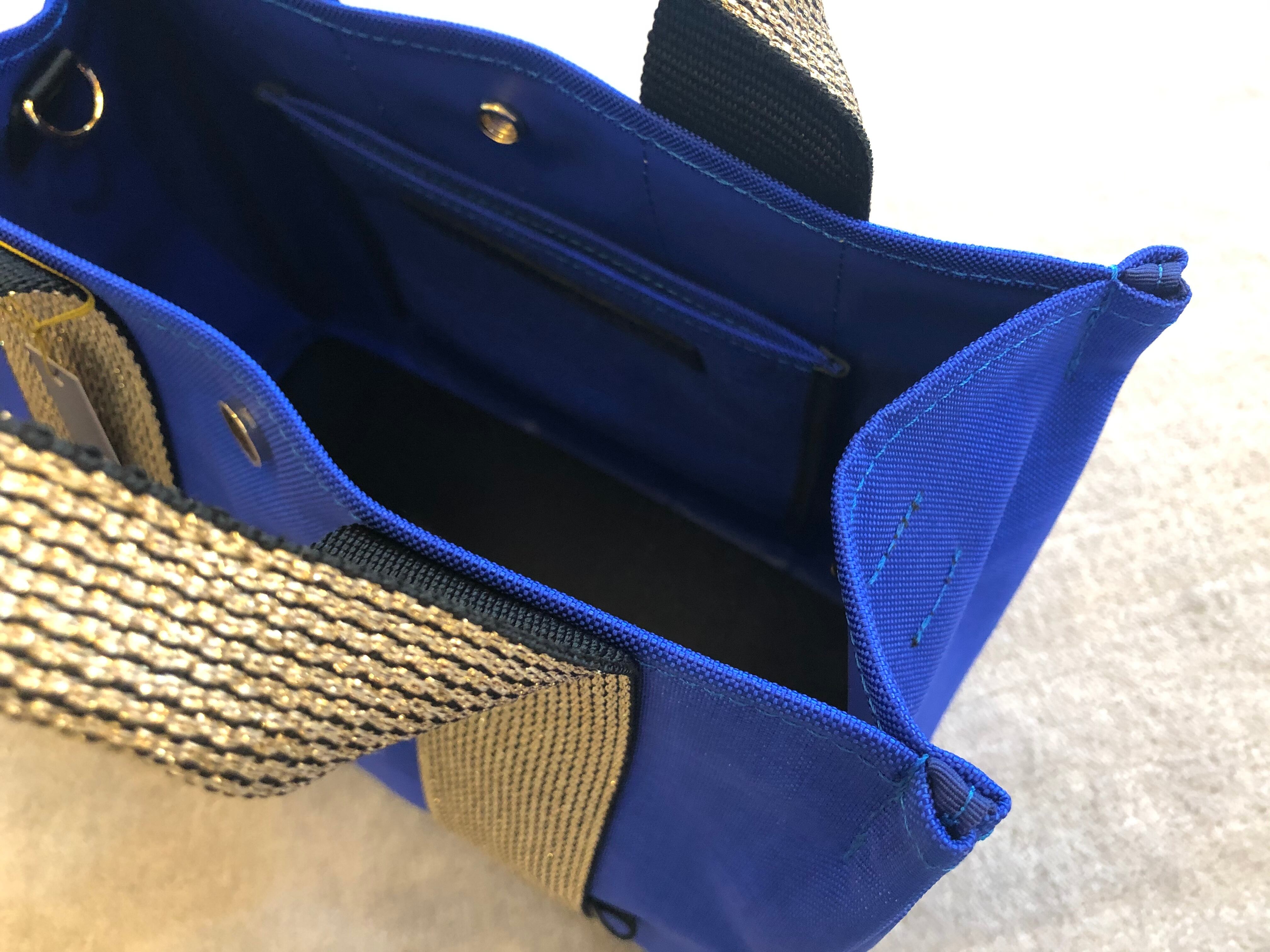 スナップボタンが中心に付き、裏地はビニール素材なのでケアがしやすく、マチが広いので収納力もあります
