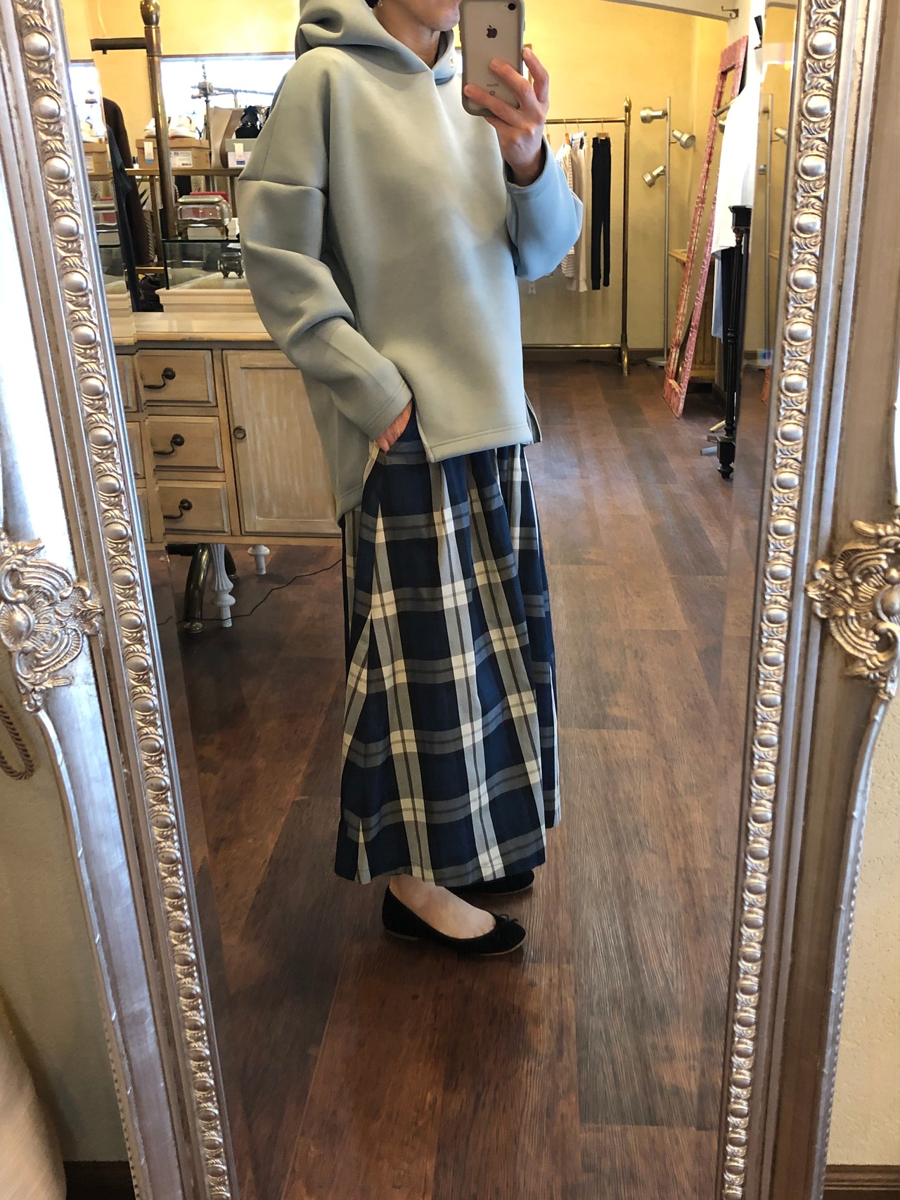 前後差ある着丈なので、スカートにもワイドボトムにも合わせられ、コーディネートしやすいデザインです