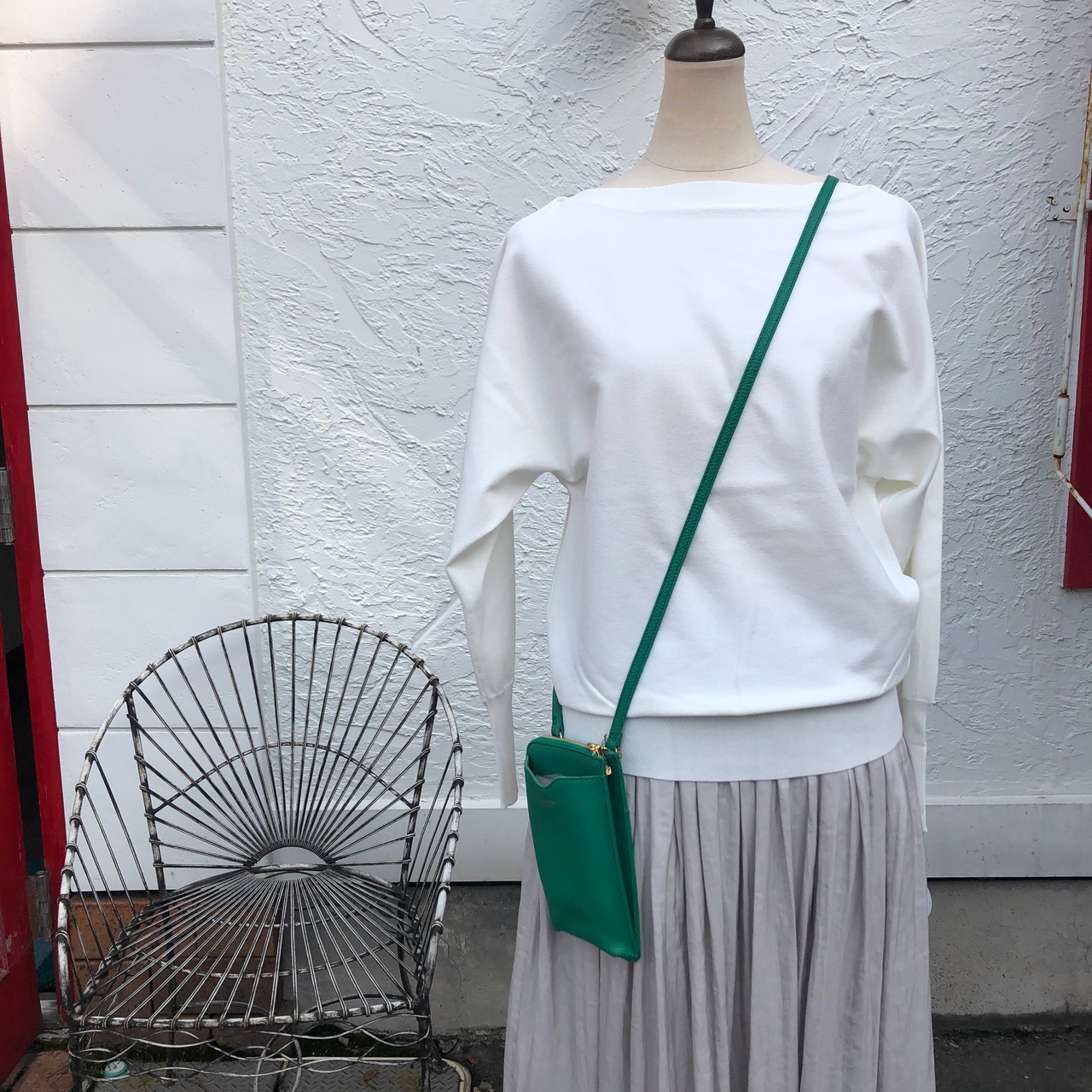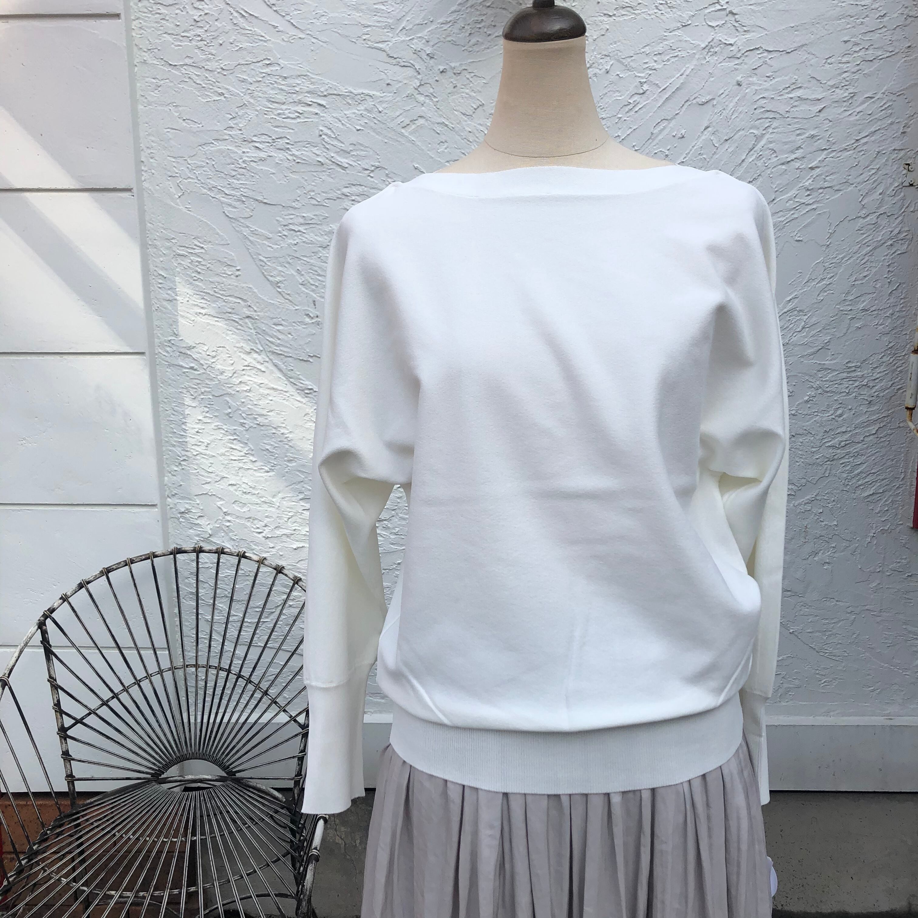 ネックラインがきれいに見えるボートネック型プルオーバーニット
