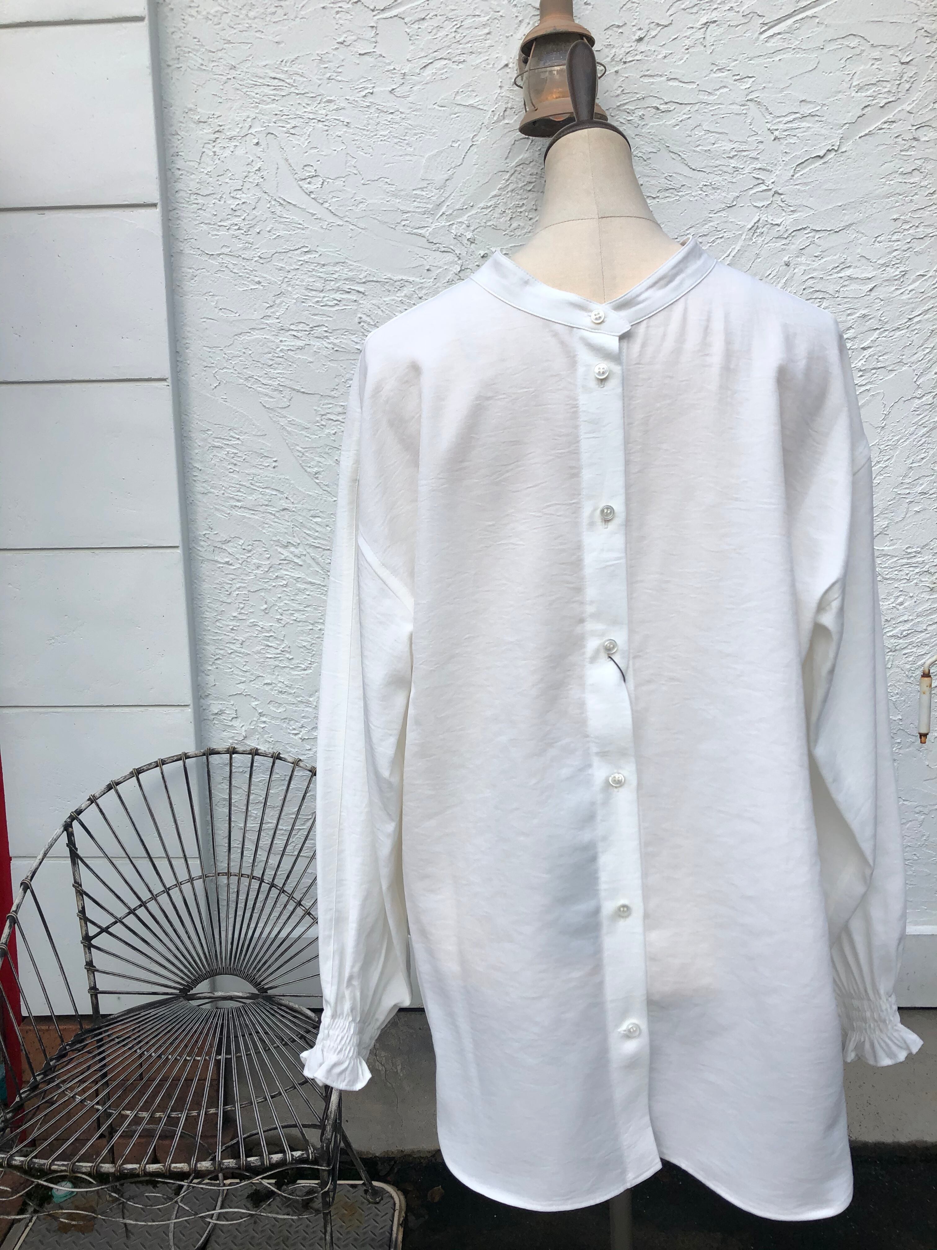 袖口は仕事の際に邪魔にならないシャーリング仕様で、ネック周りはドレープ入りで表情感たっぷりのデザインです