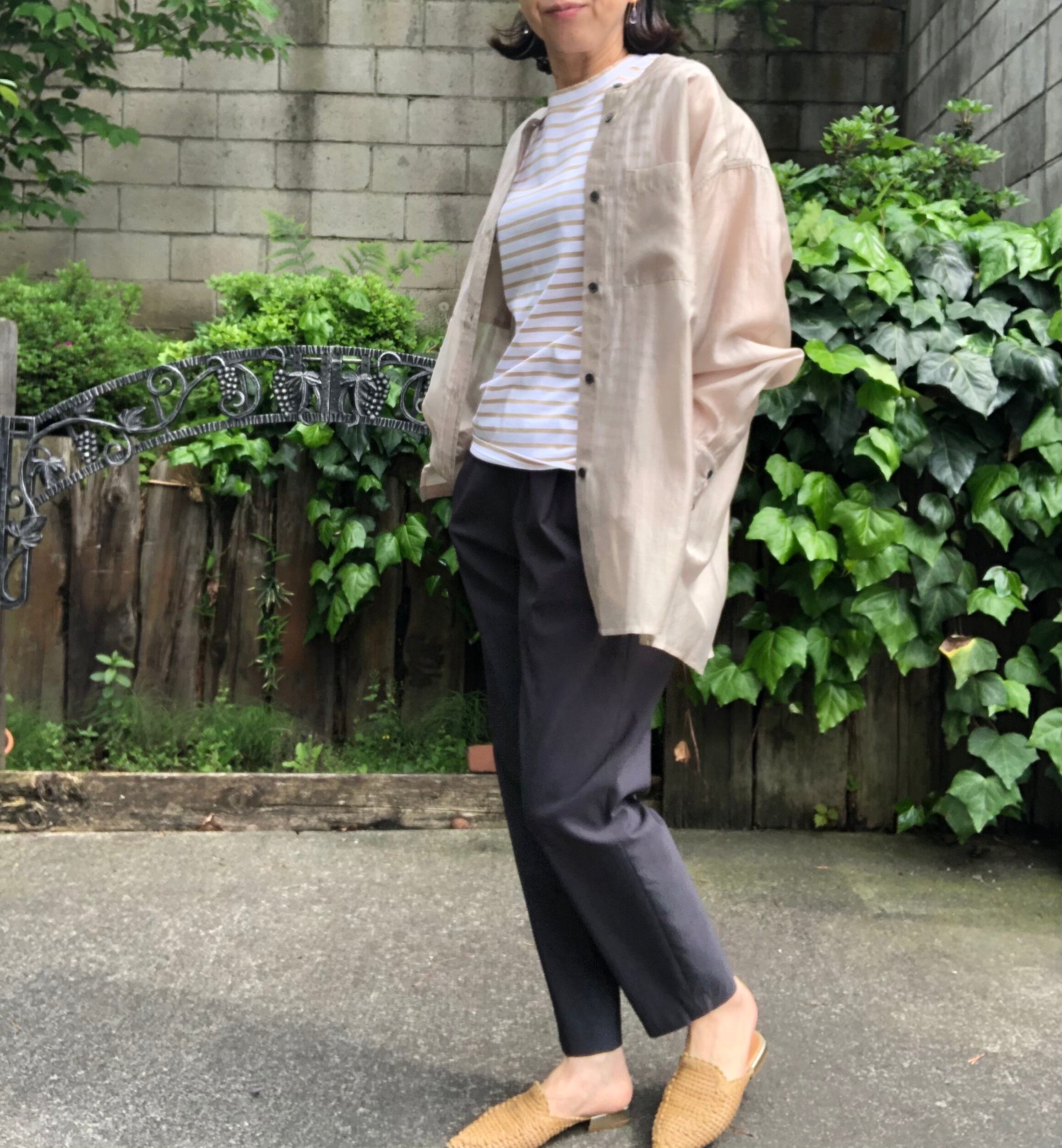 ほんのりシアーが着こなしやすく、ゆるっとしたサイズ感がちょうど良いスタイリングバランスを作り上げてくれます