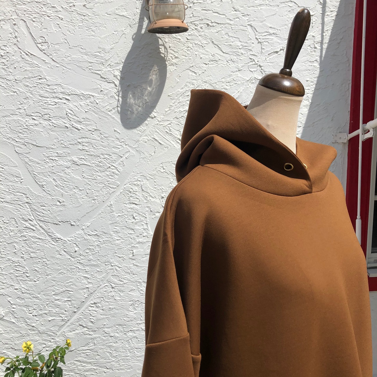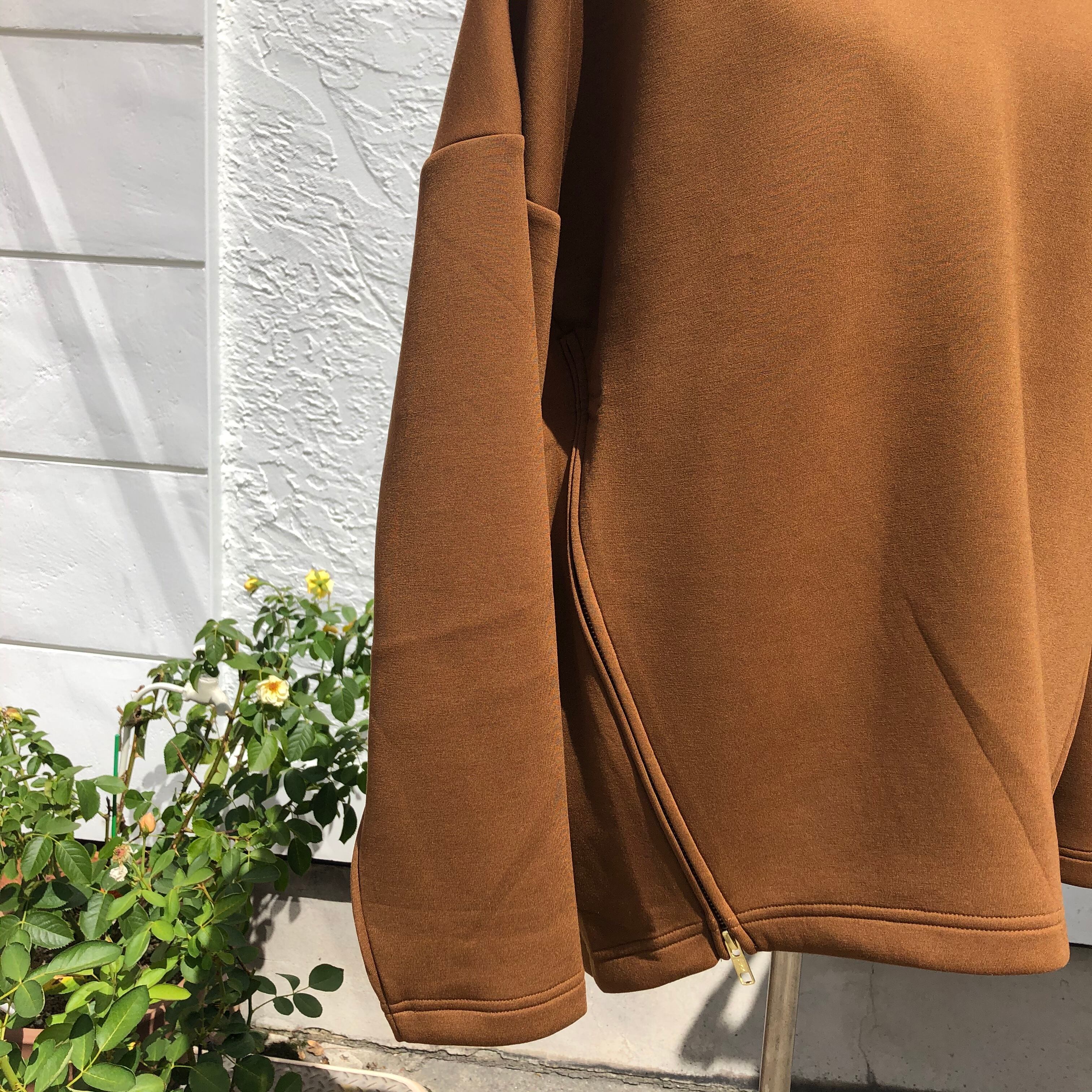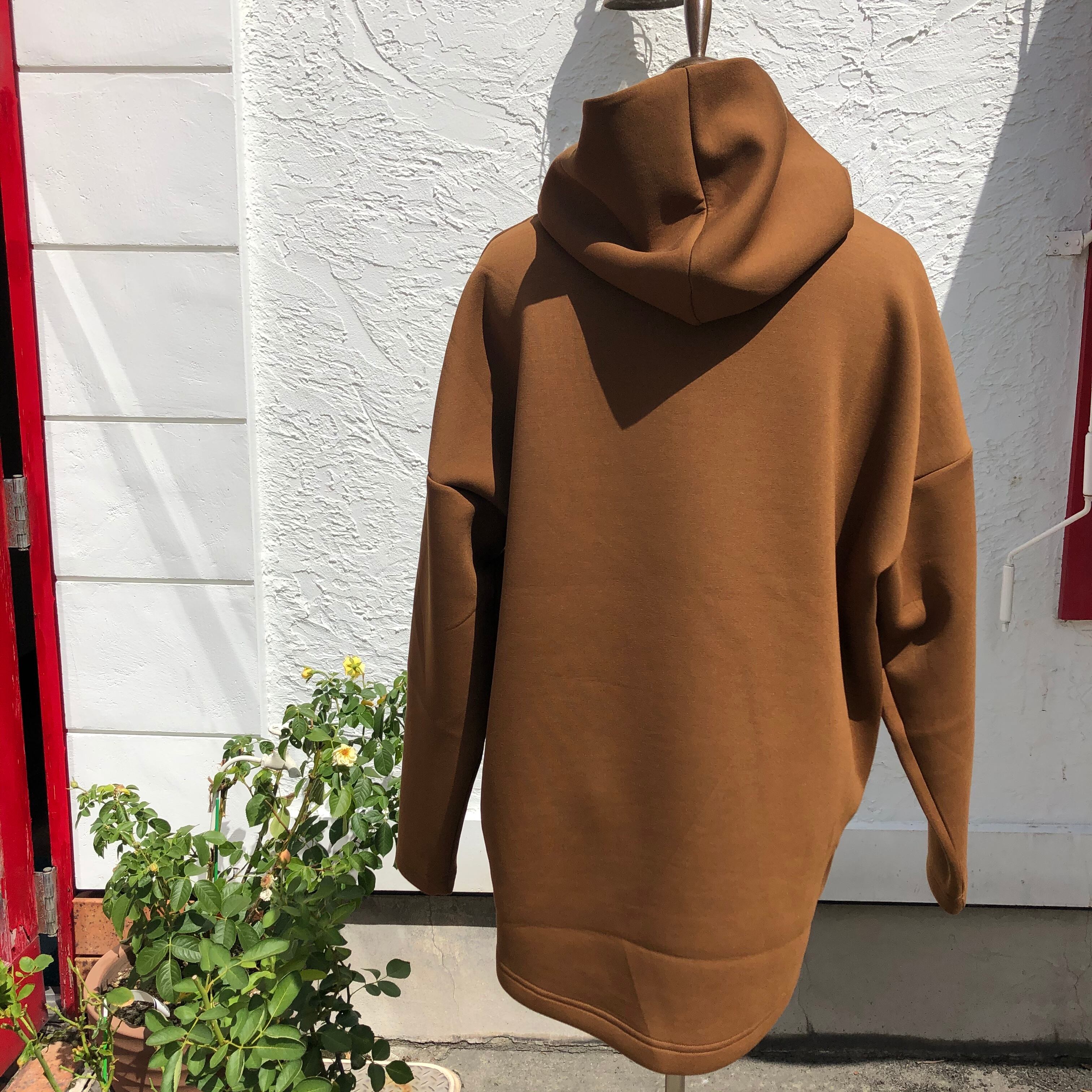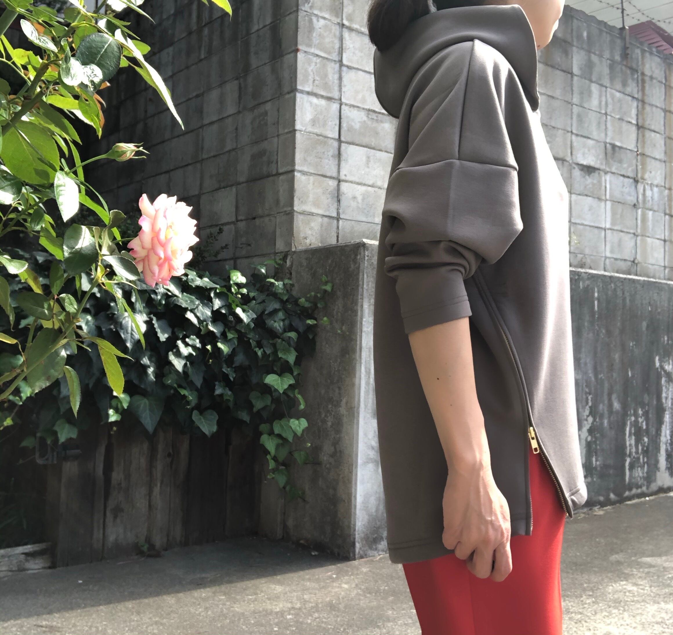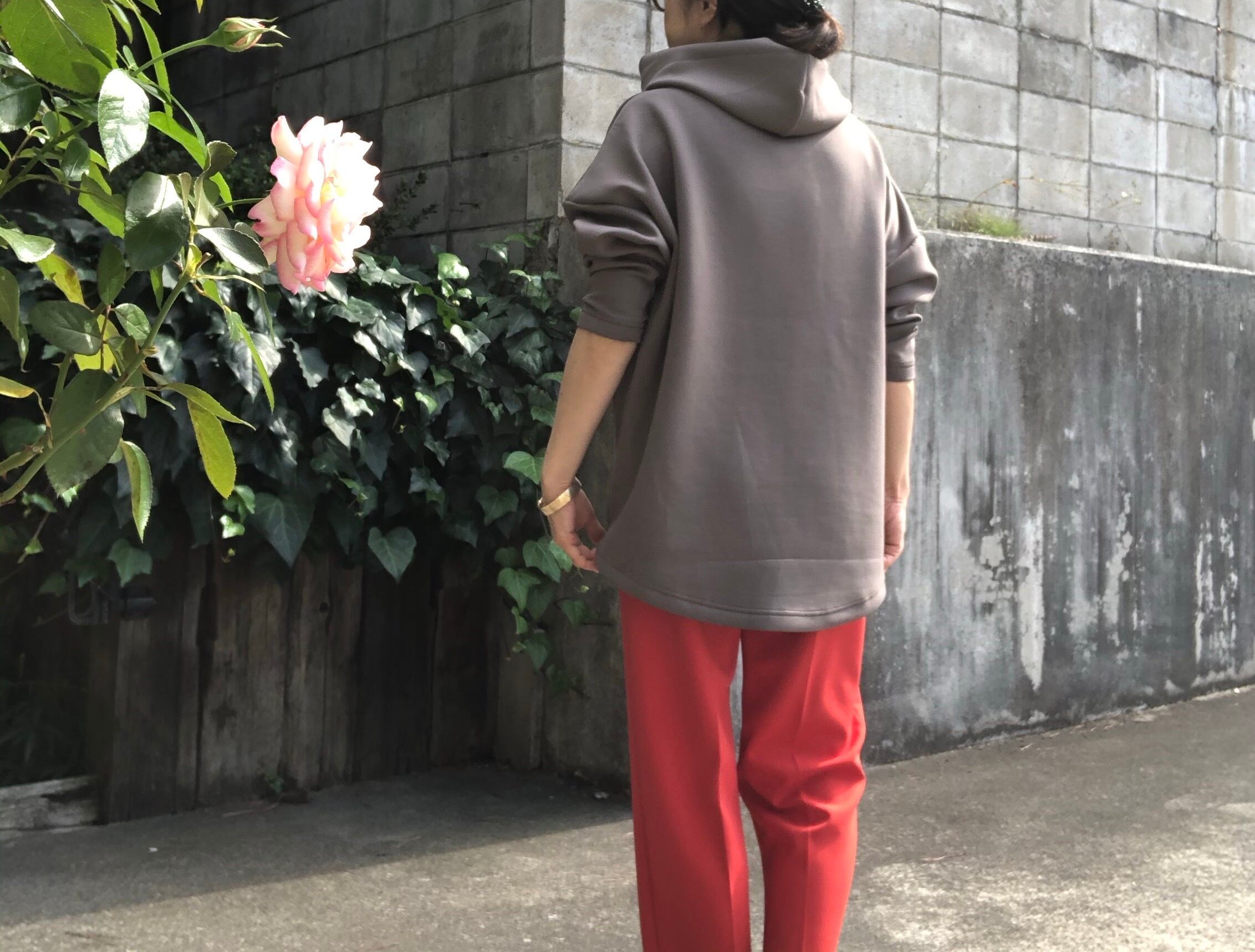 カジュアルなパーカーですが、こちらの生地は艶があるので綺麗め見えします