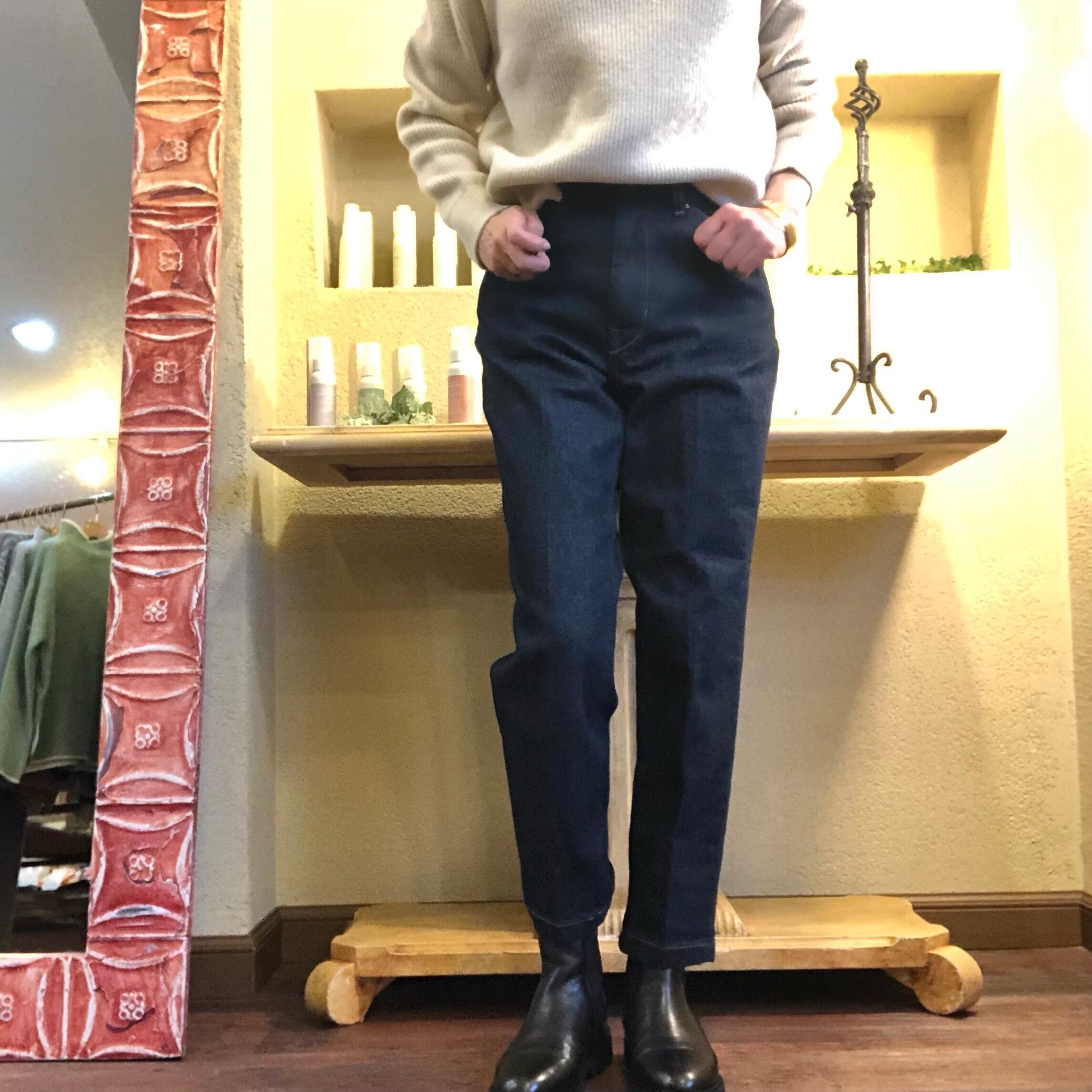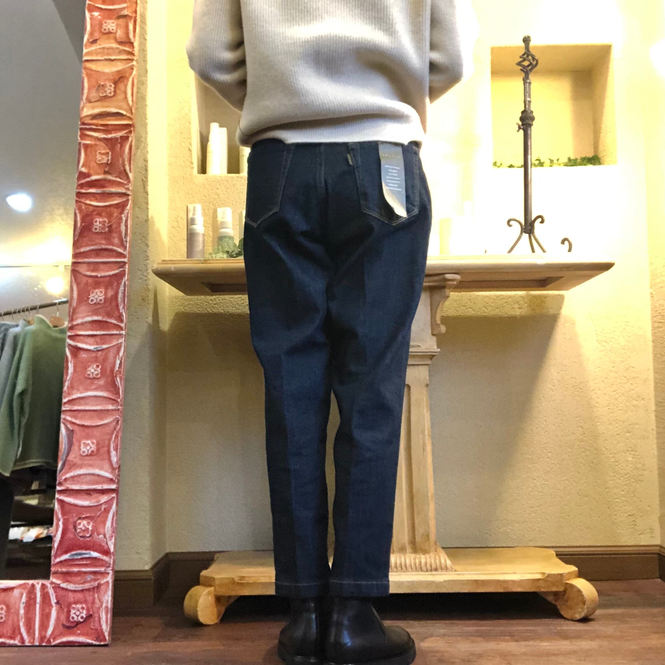 定番のモデストストレートをベースに、腰回りから膝までを少しルーズに柔らかなラインに変更。
