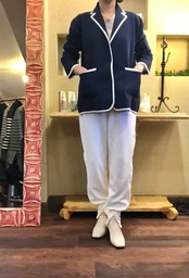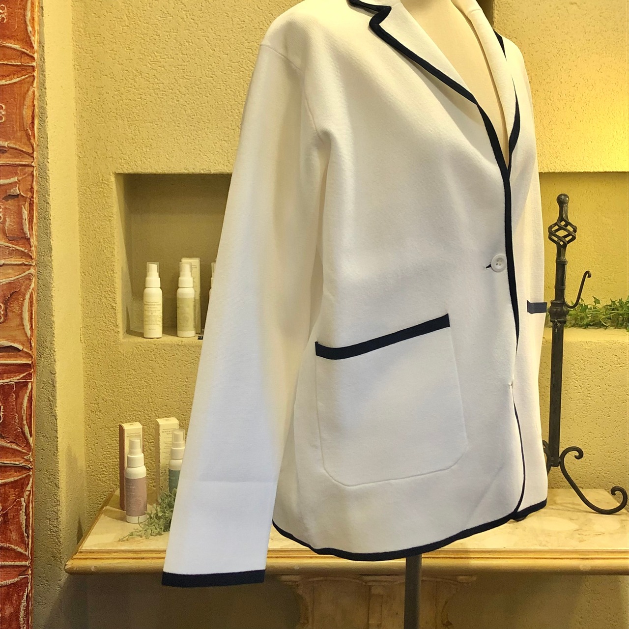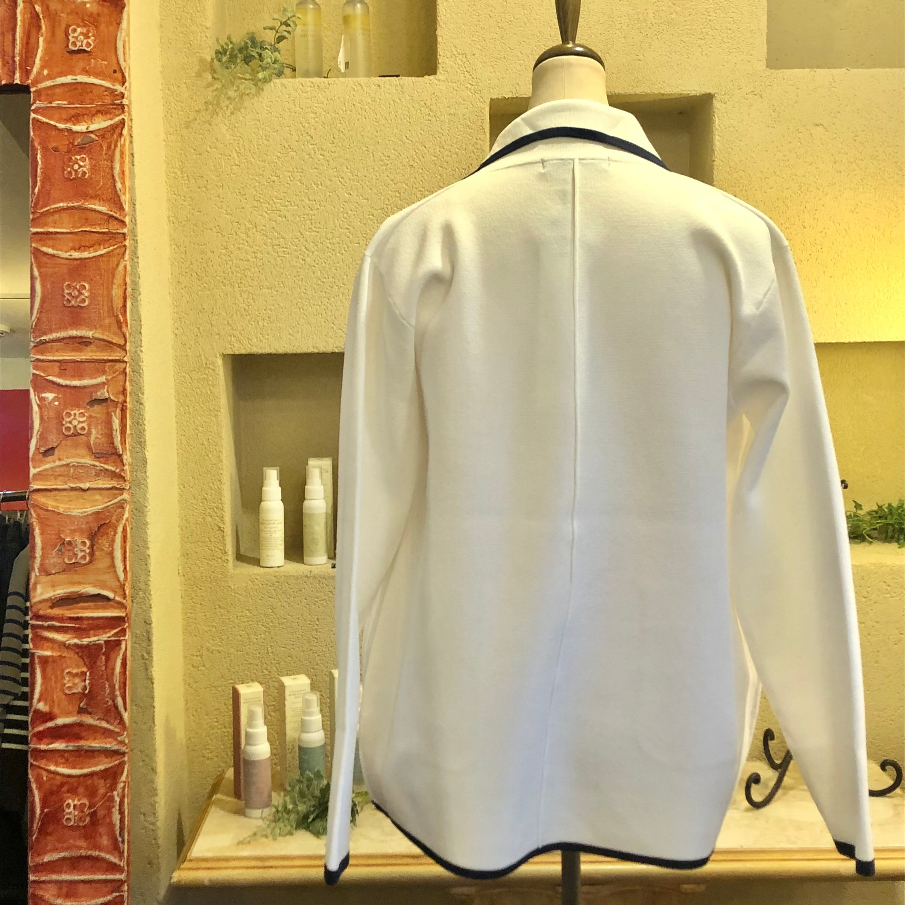 デザインはきちんと感を保ちつつカジュアルなカーディガンのようにも使えるパイピングシングル仕様