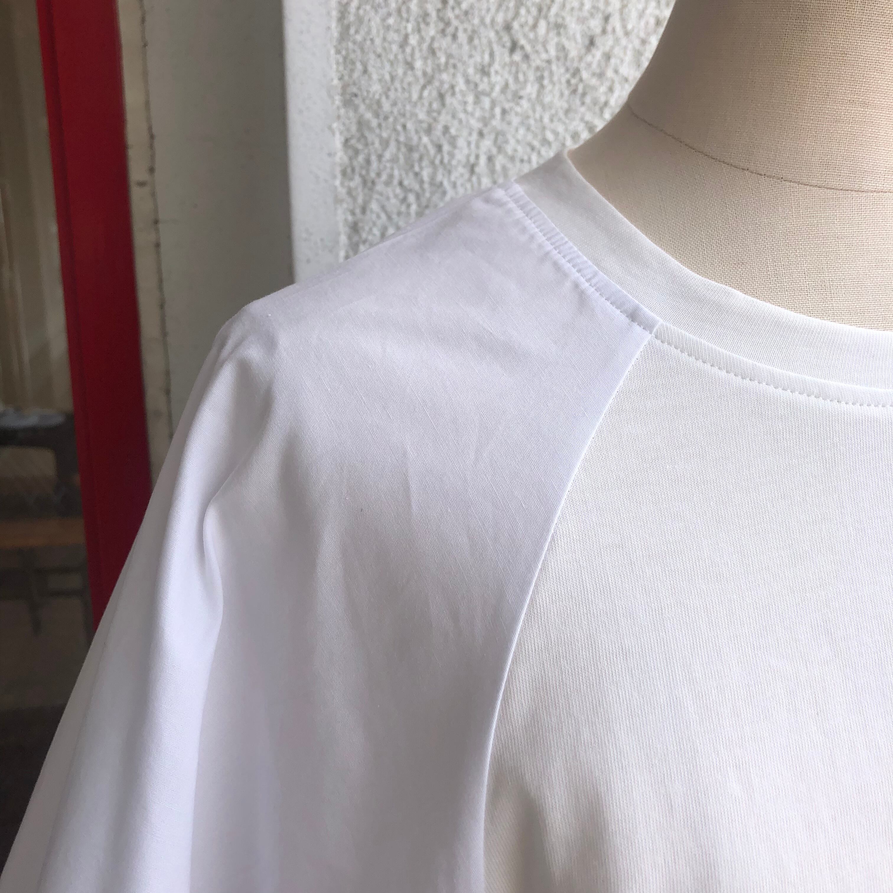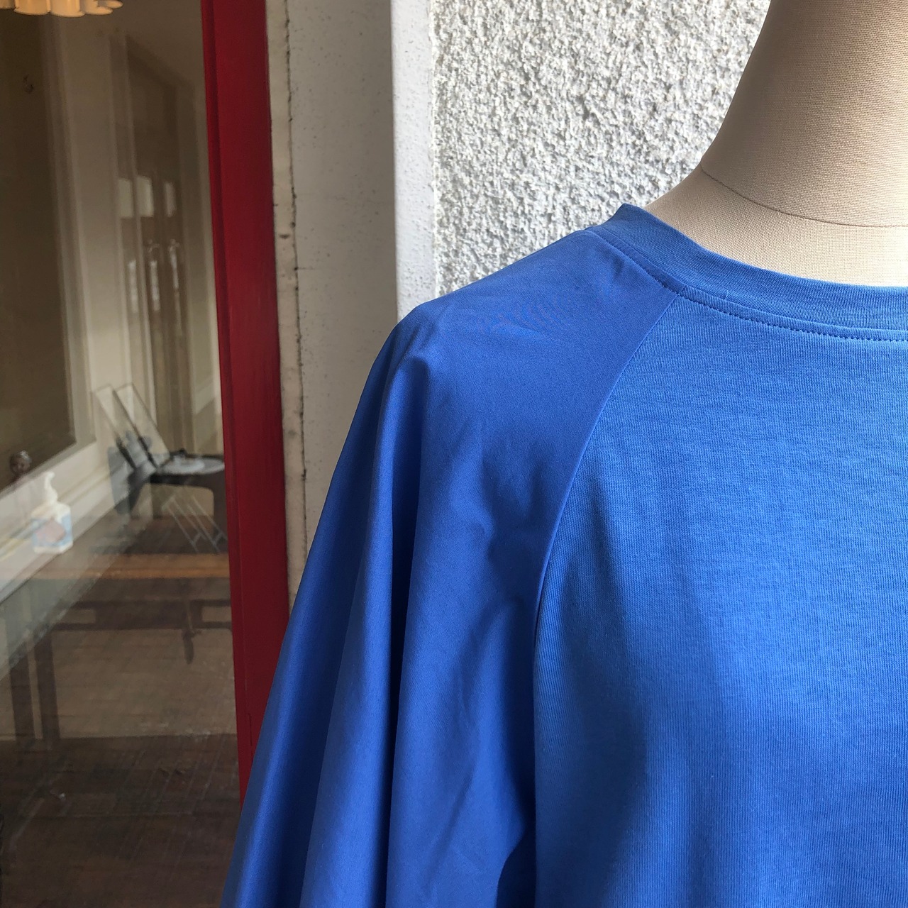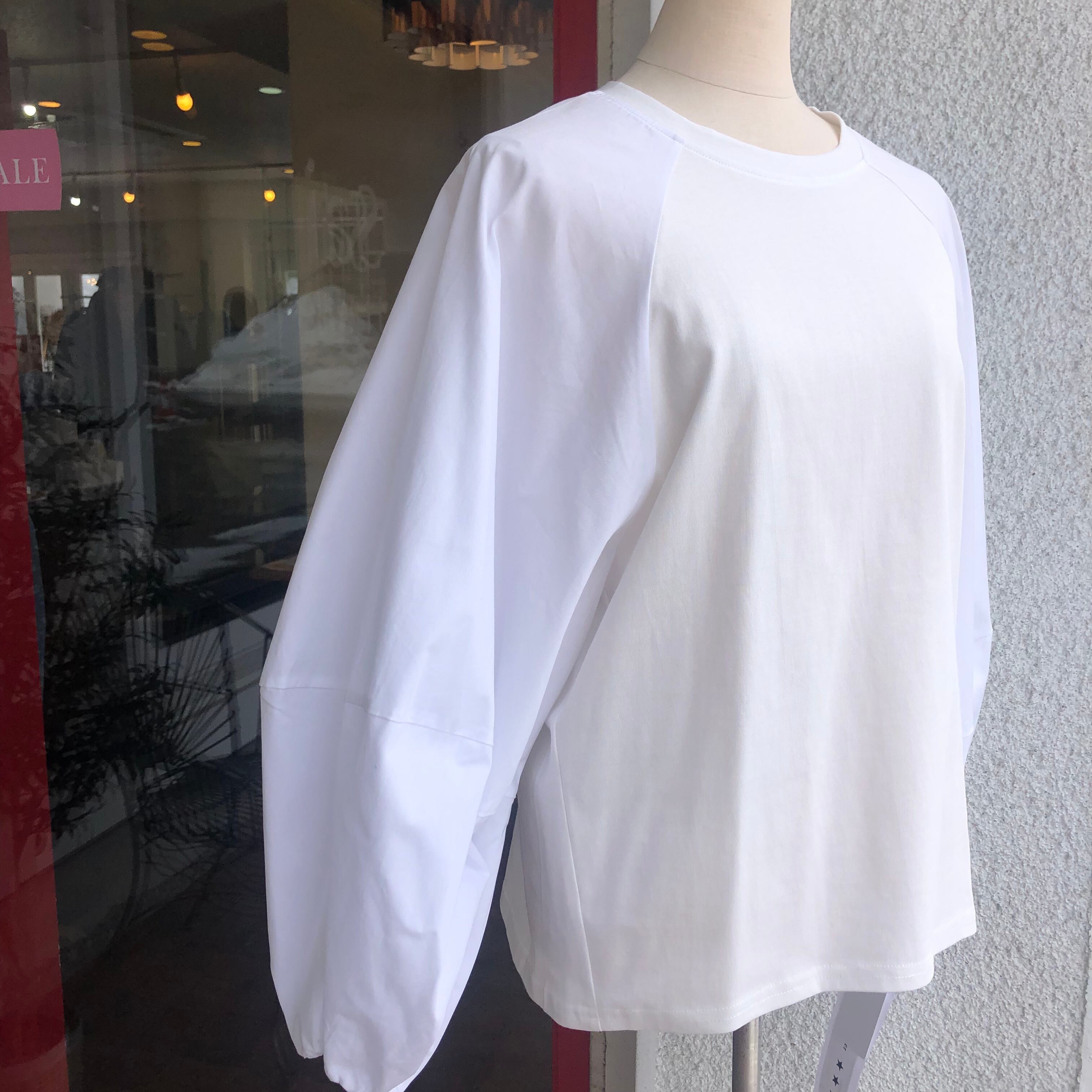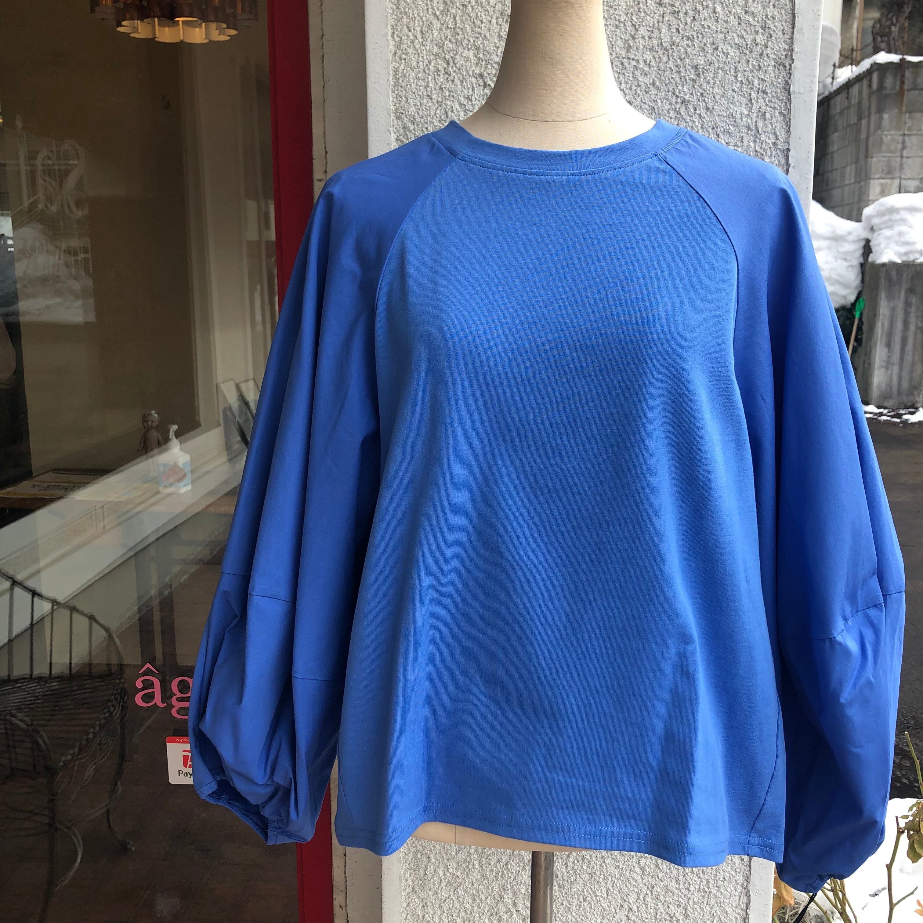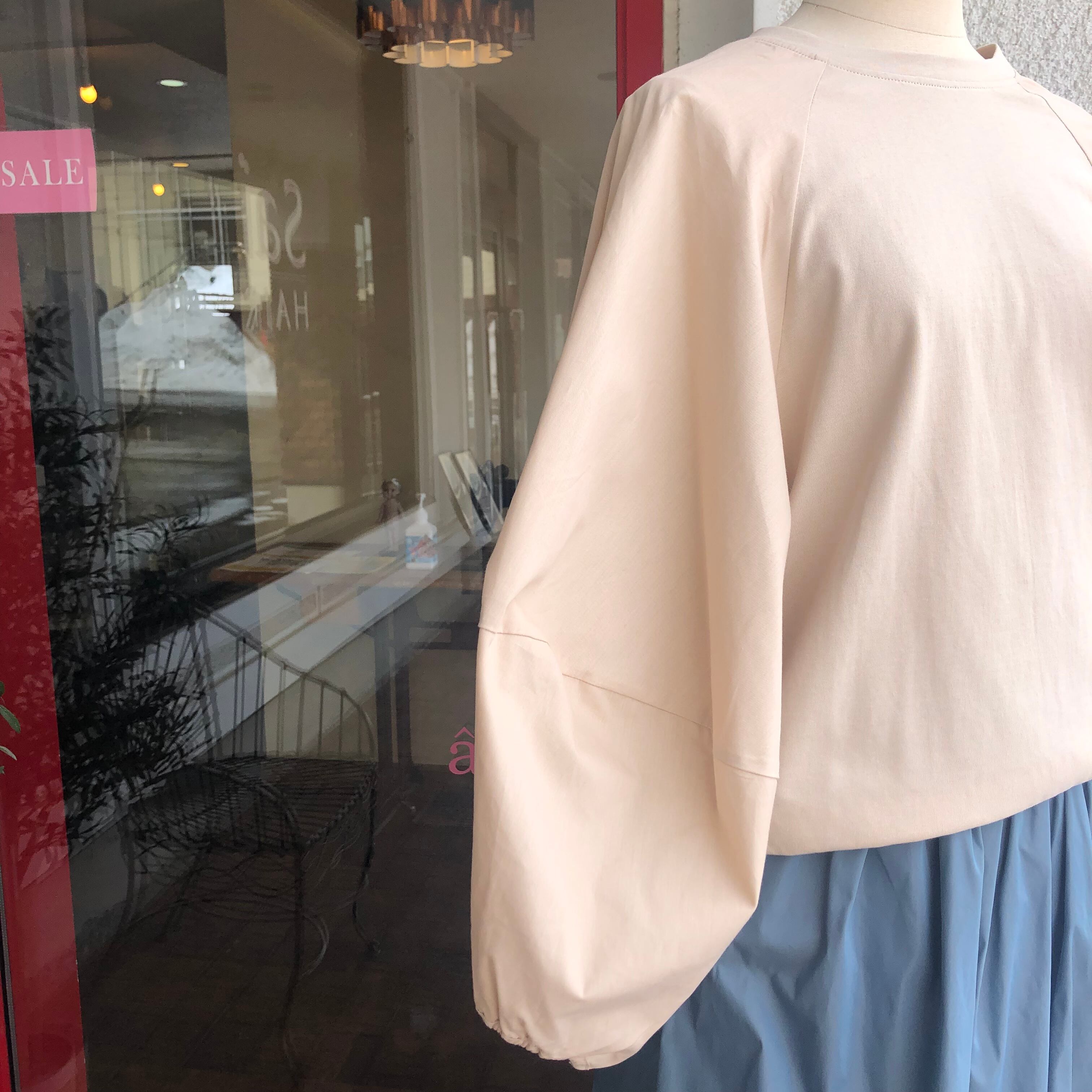 身頃はカットソー生地、袖は布帛生地とドッキングしたデザイン