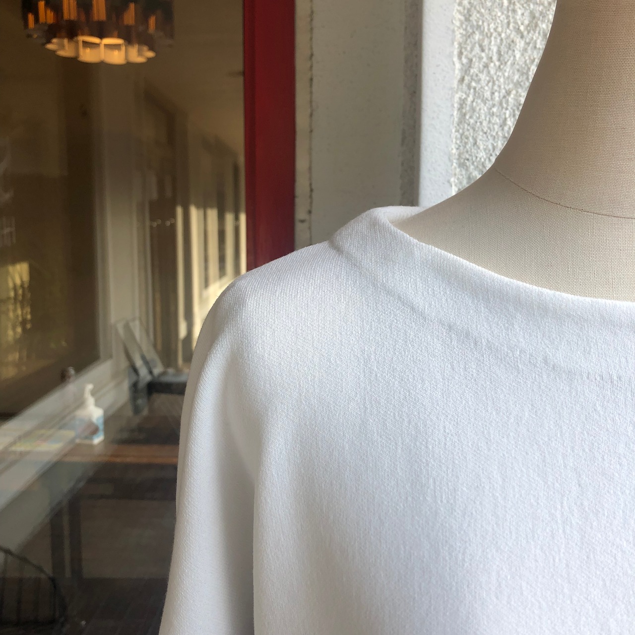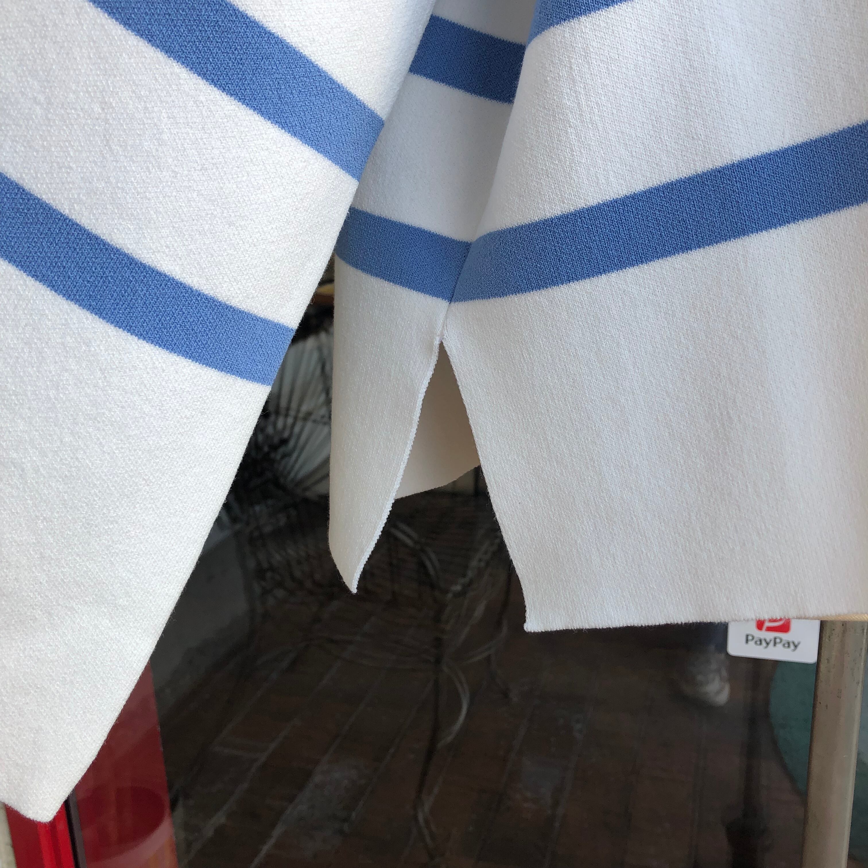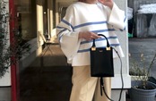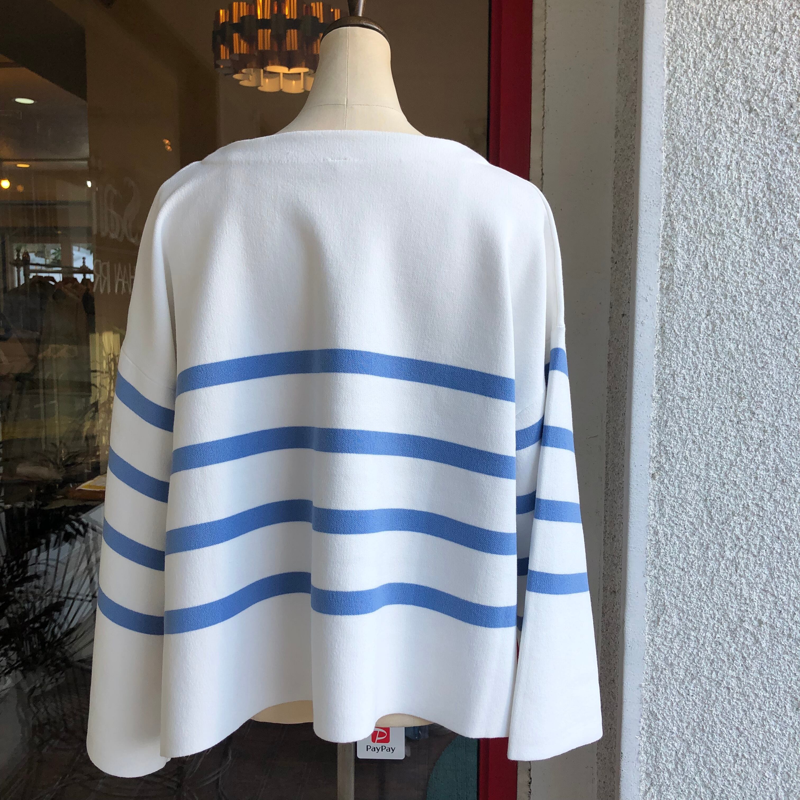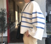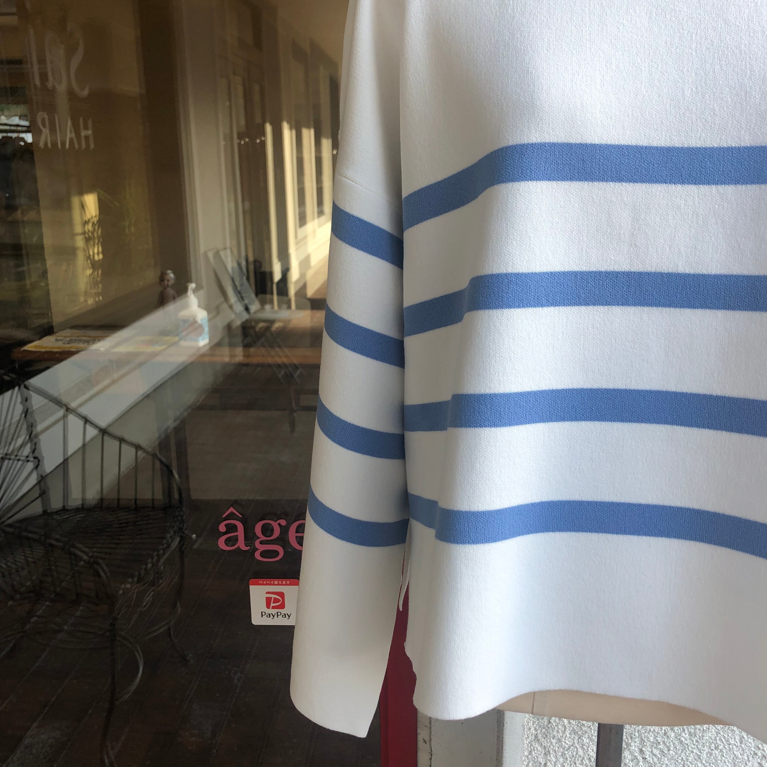 ボーダー幅も広くニット素材なので、端境期に一枚で着やすく、ジャストウエストの丈感はスカートにもコーディネートしやすいフォルムです