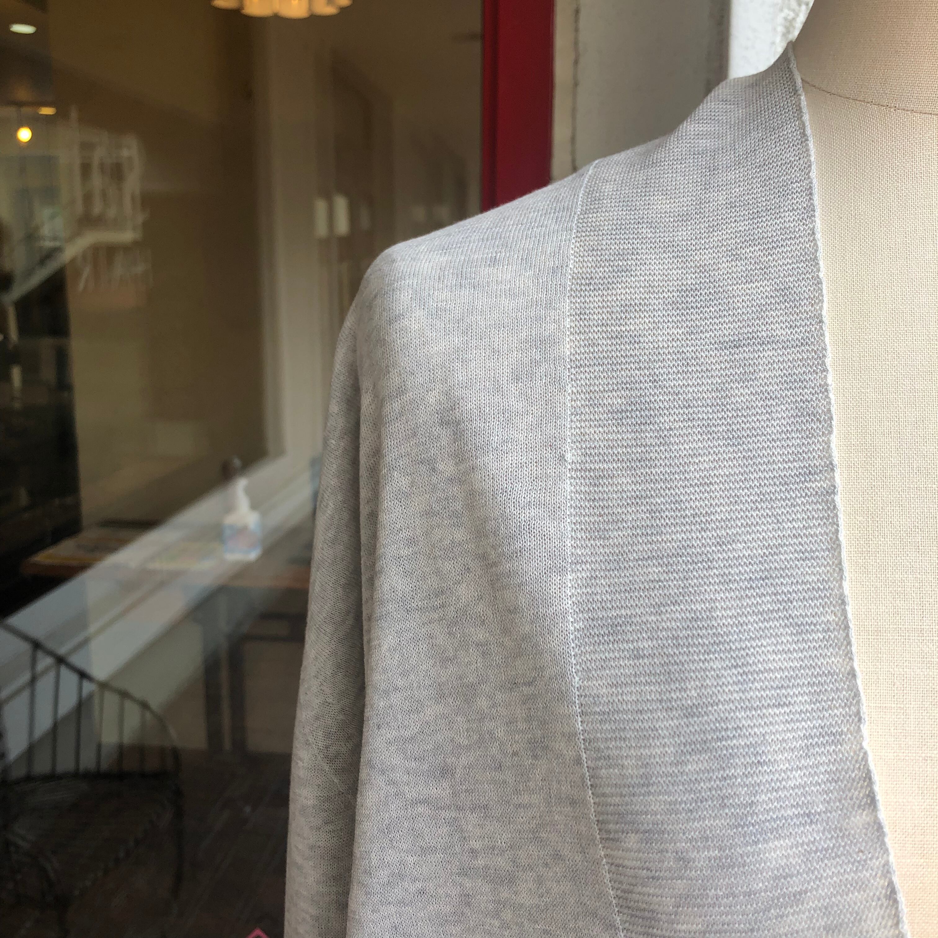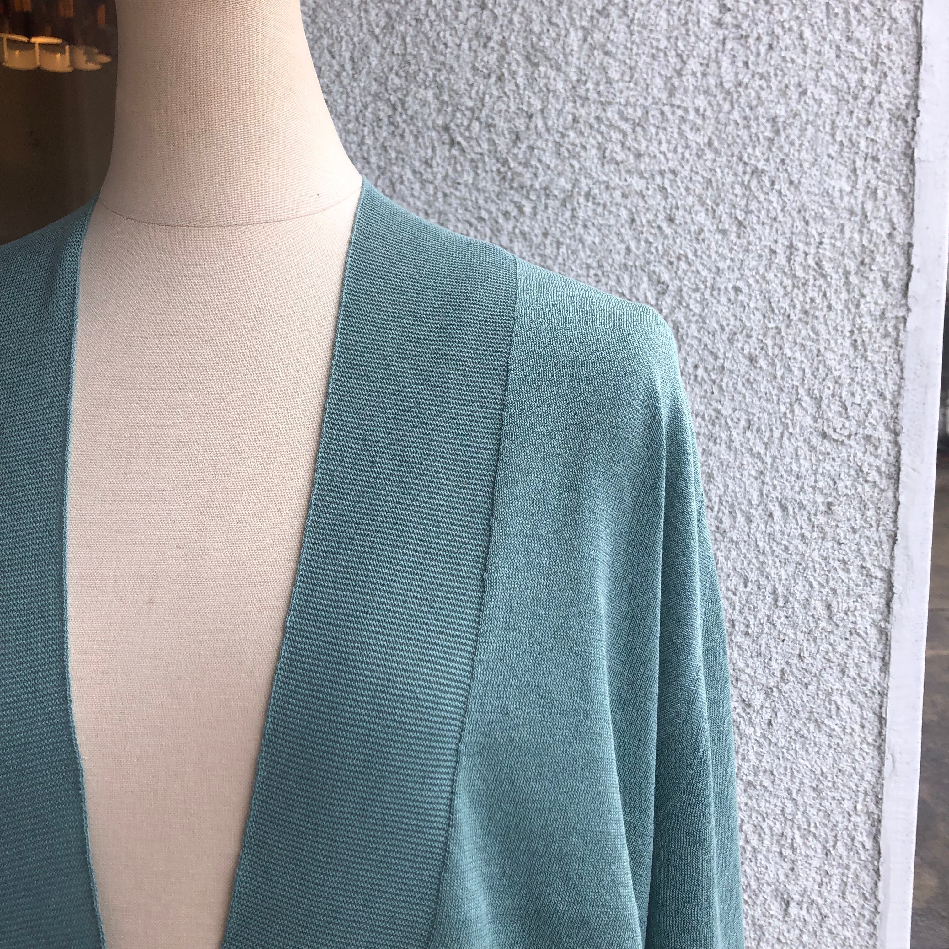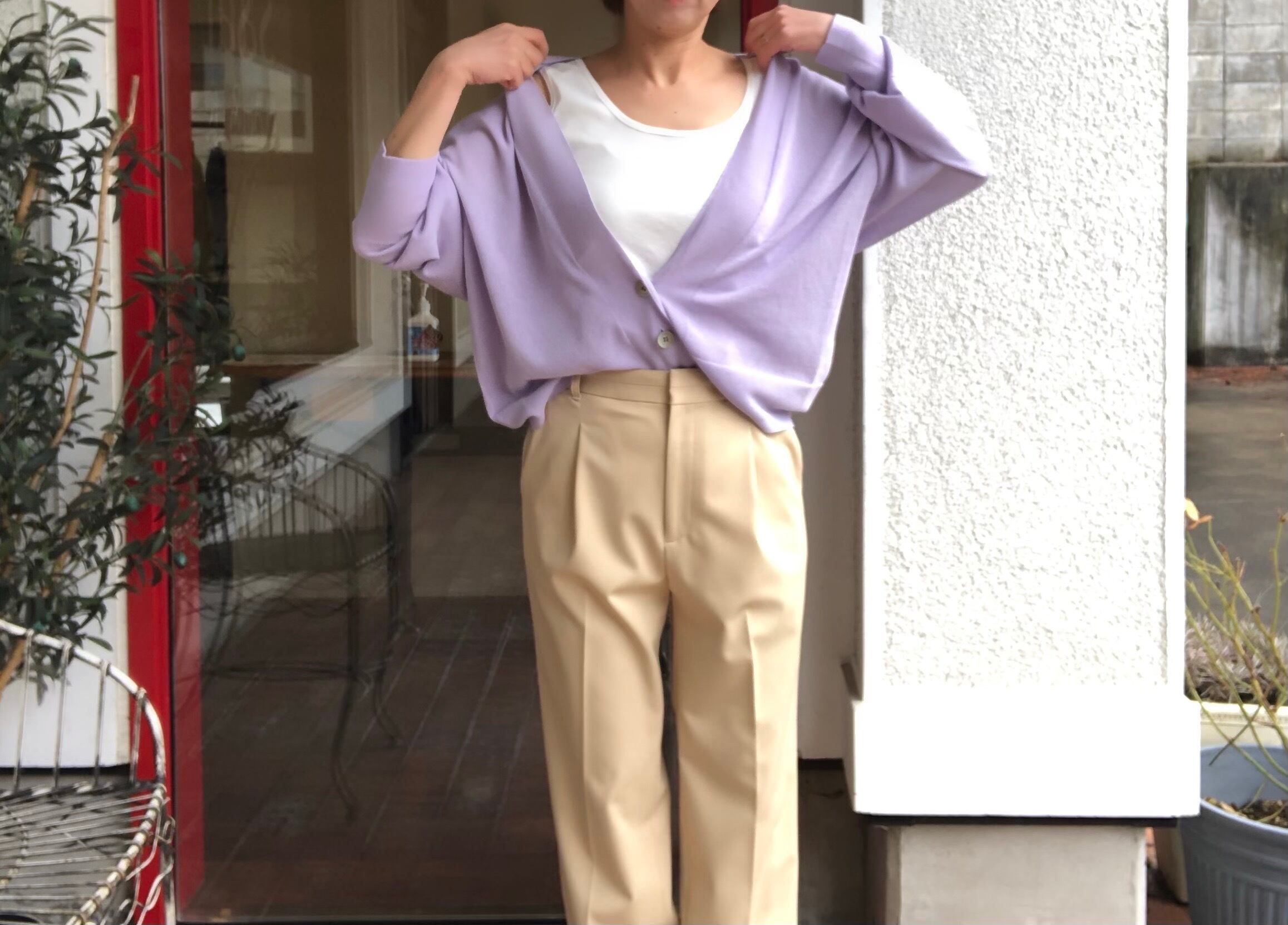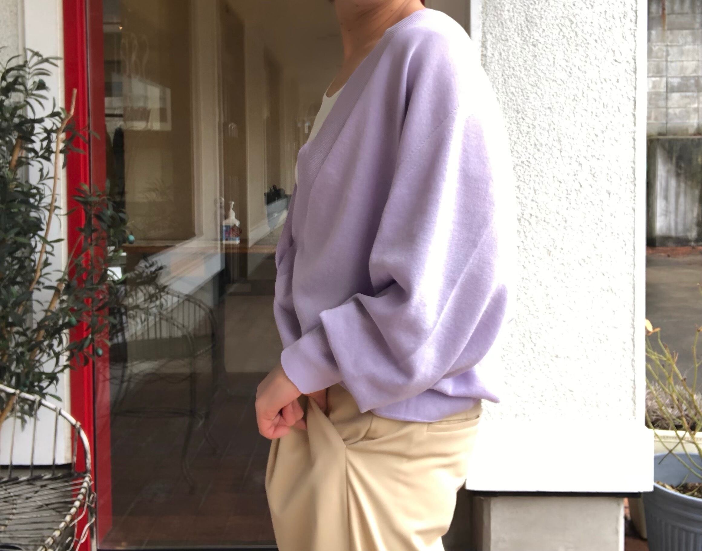 たっぷりとした身幅に、深いVネックが女性らしく、前後差ある着丈は、フロントはすっきりとインしているように見えながら、バックスタイルはドレープが寄るほど緩いフォルムになります