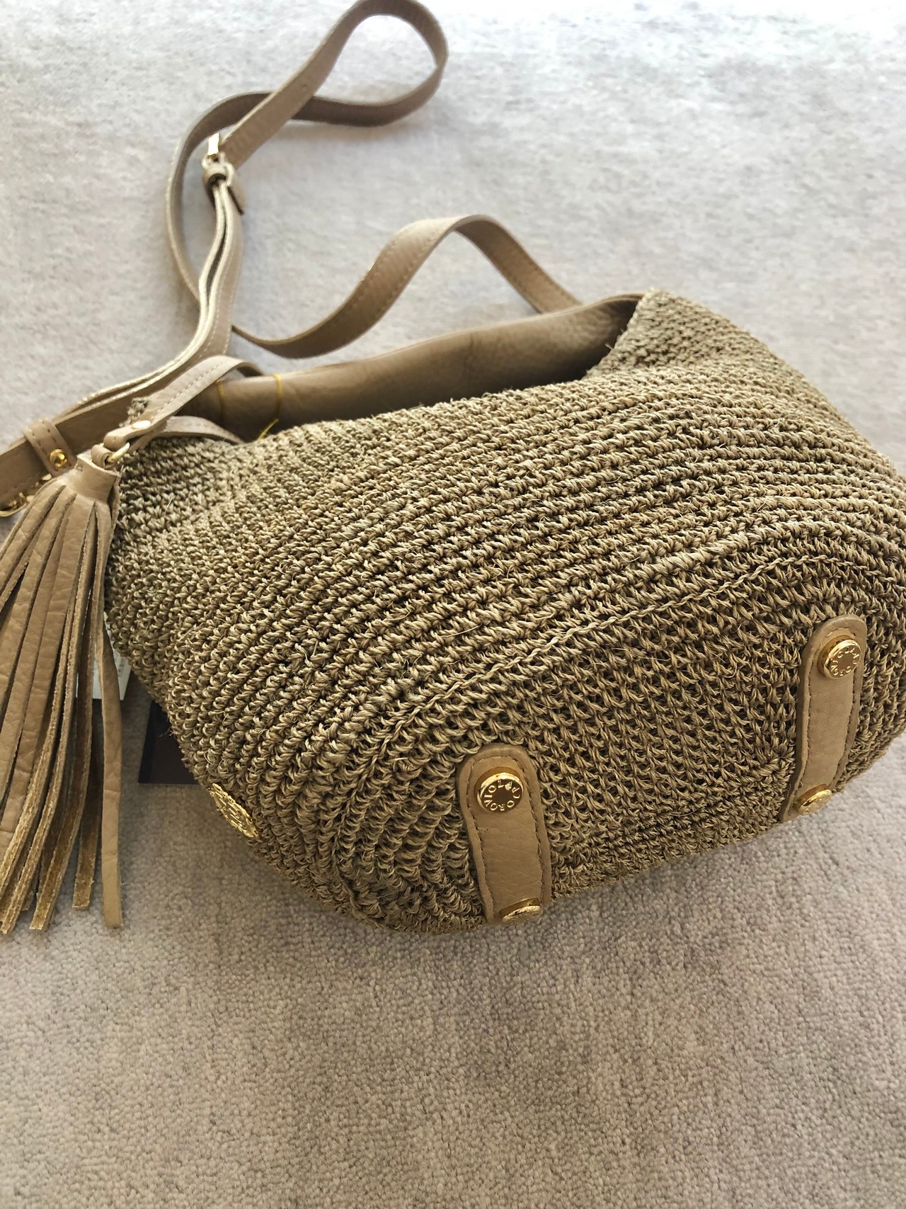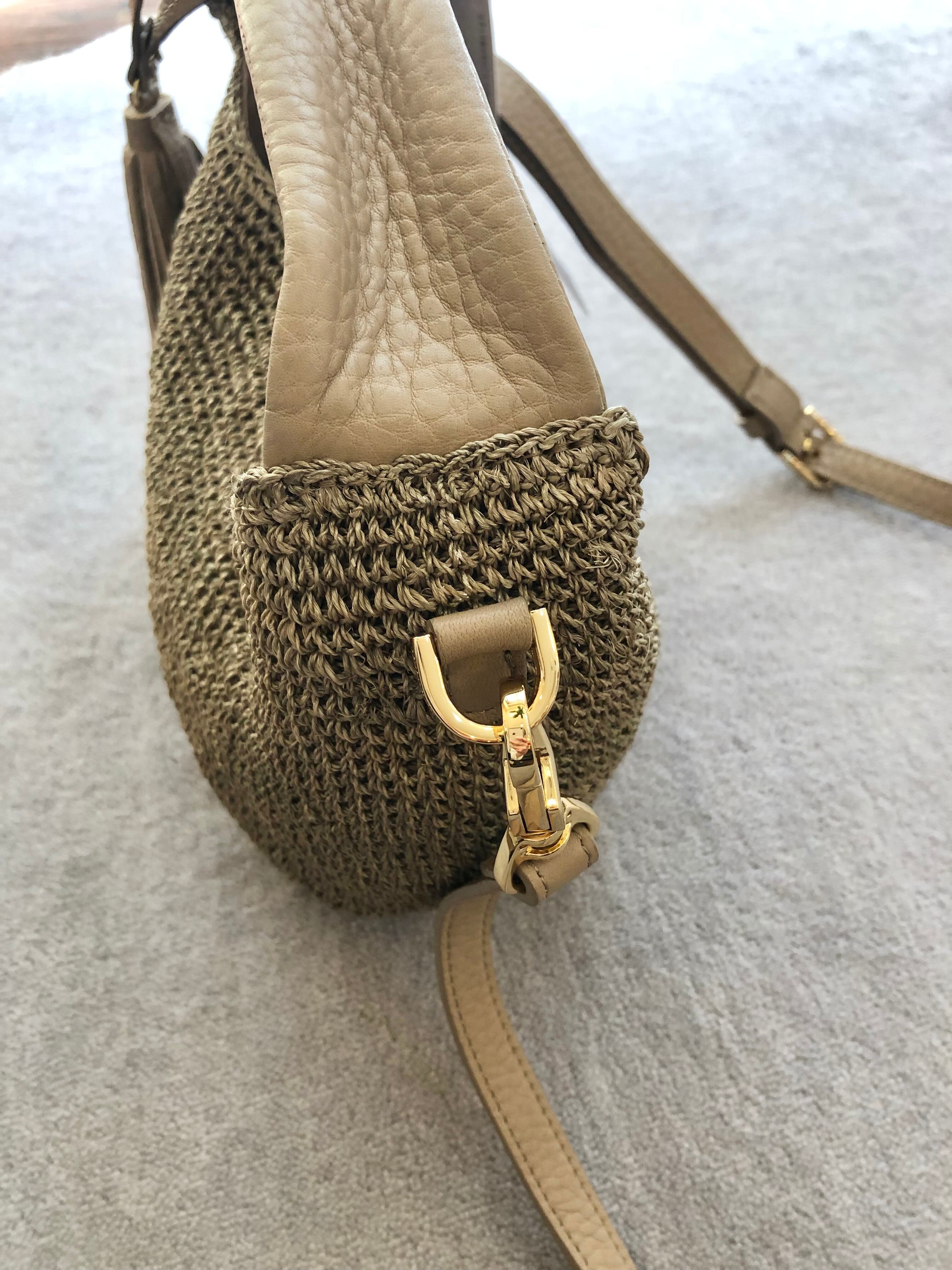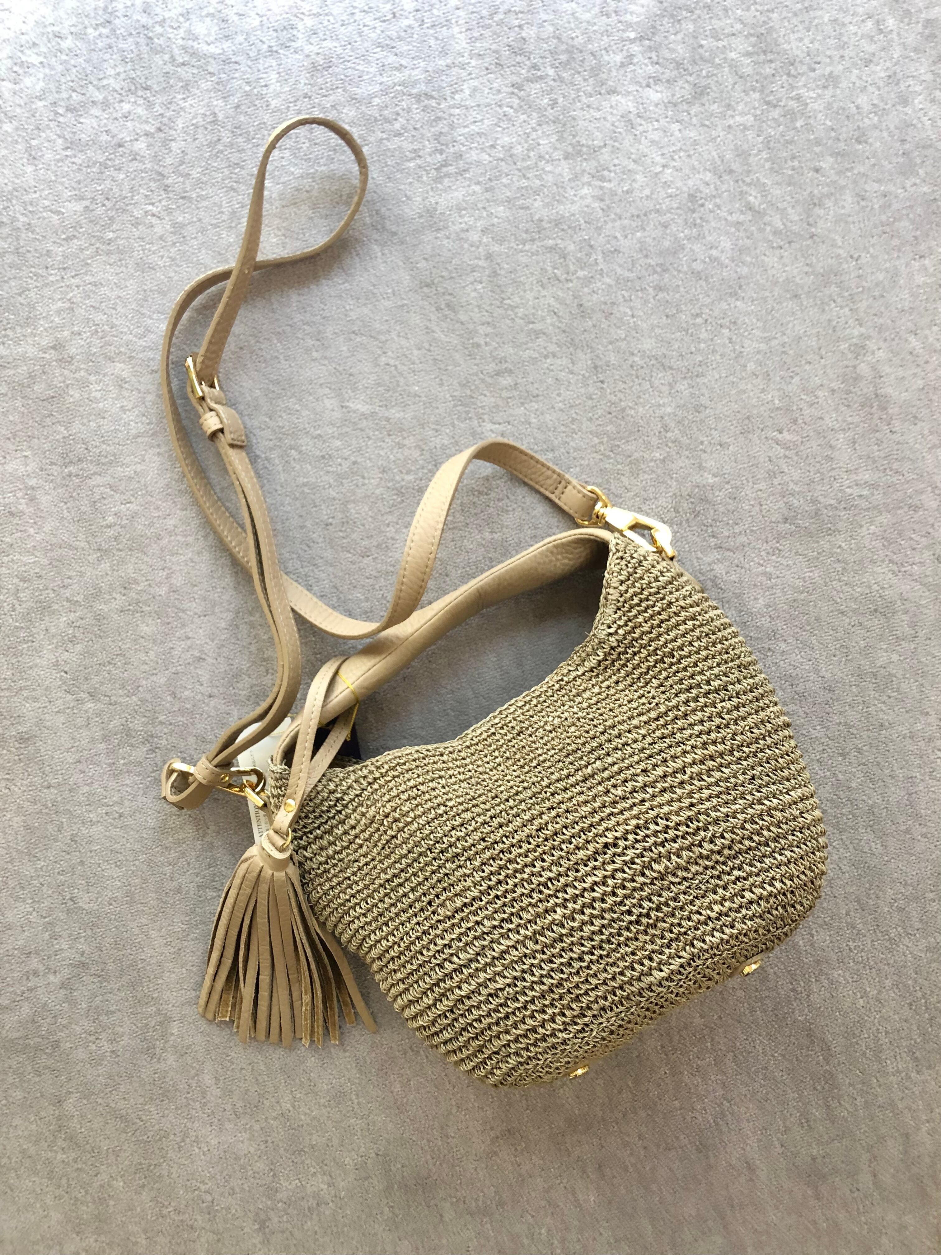 上品なアバカで編み上げたボディにレザーハンドルがついたカゴバッグ
