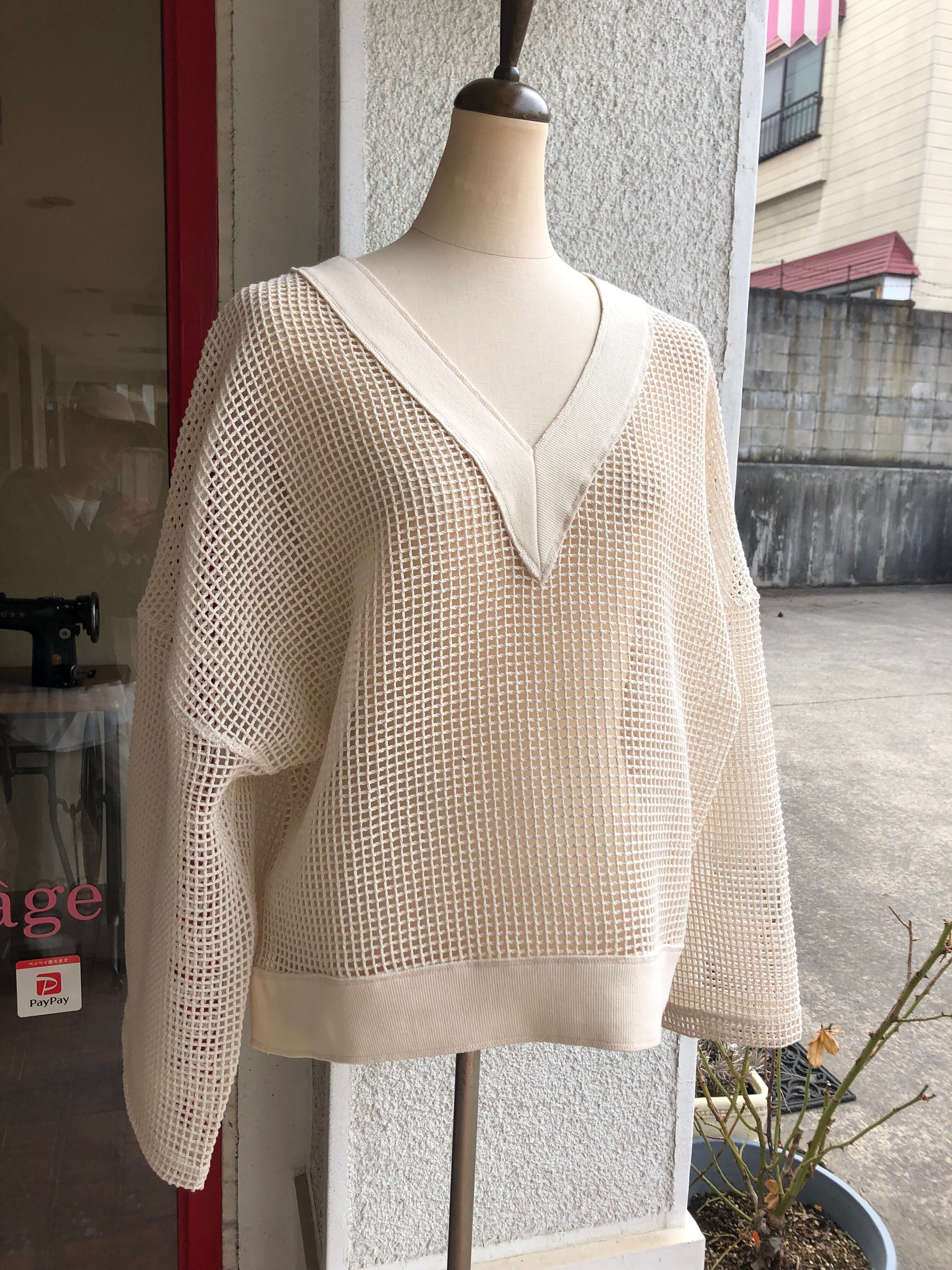 深めのVネック部分、裾の切り替え部分はカットソー生地になので、カジュアルな雰囲気に