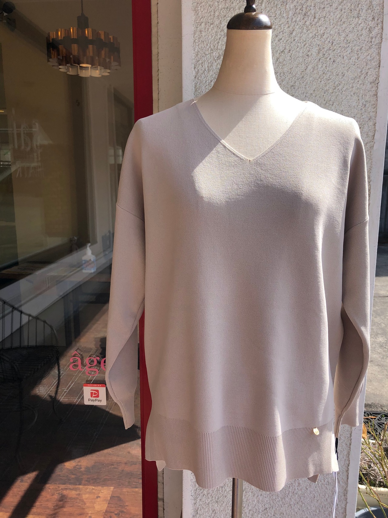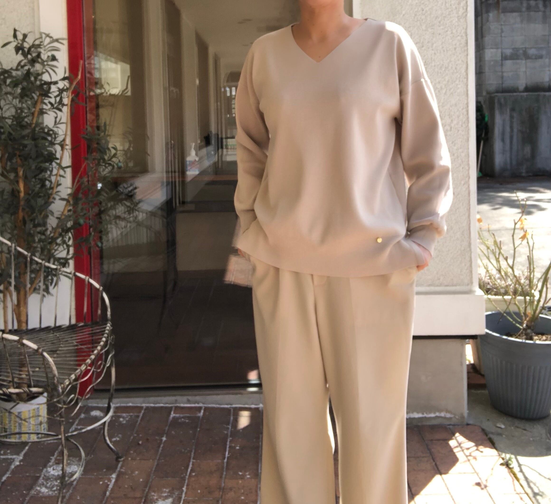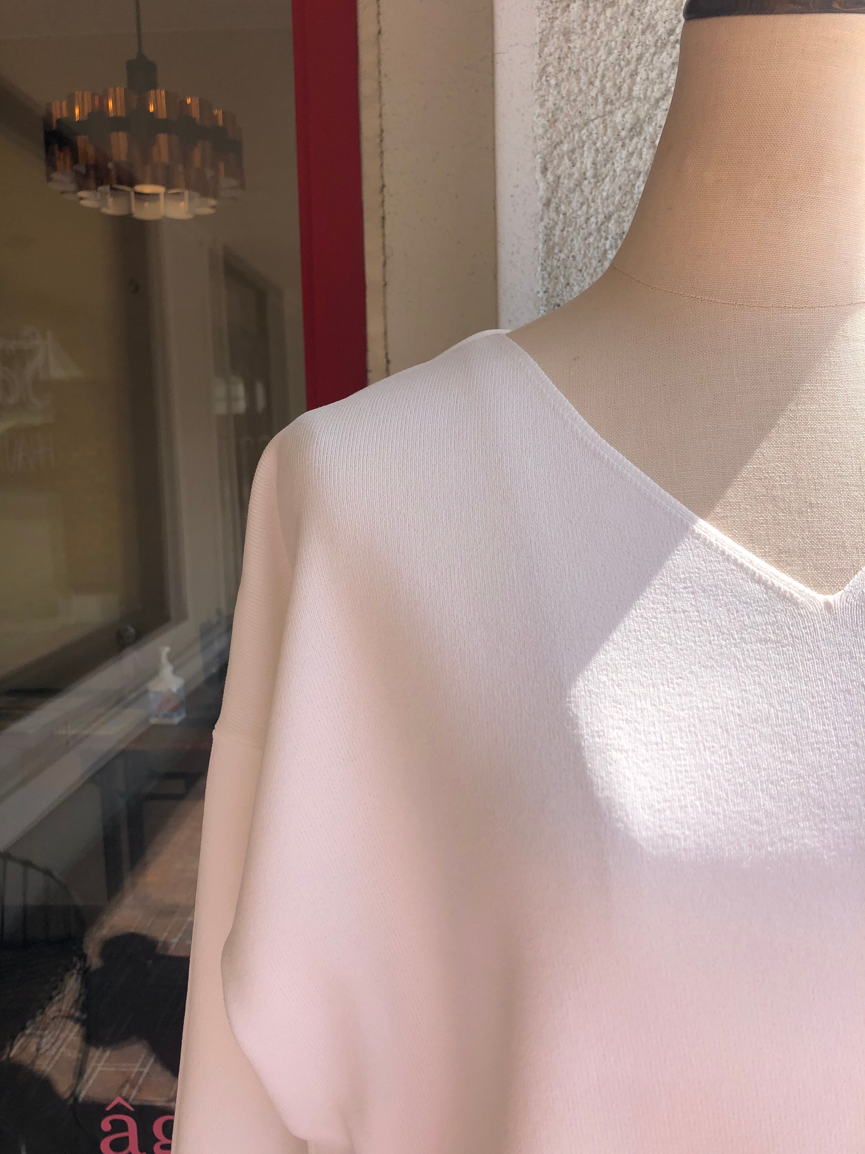 型崩れもしにくく、身体のラインを拾いにくいサーブルストレッチ糸を使用したV襟プルオーバー