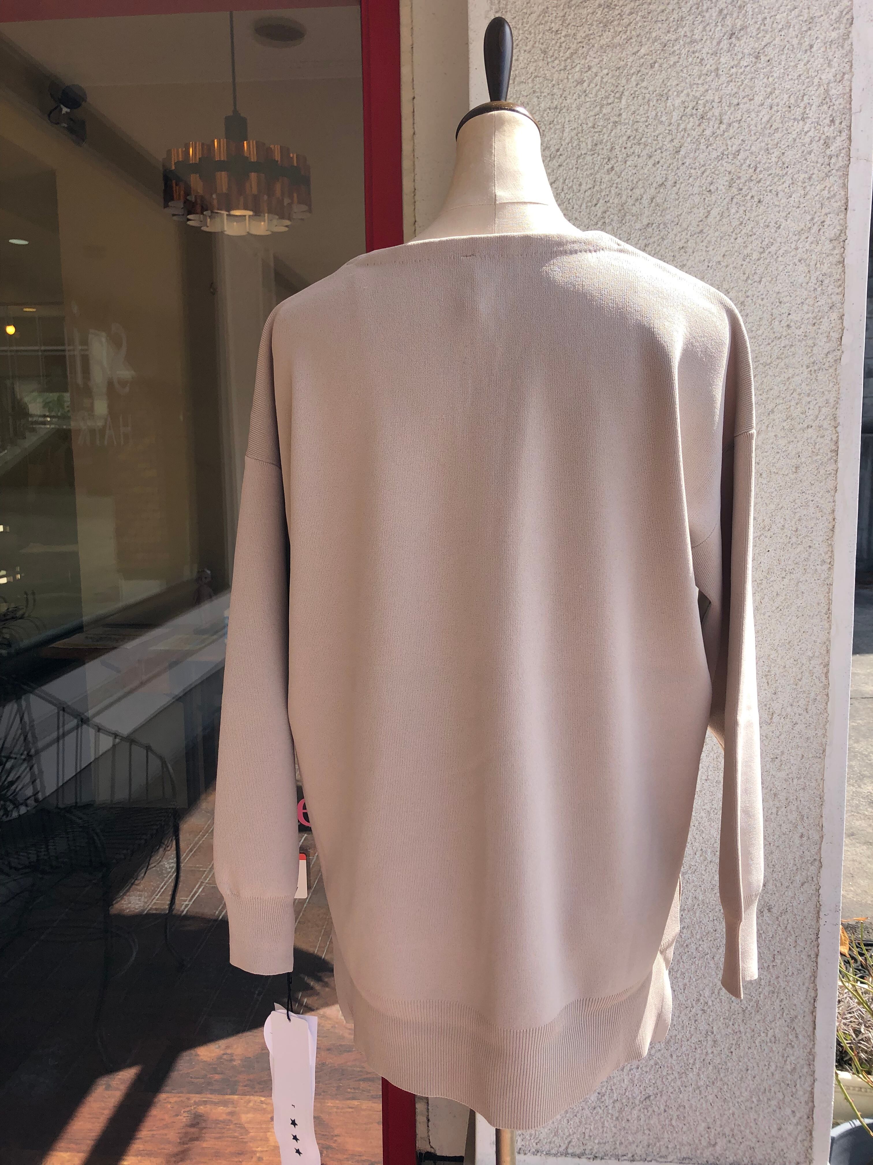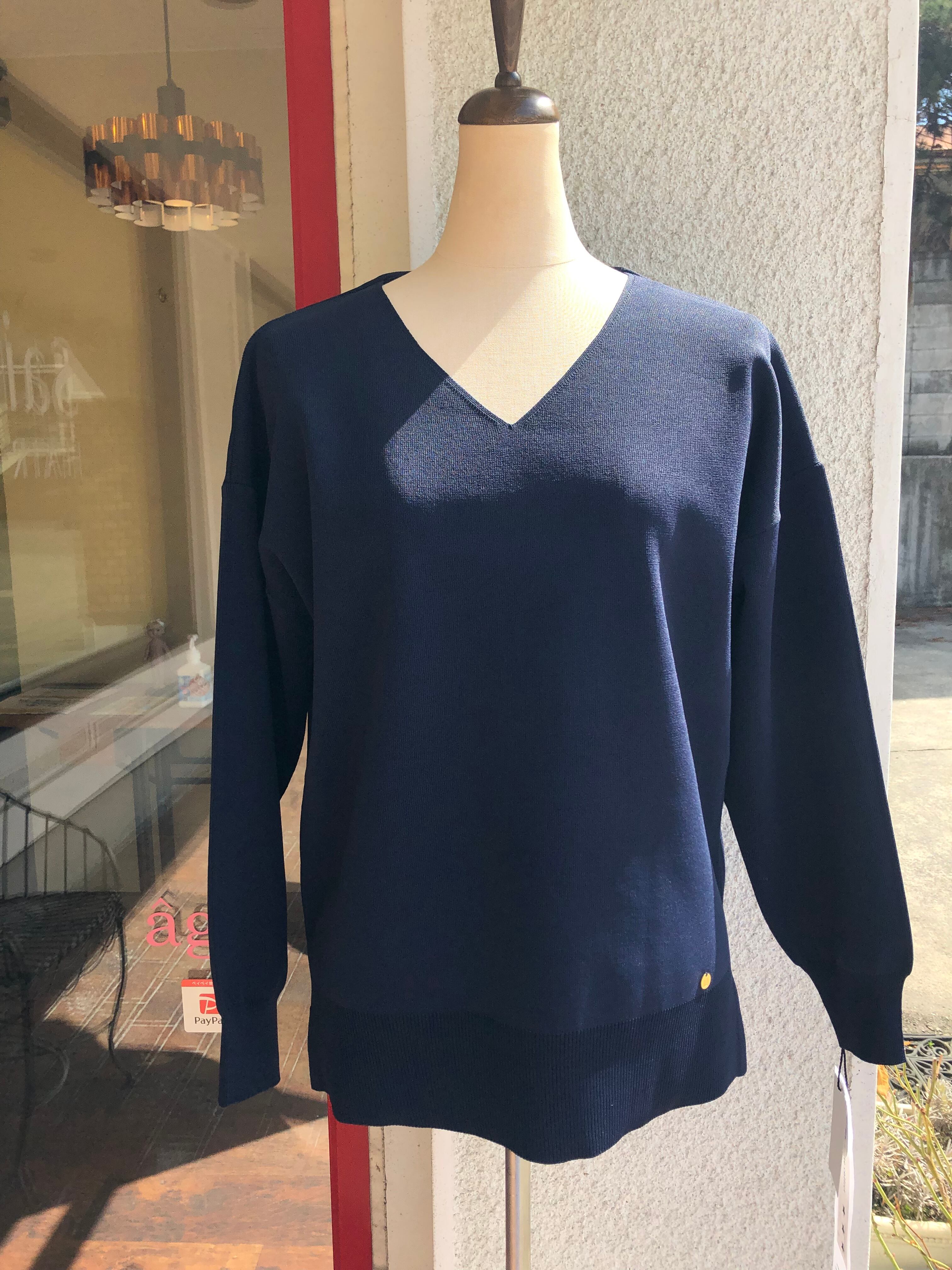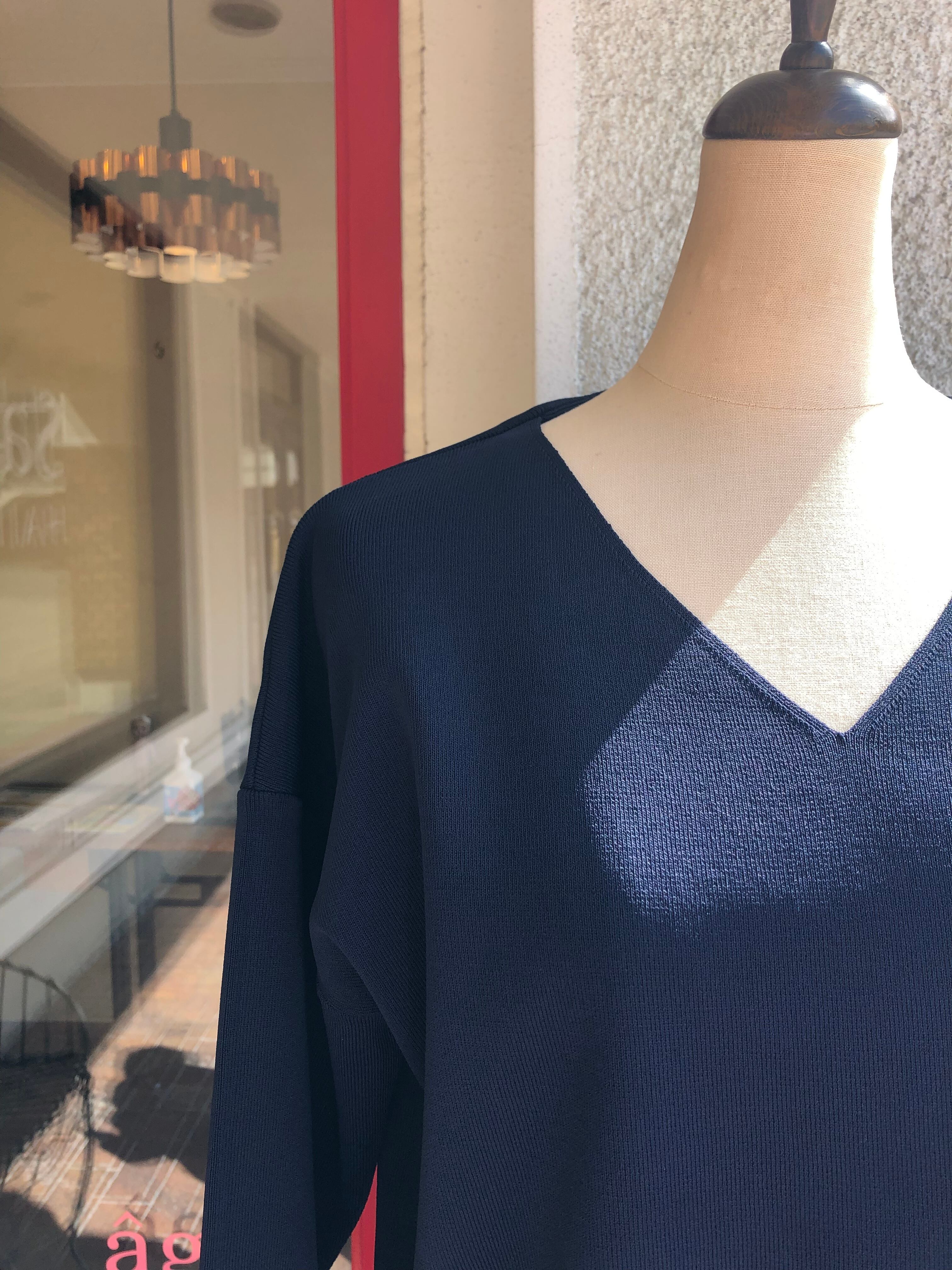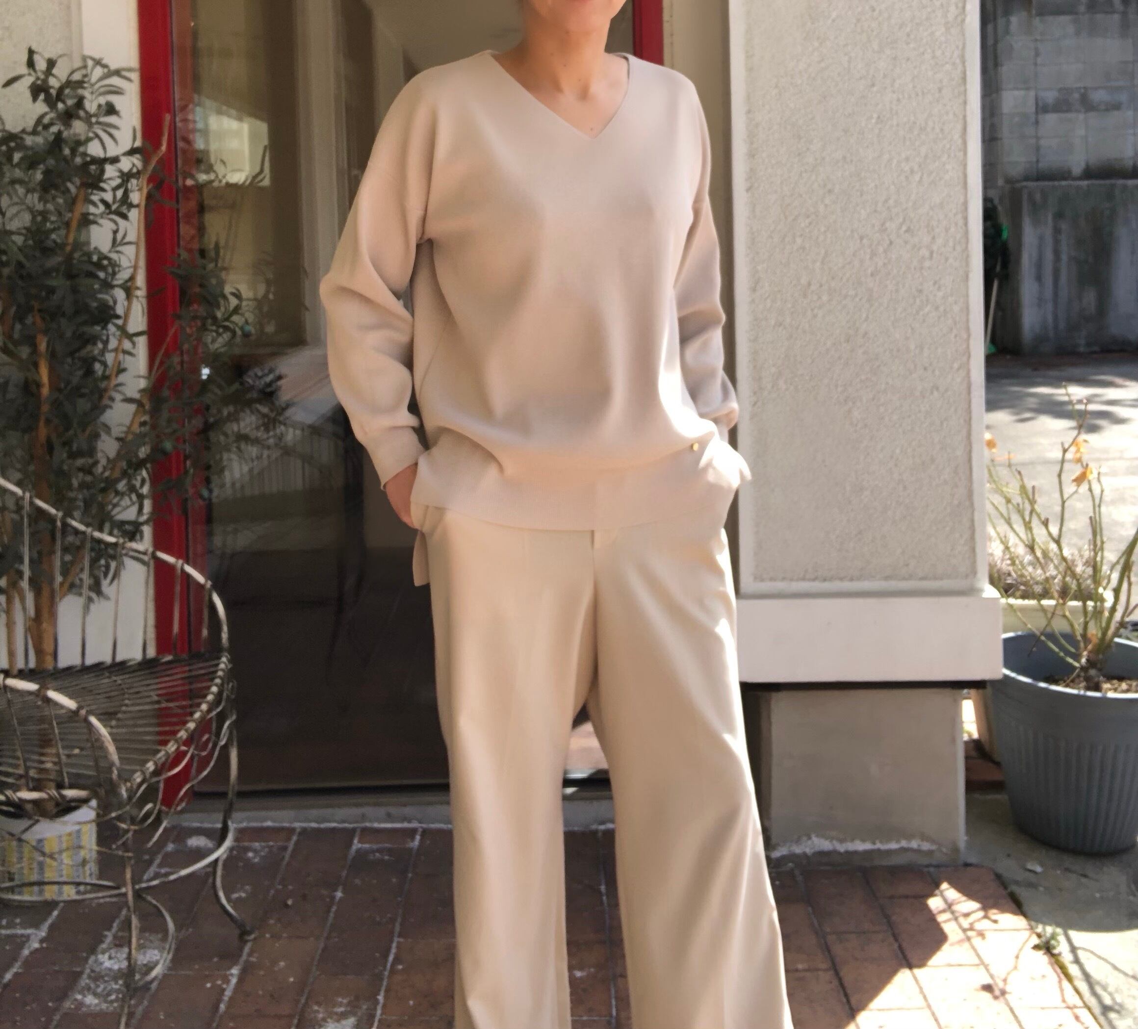 型崩れもしにくく、身体のラインを拾いにくいサーブルストレッチ糸を使用したV襟プルオーバー